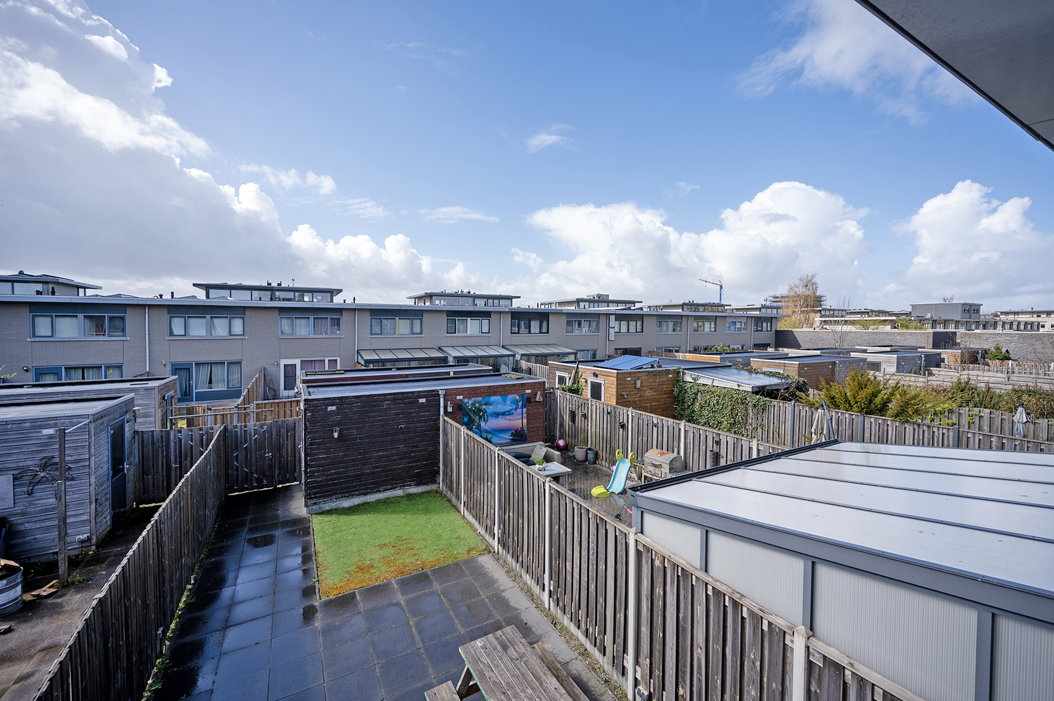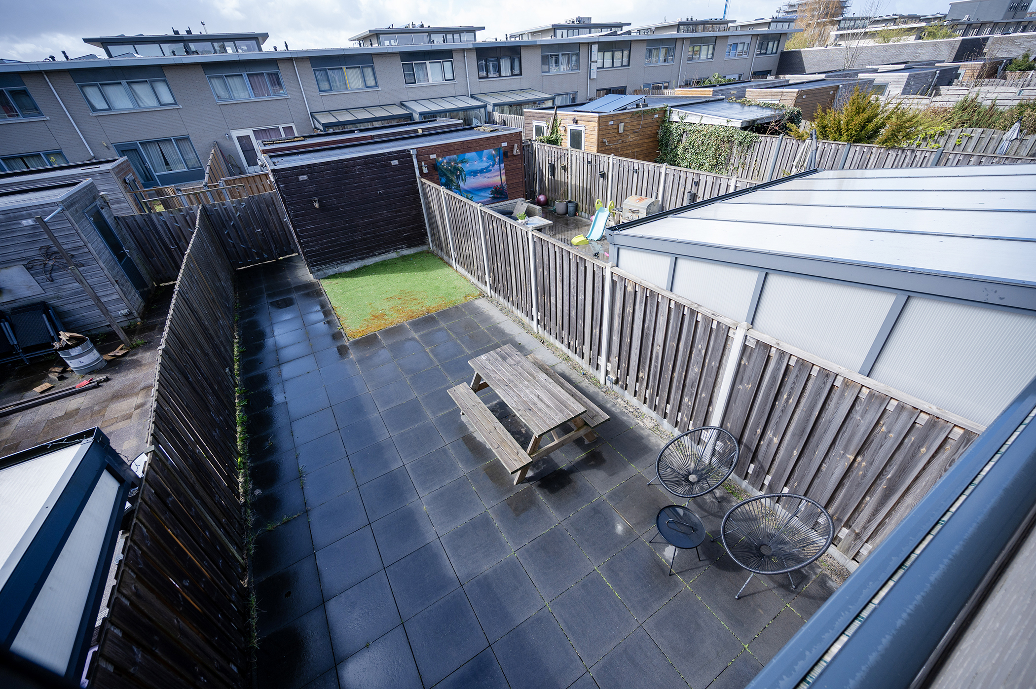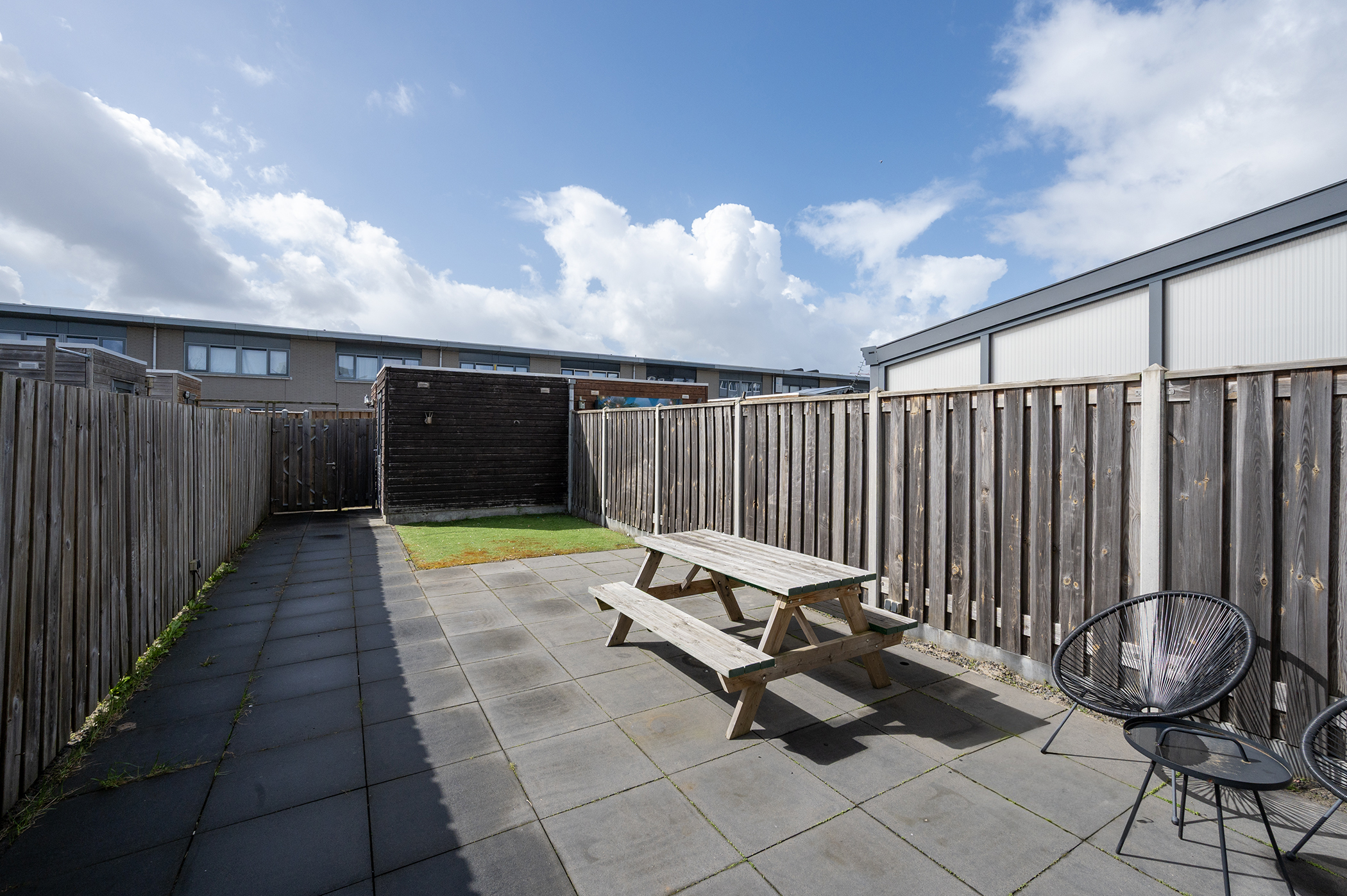 De achtertuin is gunstig gelegen op het zuidwesten, waardoor u de hele middag en avond kunt genieten van de zon. Dit maakt het een fijne plek om te ontspannen of buiten te zitten op mooie dagen. De tuin is volledig betegeld en daardoor onderhoudsvriendelijk. Er is voldoende ruimte voor het plaatsen van een zithoek of eettafel. Achterin bevindt zich een houten berging, ideaal voor extra opslag. Daarnaast beschikt de tuin over een praktische achterom, wat zorgt voor extra gemak en bereikbaarheid.