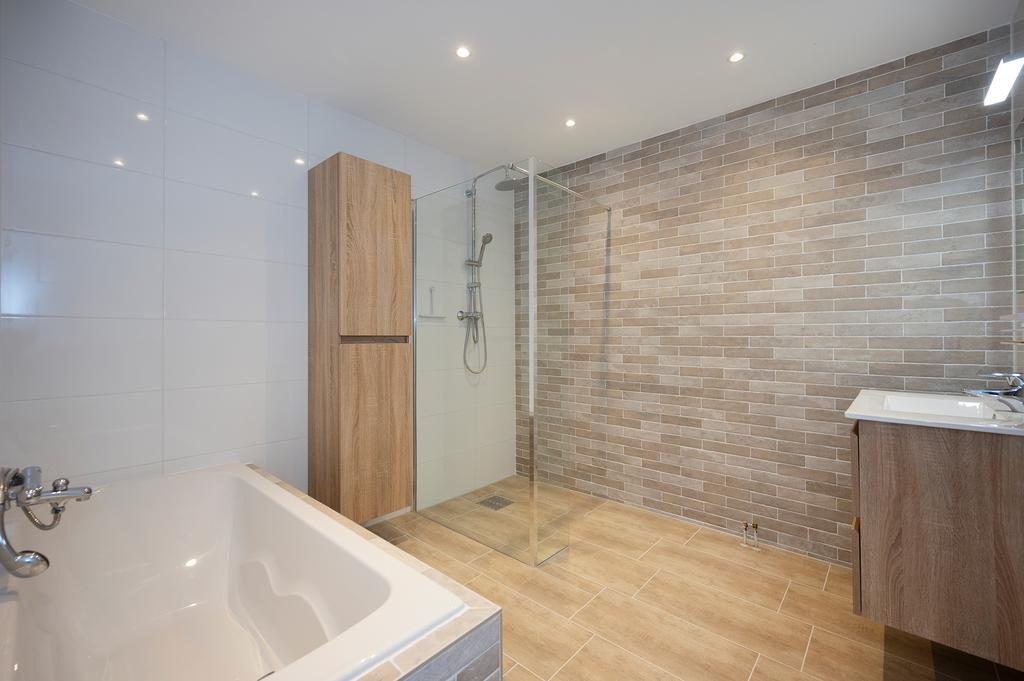 De moderne badkamer is uitgerust met een douche, wastafelmeubel en ligbad.