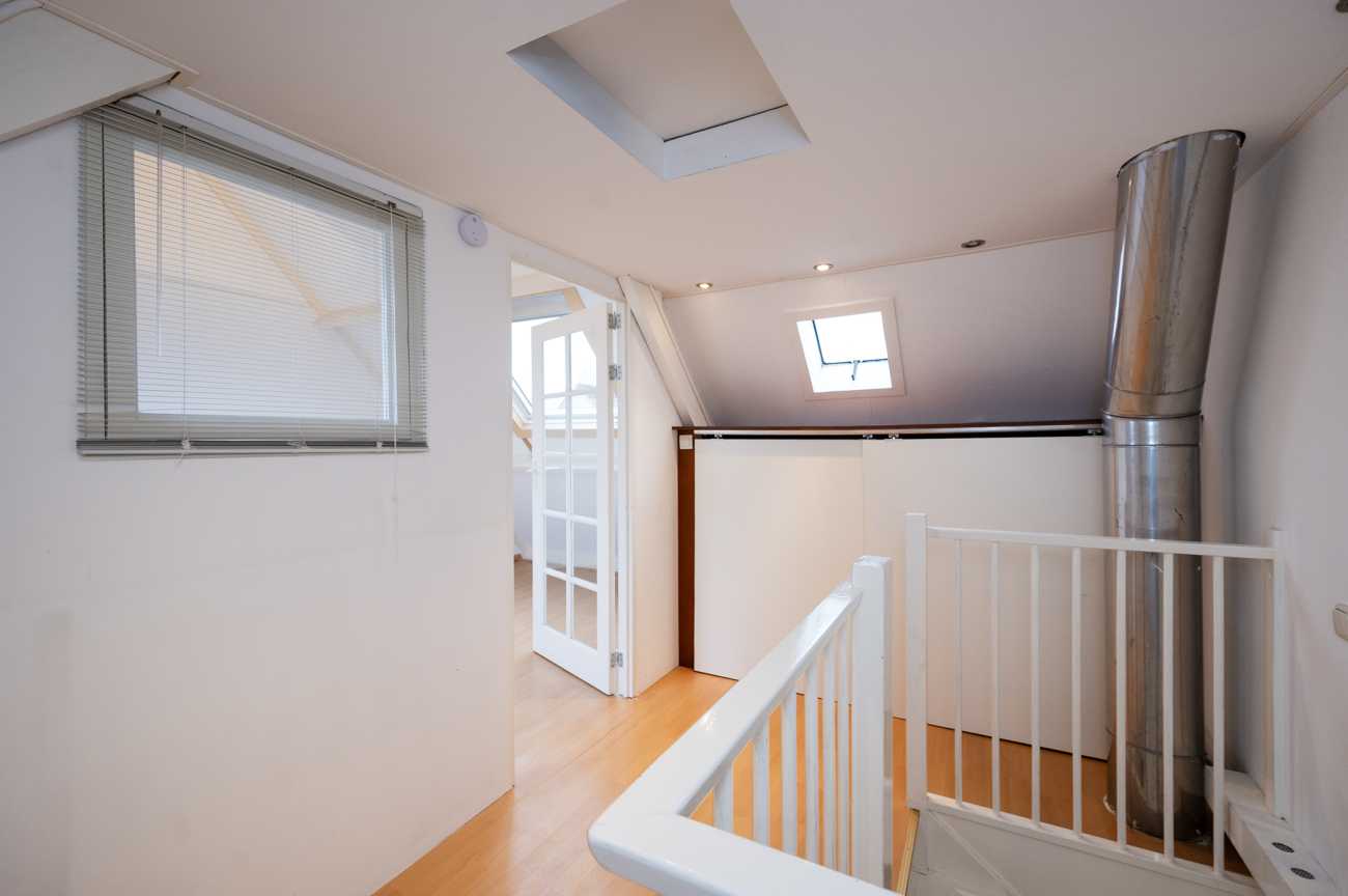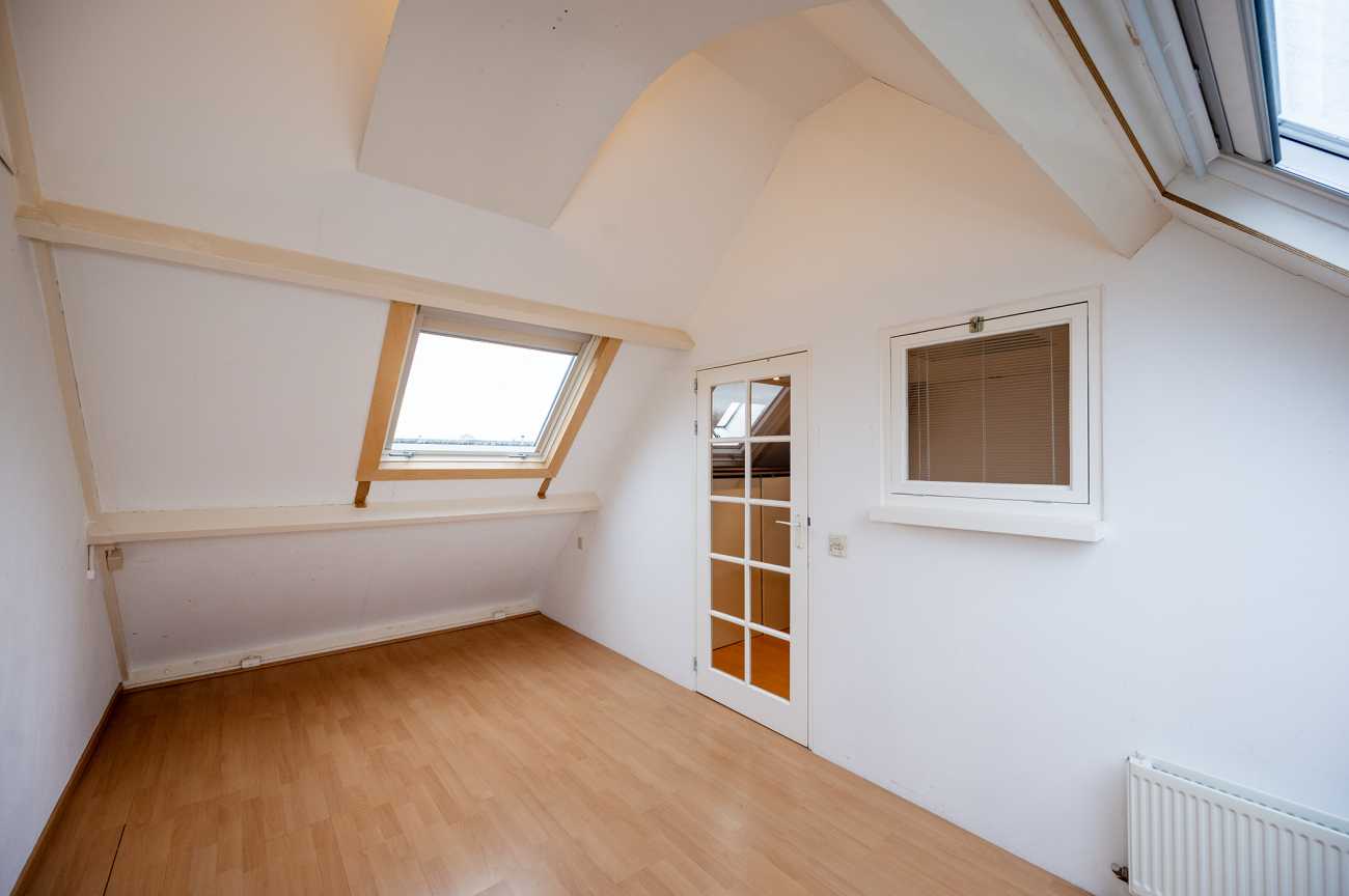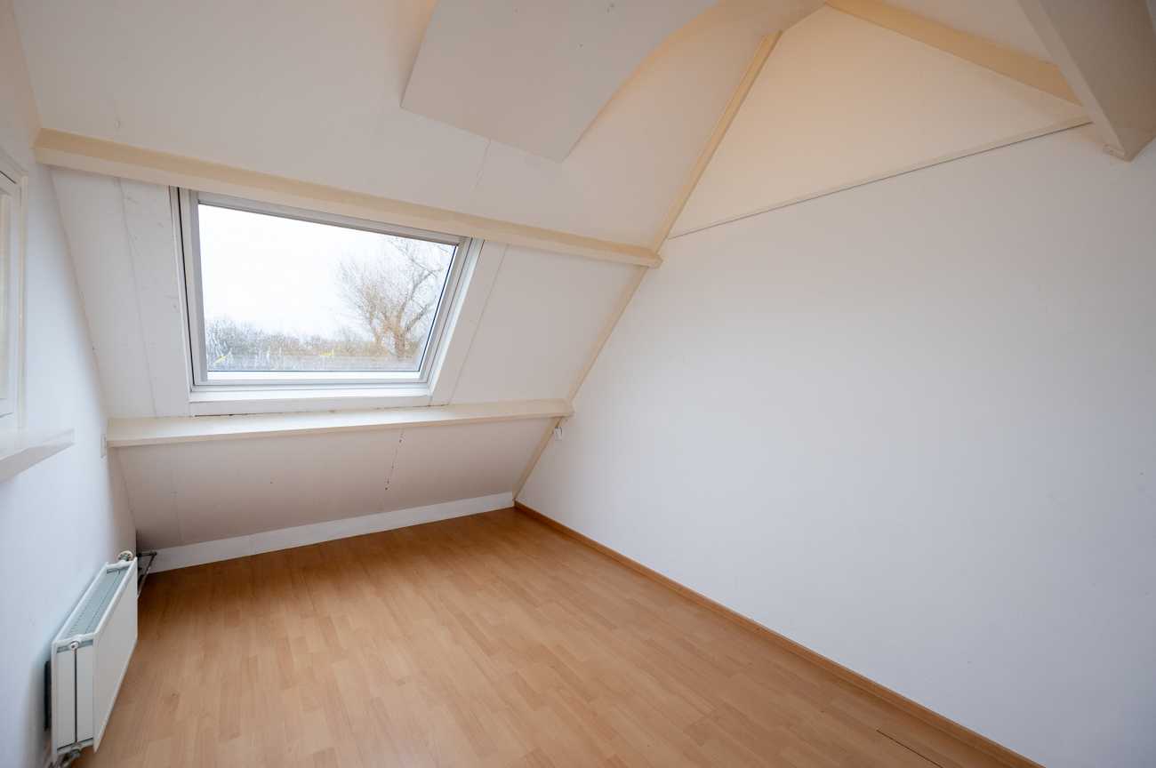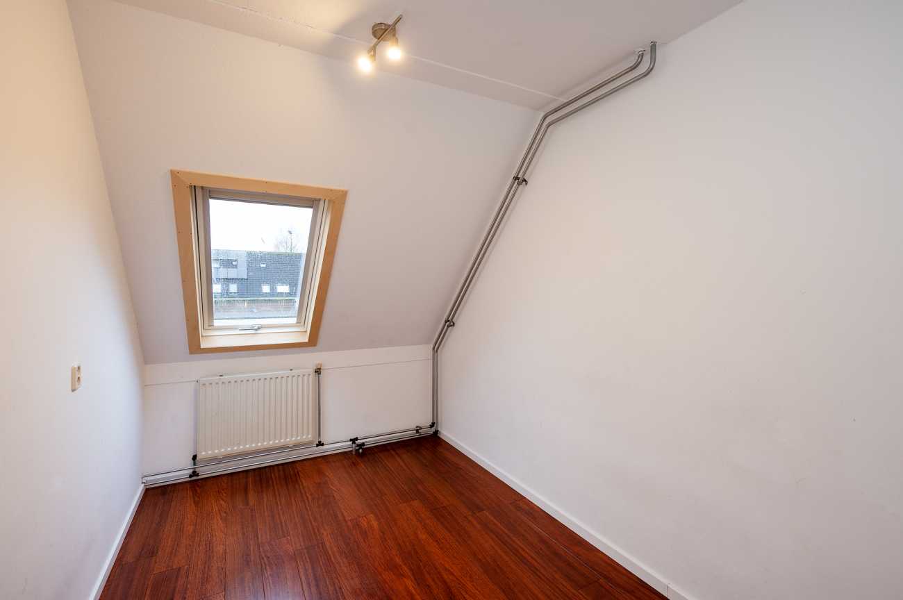 Via een open trap bereikt u de tweede verdieping met een voorzolder, waar zich de aansluitingen voor wasmachine en droger bevinden. Daarnaast is hier een ruime vierde slaapkamer met laminaatvloer en dakraam aan de voorzijde – van de woning, ideaal als slaapkamer, werkkamer of hobbyruimte.