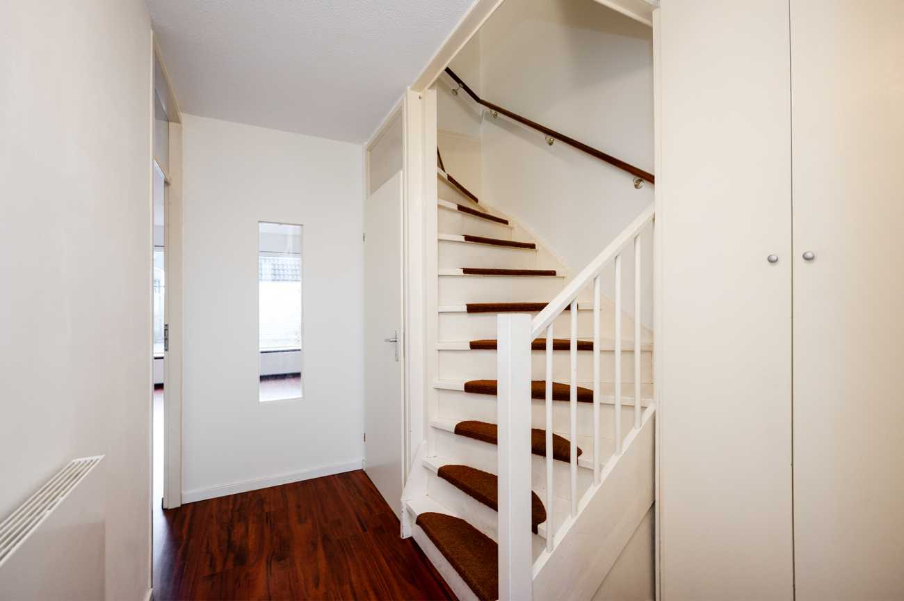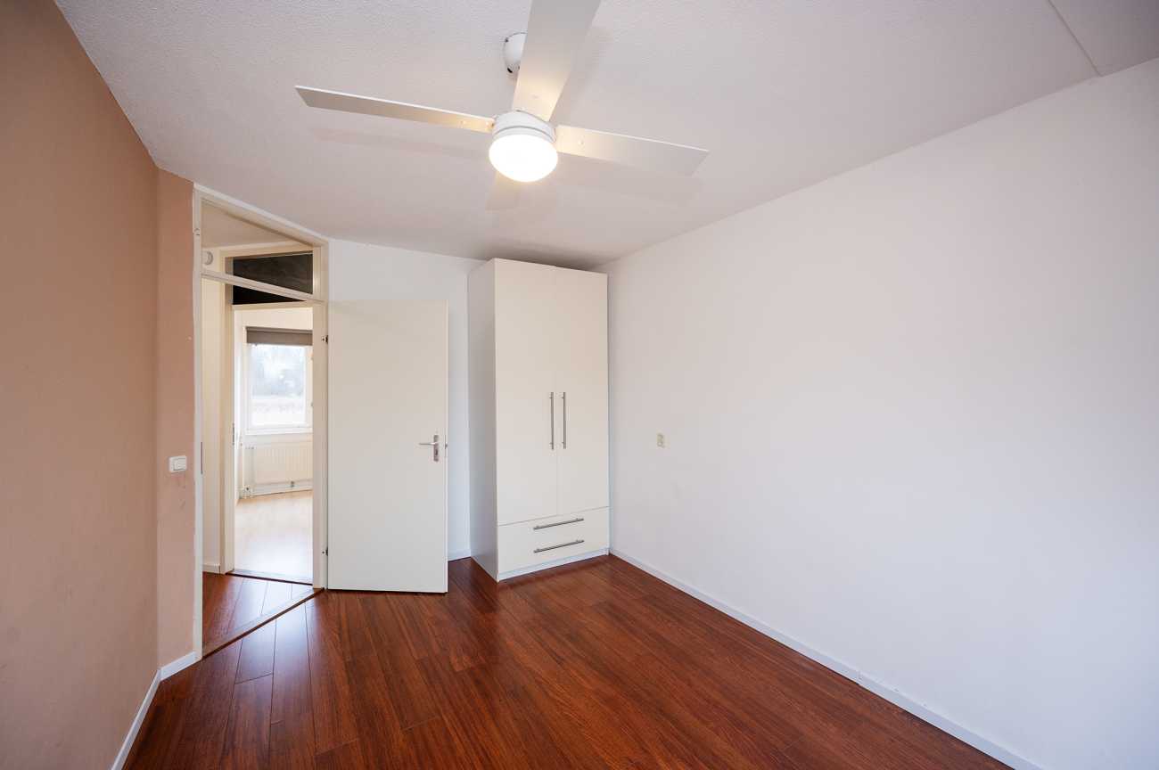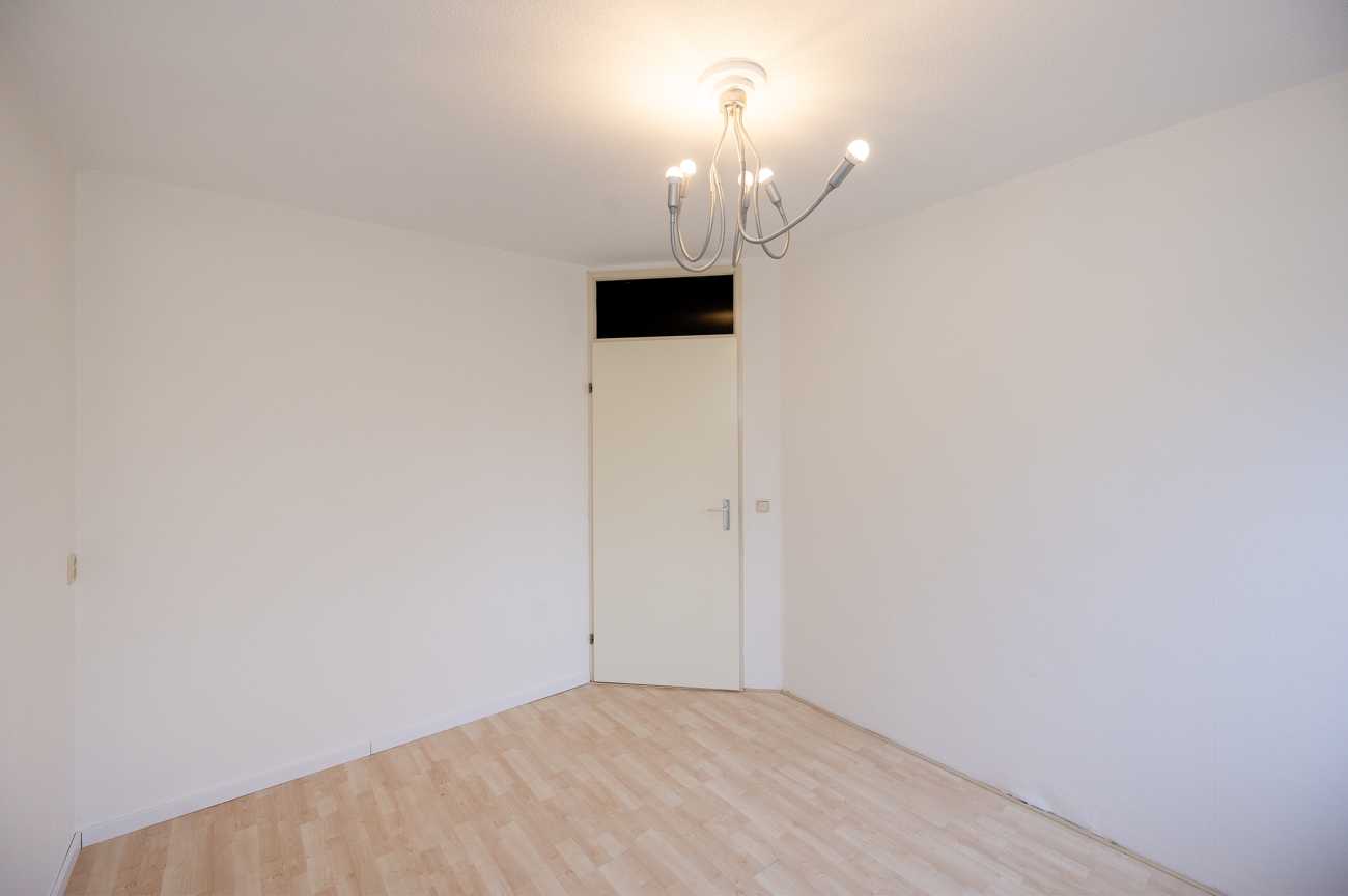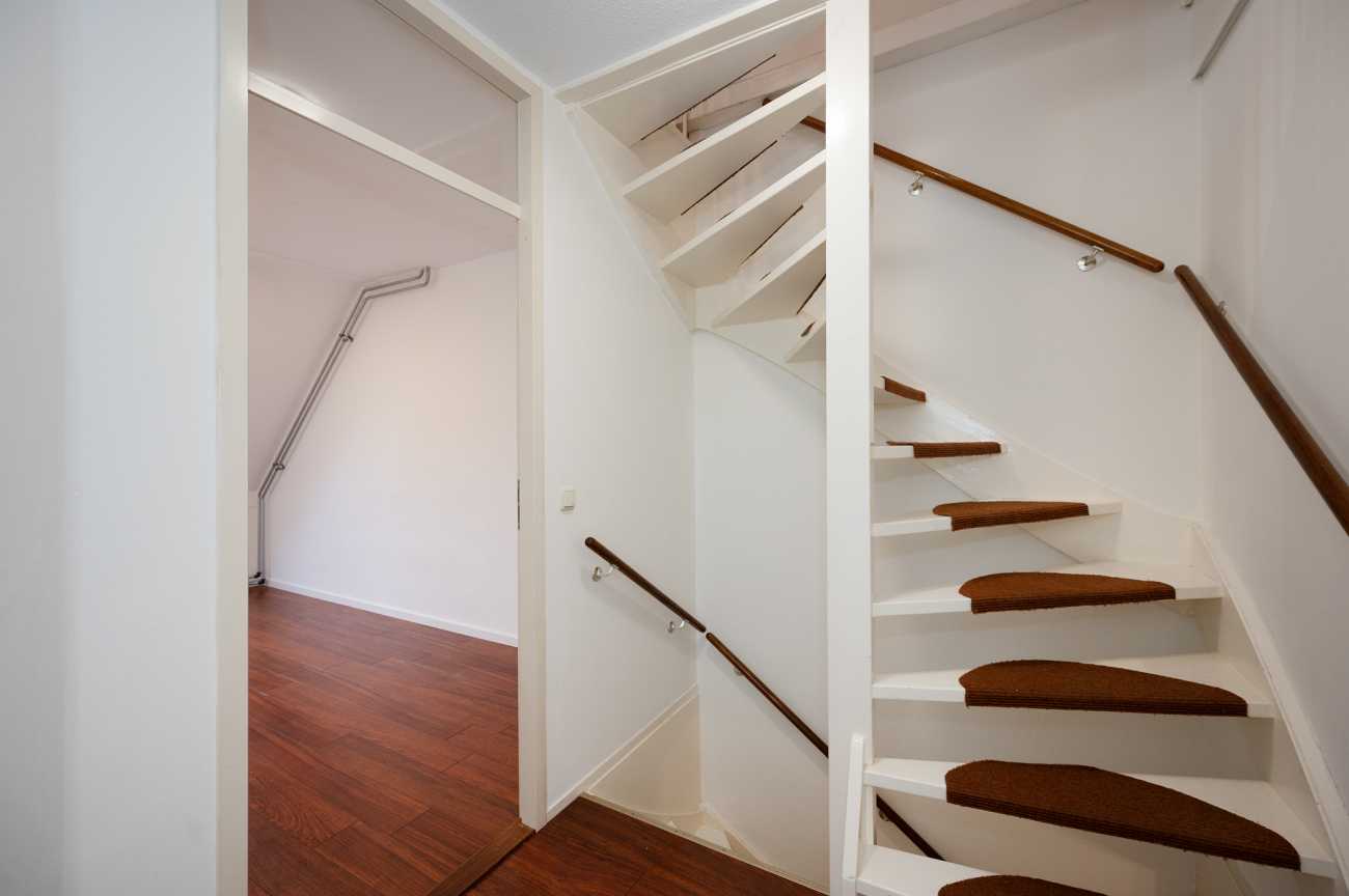 Via een open trap bereikt u de tweede verdieping met een voorzolder, waar zich de aansluitingen voor wasmachine en droger bevinden. Daarnaast is hier een ruime vierde slaapkamer met laminaatvloer en dakraam aan de voorzijde – van de woning, ideaal als slaapkamer, werkkamer of hobbyruimte.