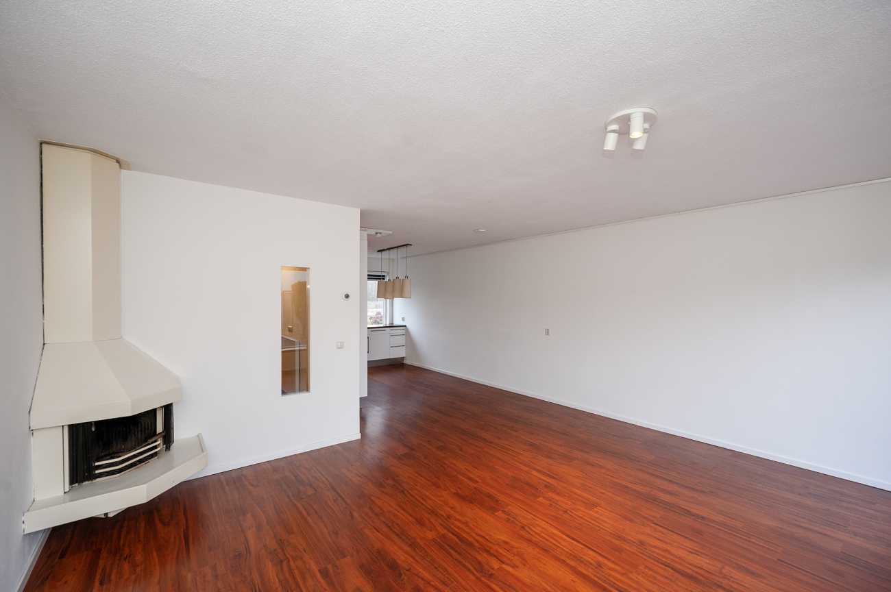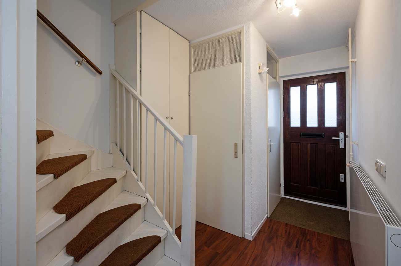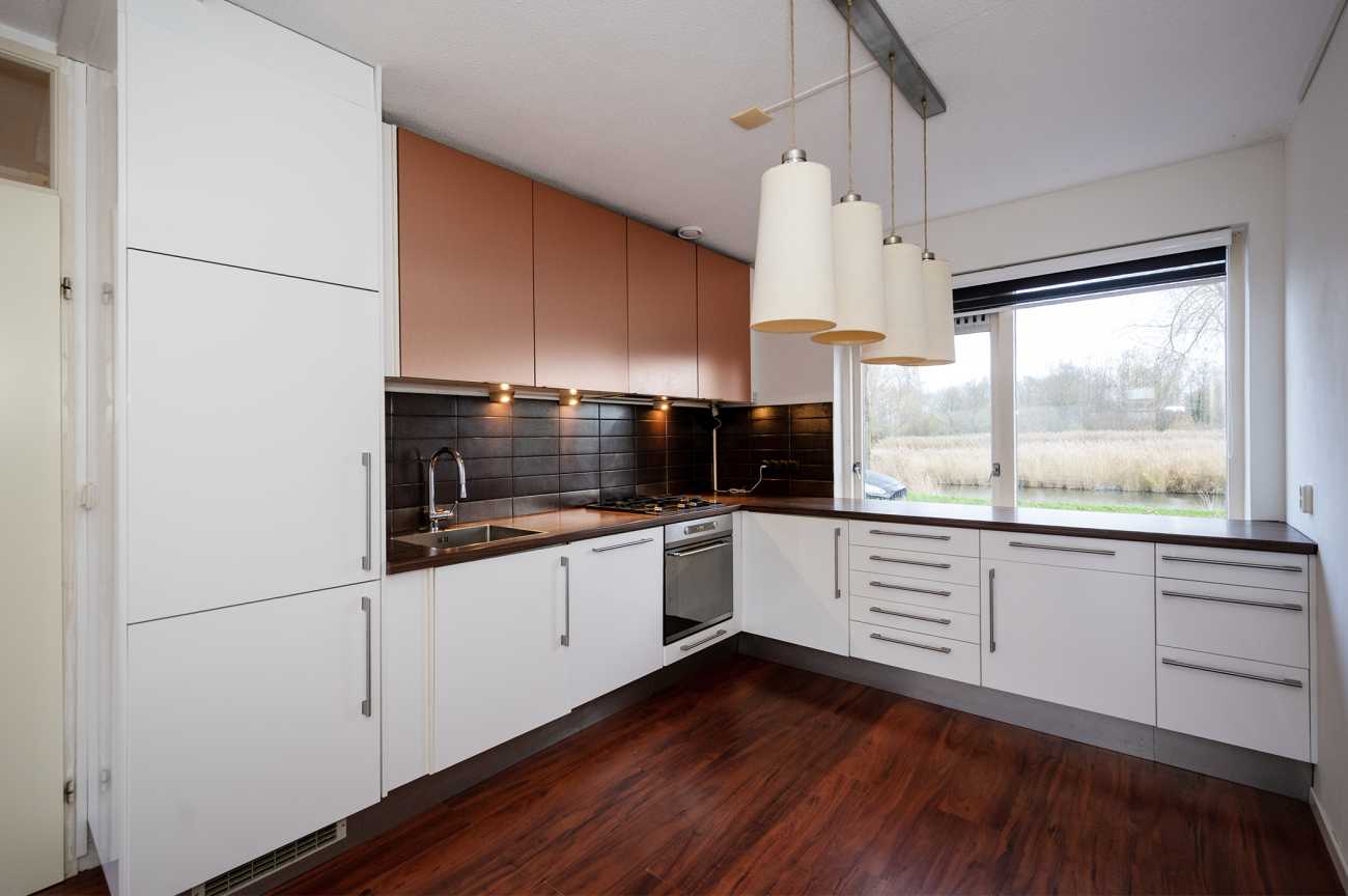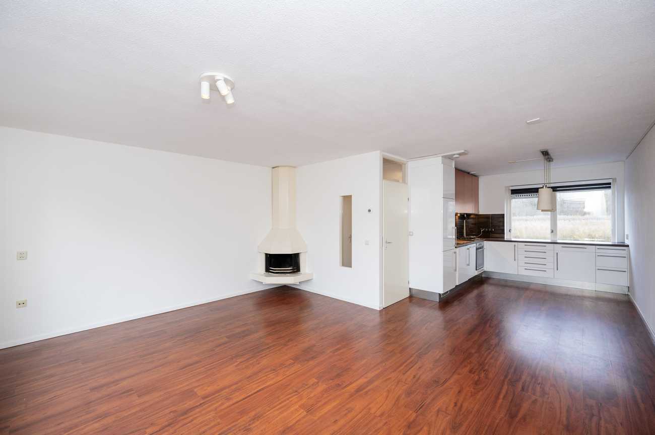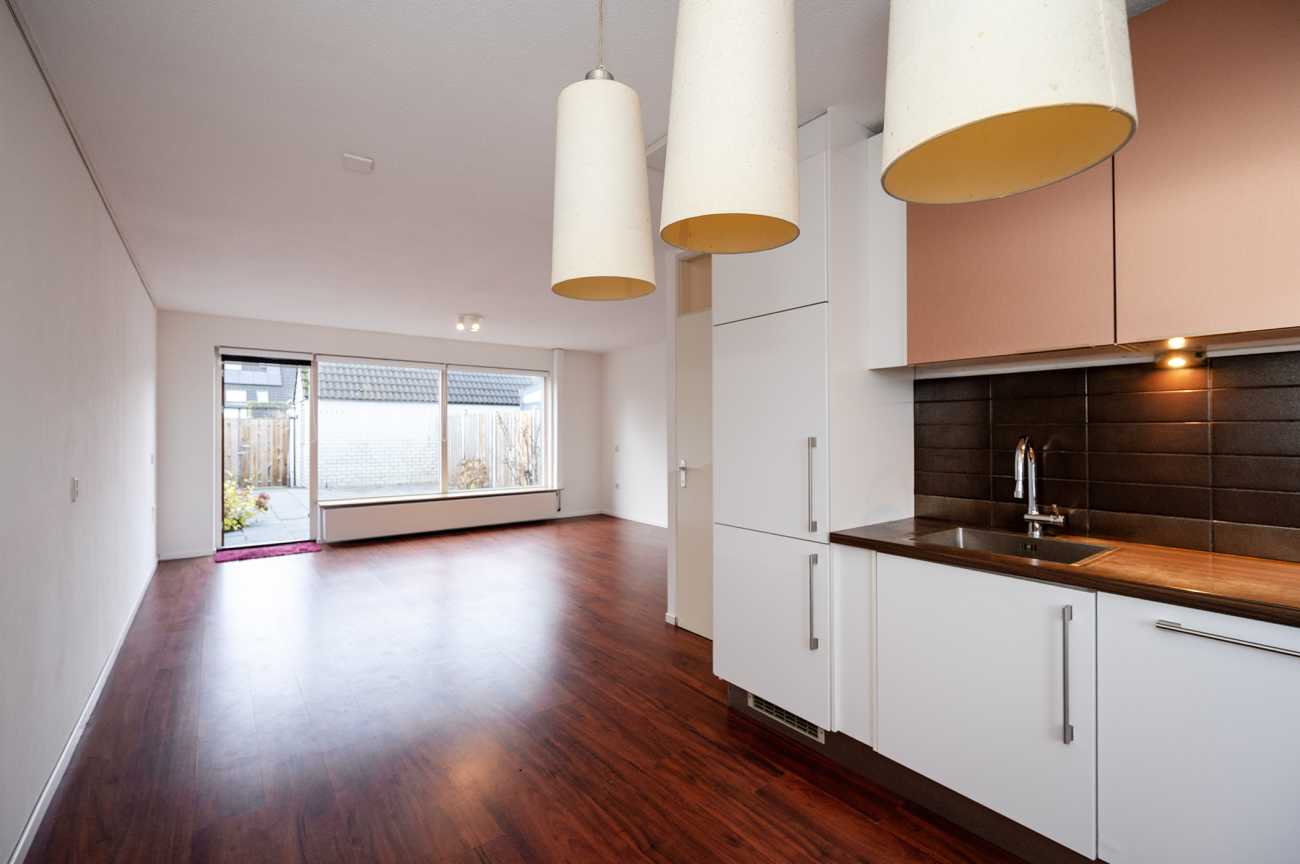 Aan de voorzijde van de woning bevindt zich de keuken in L-opstelling, voorzien van diverse inbouwapparatuur zoals een vaatwasser, oven, koelkast en vriezer. De praktische trapkast onder de gesloten trap biedt extra bergruimte.