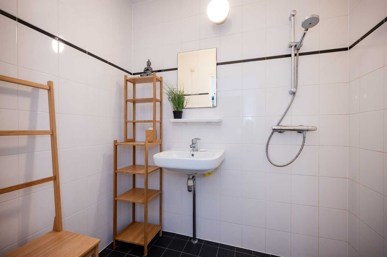 De badkamer is netjes afgewerkt en voorzien van een inloopdouche en wastafel. Daarnaast is er een separaat toilet.