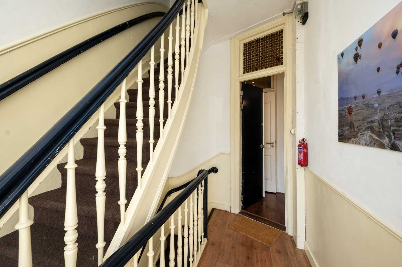 Via het gemeenschappelijke trappenhuis bereik je de entree van de woning op de tweede verdieping. Je komt binnen in een hal met een separaat toilet en fonteintje.