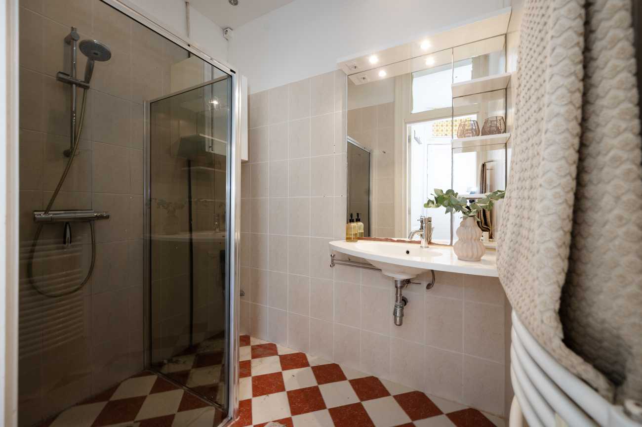 De royale slaapkamer ligt aan de voorzijde van de woning. De badkamer is voorzien van een douche, wastafel, designradiator en aansluitingen voor de wasmachine.
