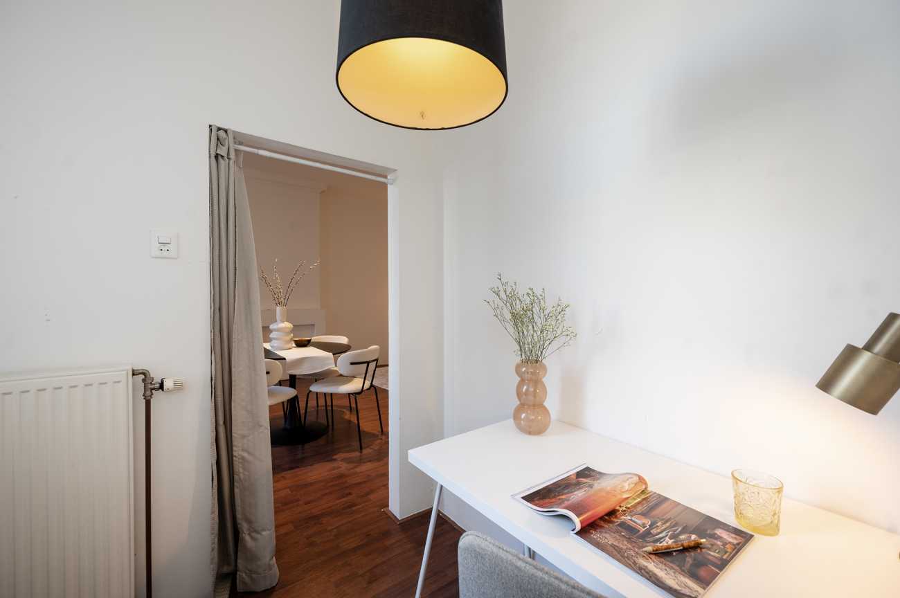 Grenzend aan de woonkamer bevindt zich een extra open kamer met eveneens toegang tot het balkon. Deze ruimte is ideaal te gebruiken als werkplek, eetkamer of bergkamer.