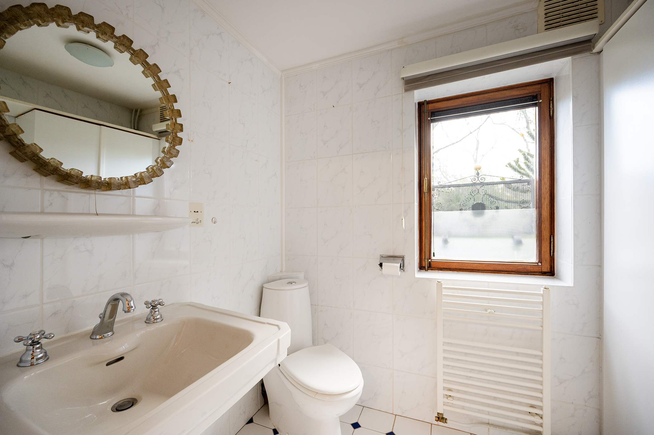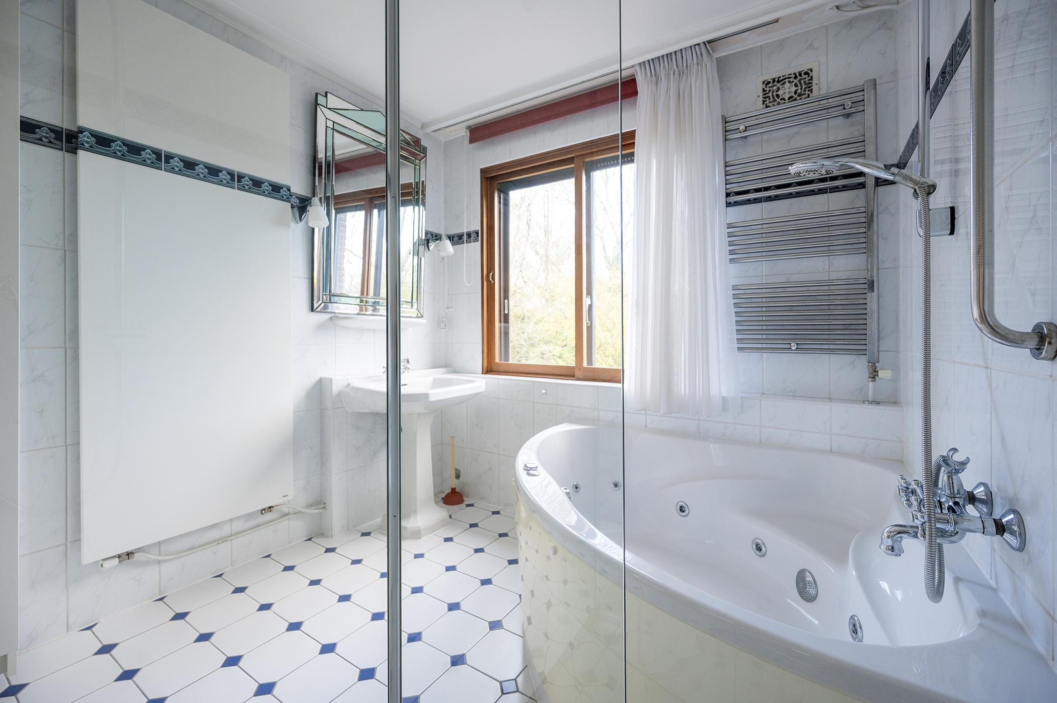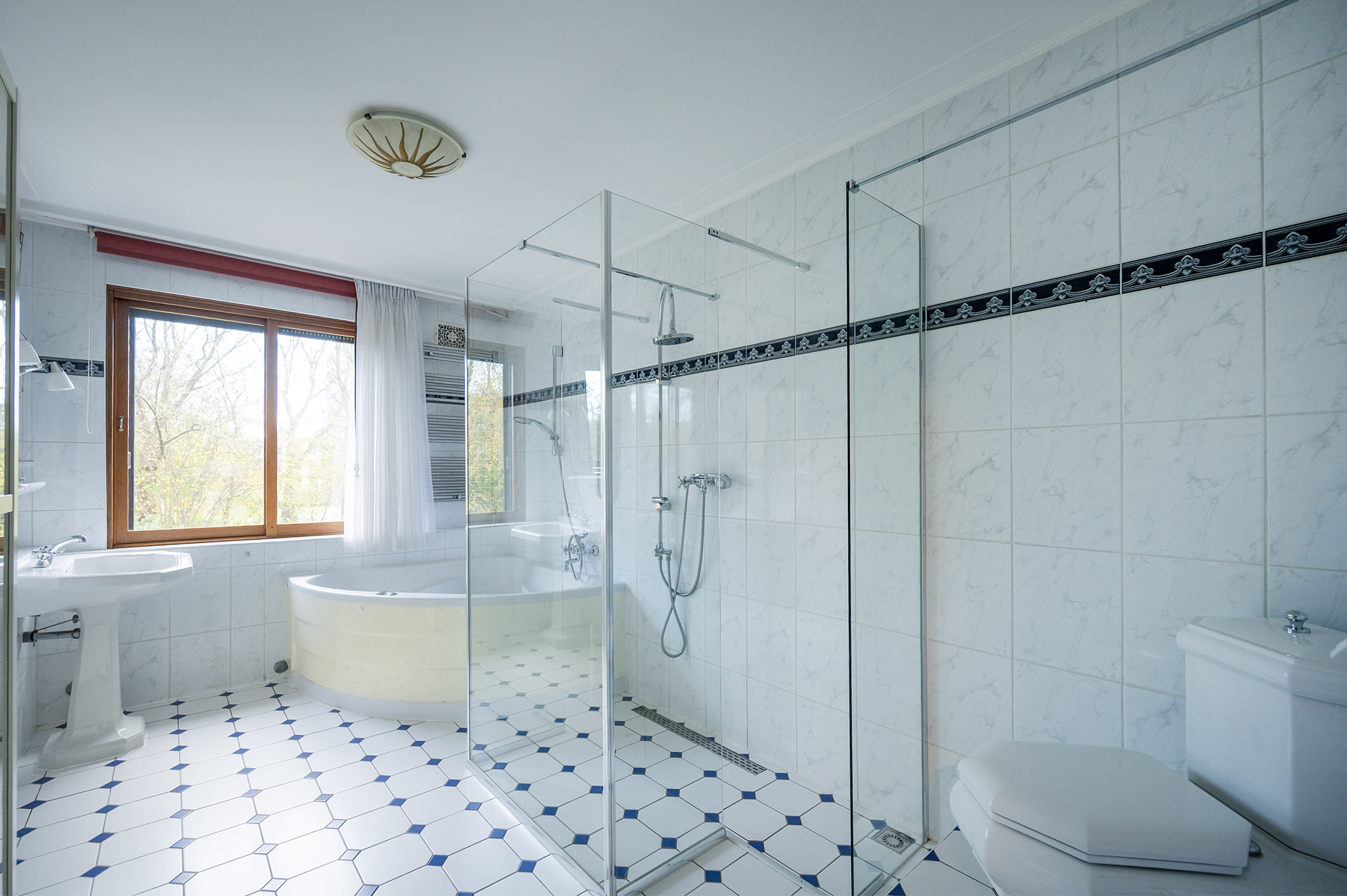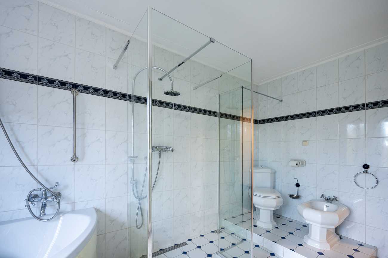Overloop, drie slaapkamers van ca. 14.5/14 en 9.5 m2, waarvan 1 in gebruik is genomen als inloopkast. Er is een ruime klassieke badkamer voorzien van een hoekbad, douche, wastafel, toilet en bidet. Separaat is er een derde toilet met fontein.