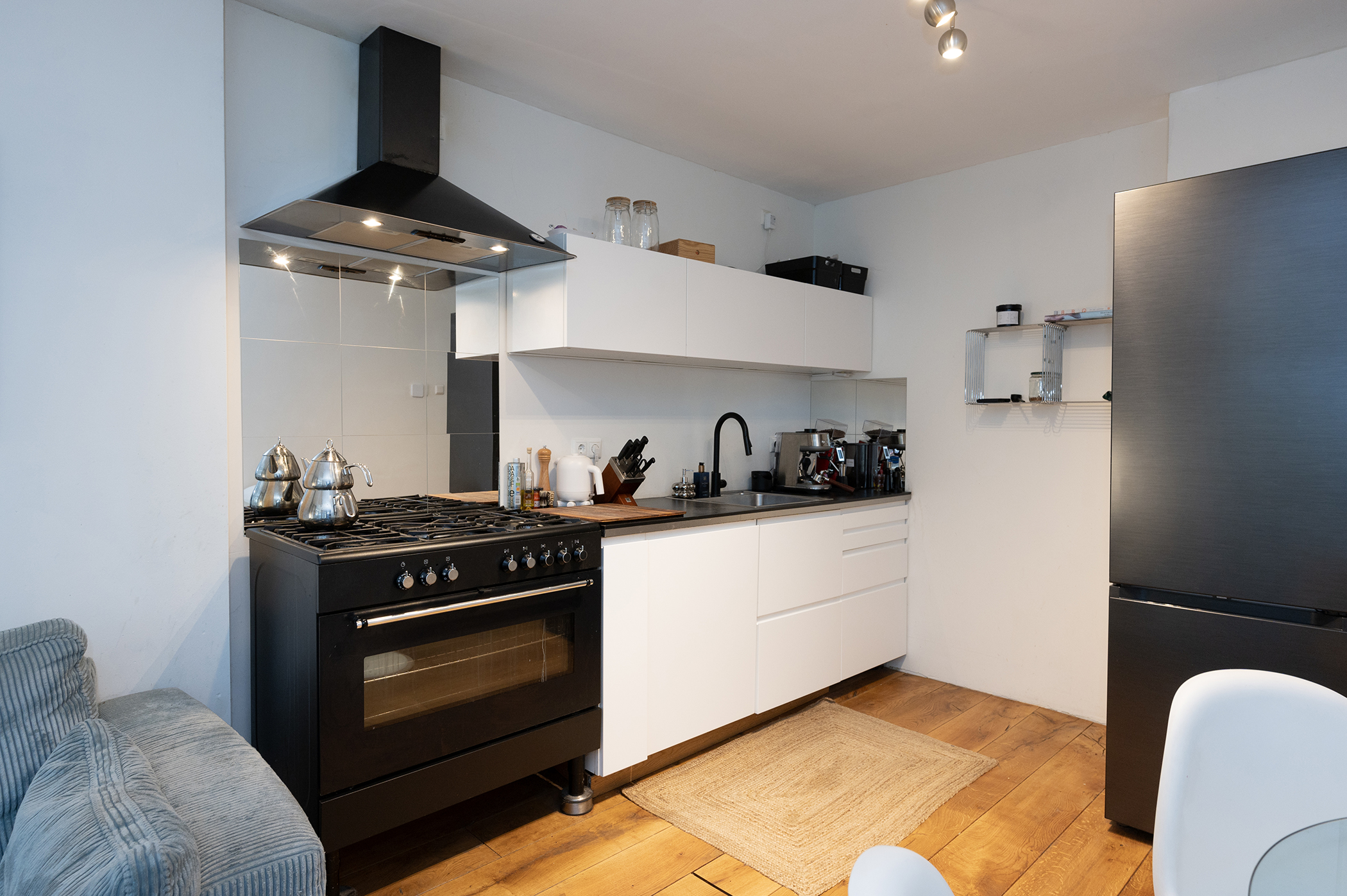 De open keuken is van alle gemakken voorzien. Zo beschikt deze over een gasfornuis, oven, afzuigkap, een aparte koel-vriescombinatie en een inbouwvaatwasser. Daarnaast is er voldoende opbergruimte voor al uw keukengerei.