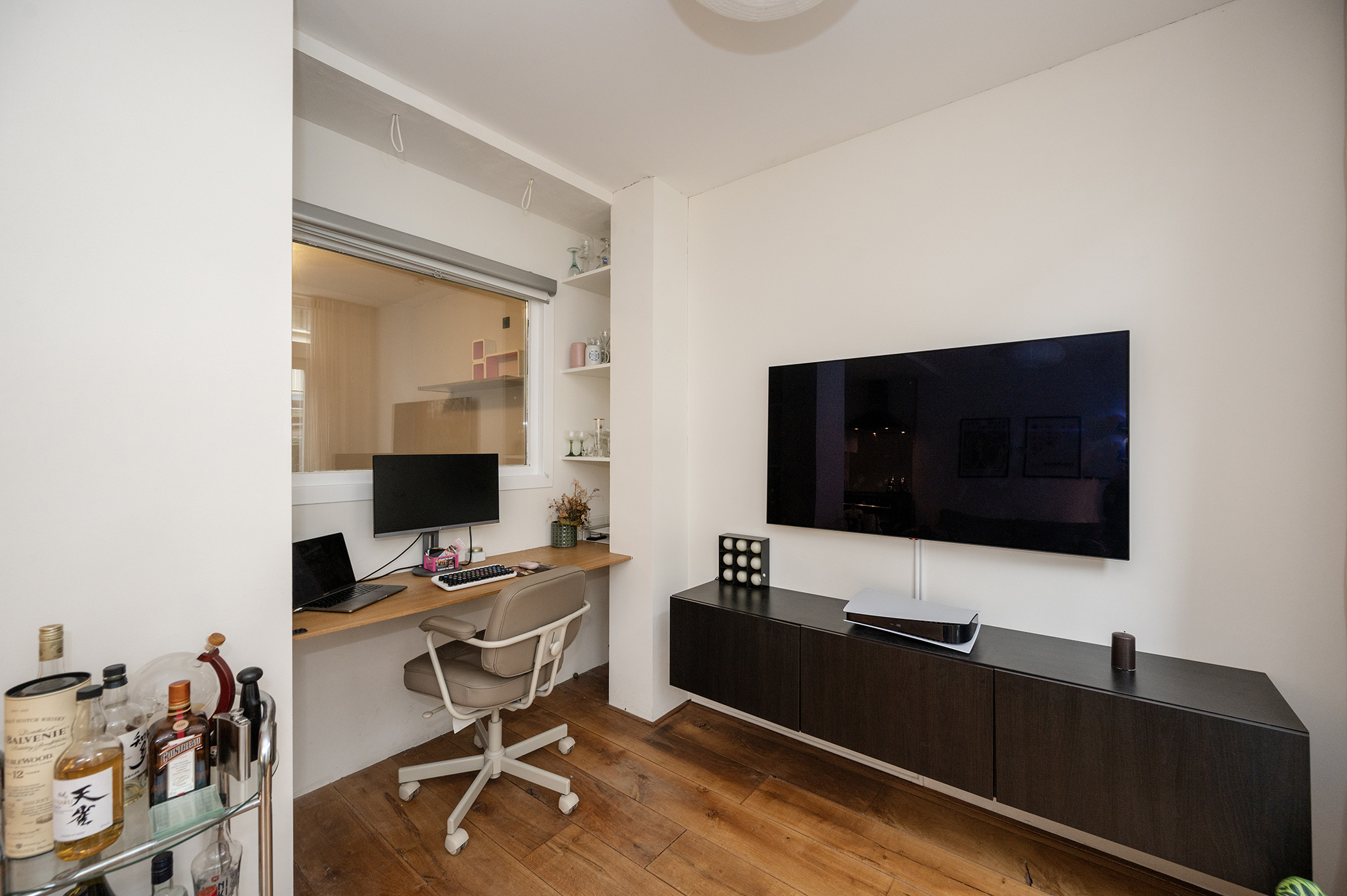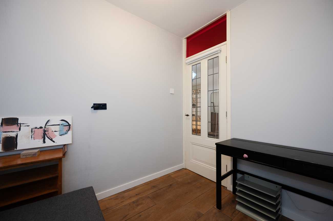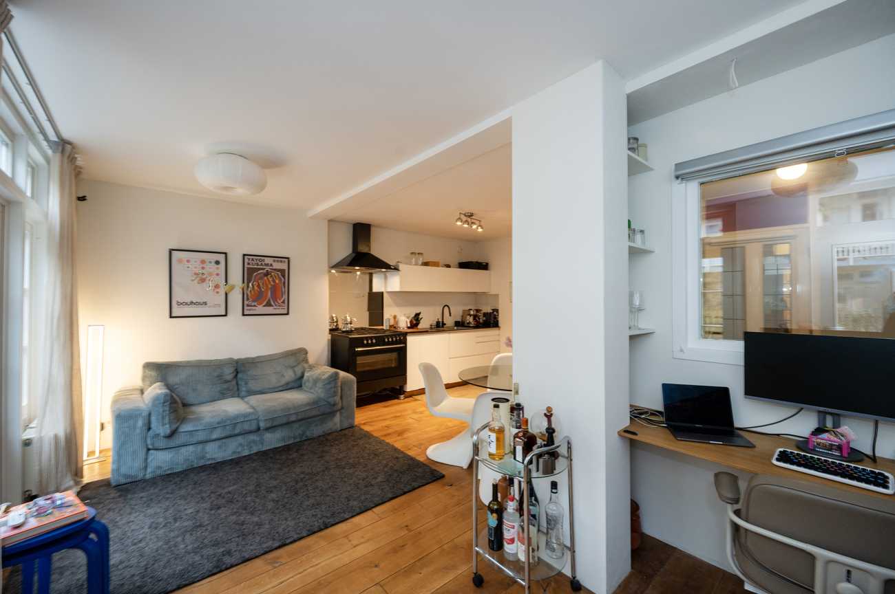 De gezellige en lichte woonkamer is gelegen aan de tuinkant. De ruimte is open en knus ingericht, met een comfortabele zithoek. In de hoek van de woonkamer bevindt zich een bureau, ideaal voor wie thuis werkt.