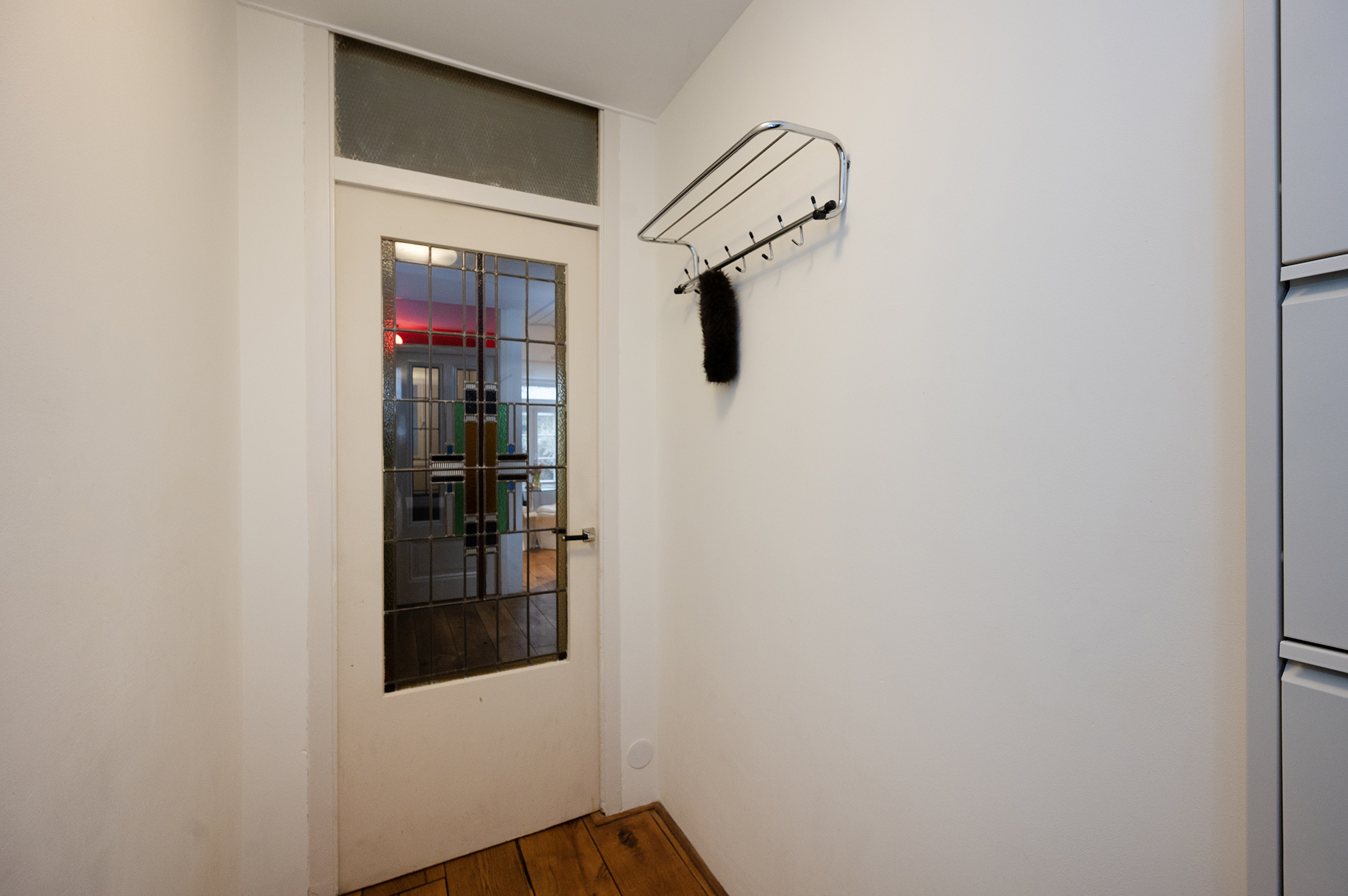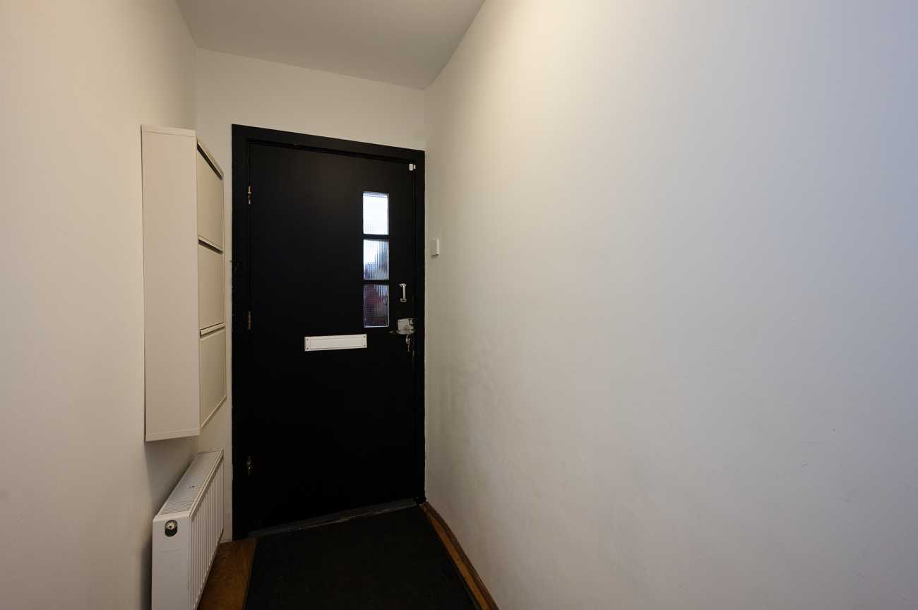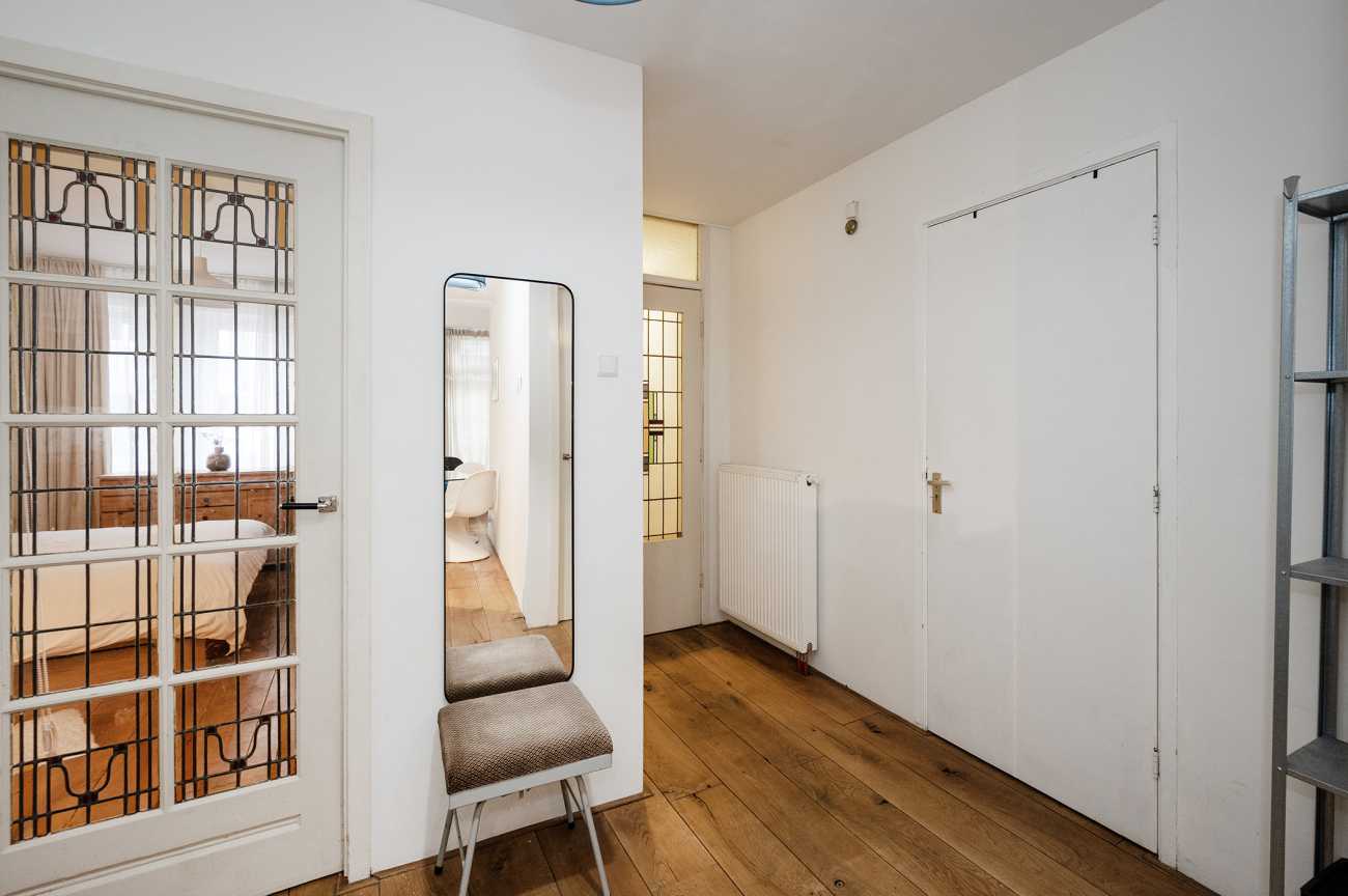 Je komt binnen in een open hal die doorloopt naar de woonkamer, logeerkamer en open keuken.