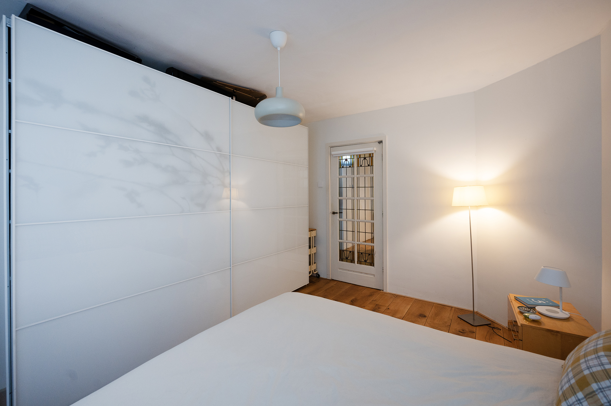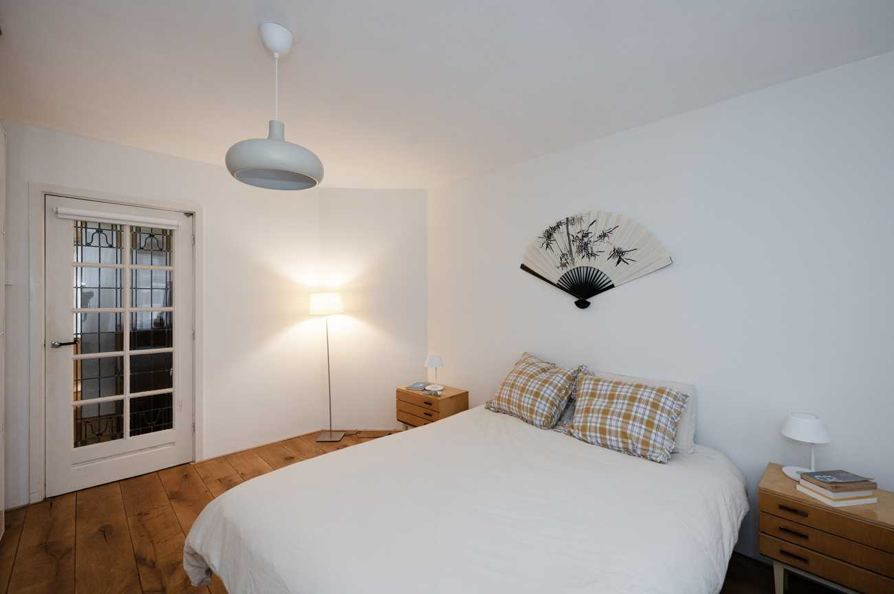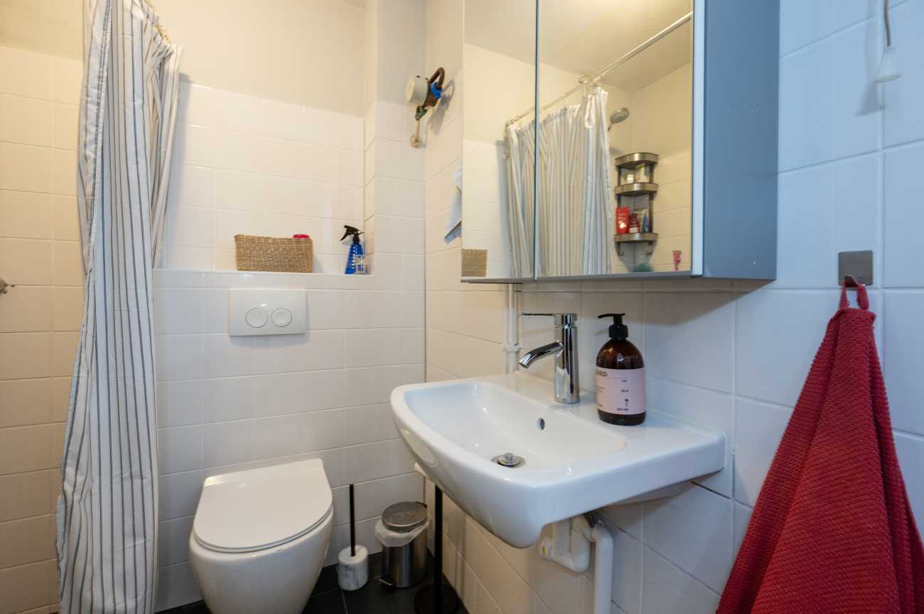 De woning heeft twee slaapkamers. De grote slaapkamer is voorzien van een tweepersoonsbed en een ruime garderobekast. De tweede slaapkamer, gelegen tussen de woonkamer en de keuken, beschikt over een slaapbank en kan perfect dienen als logeerkamer of werkkamer. De badkamer is uitgerust met een inloopdouche, een toilet en een wastafel.