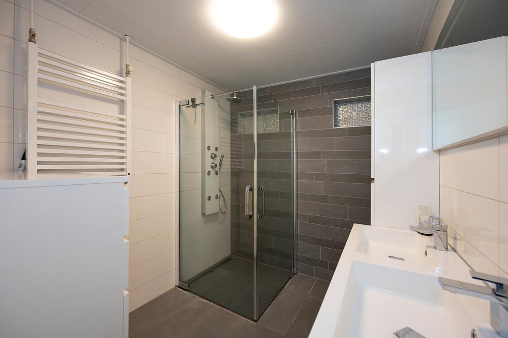 De moderne badkamer is voorzien van een regendouche, dubbele wastafel en een radiator.