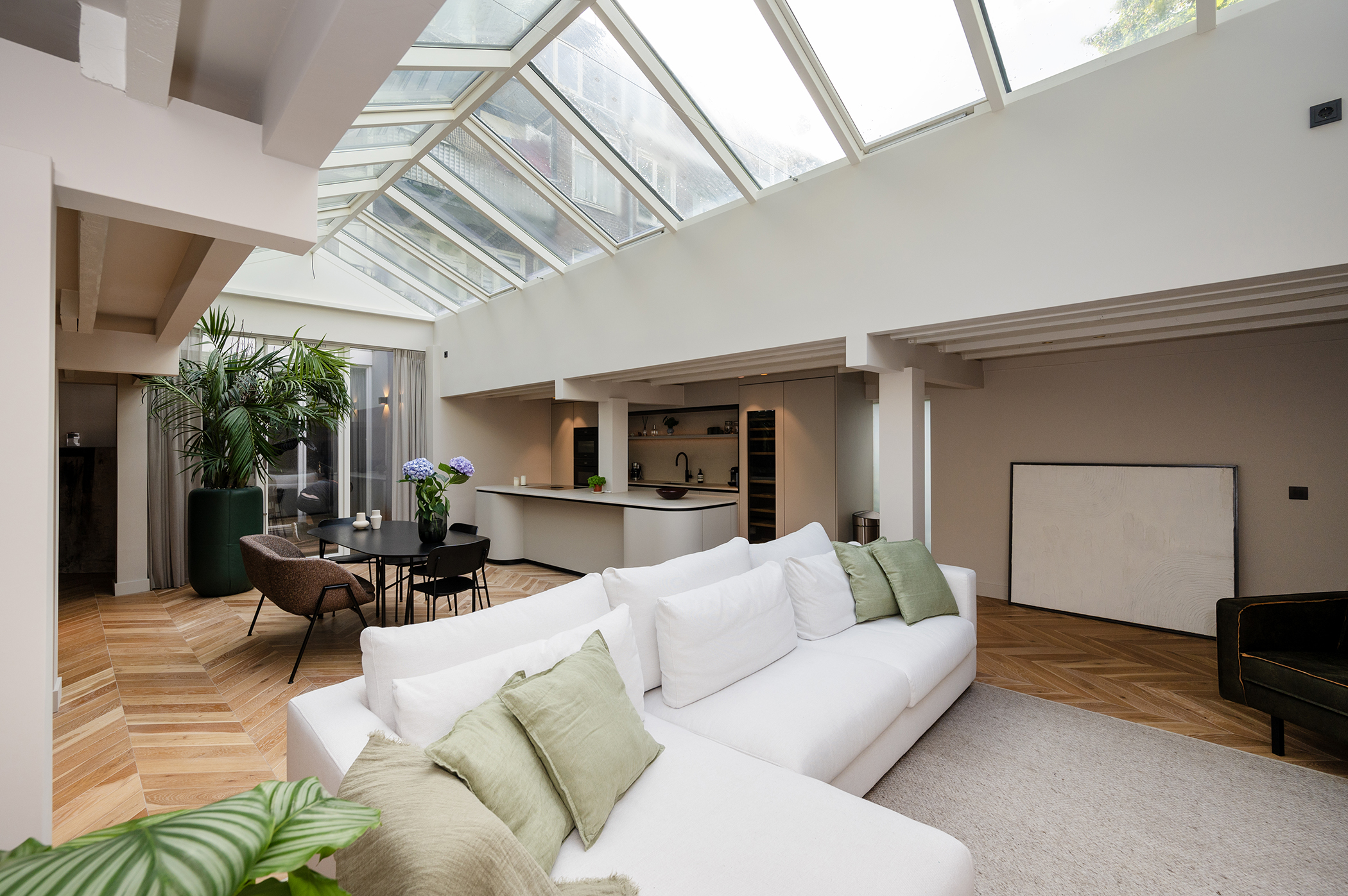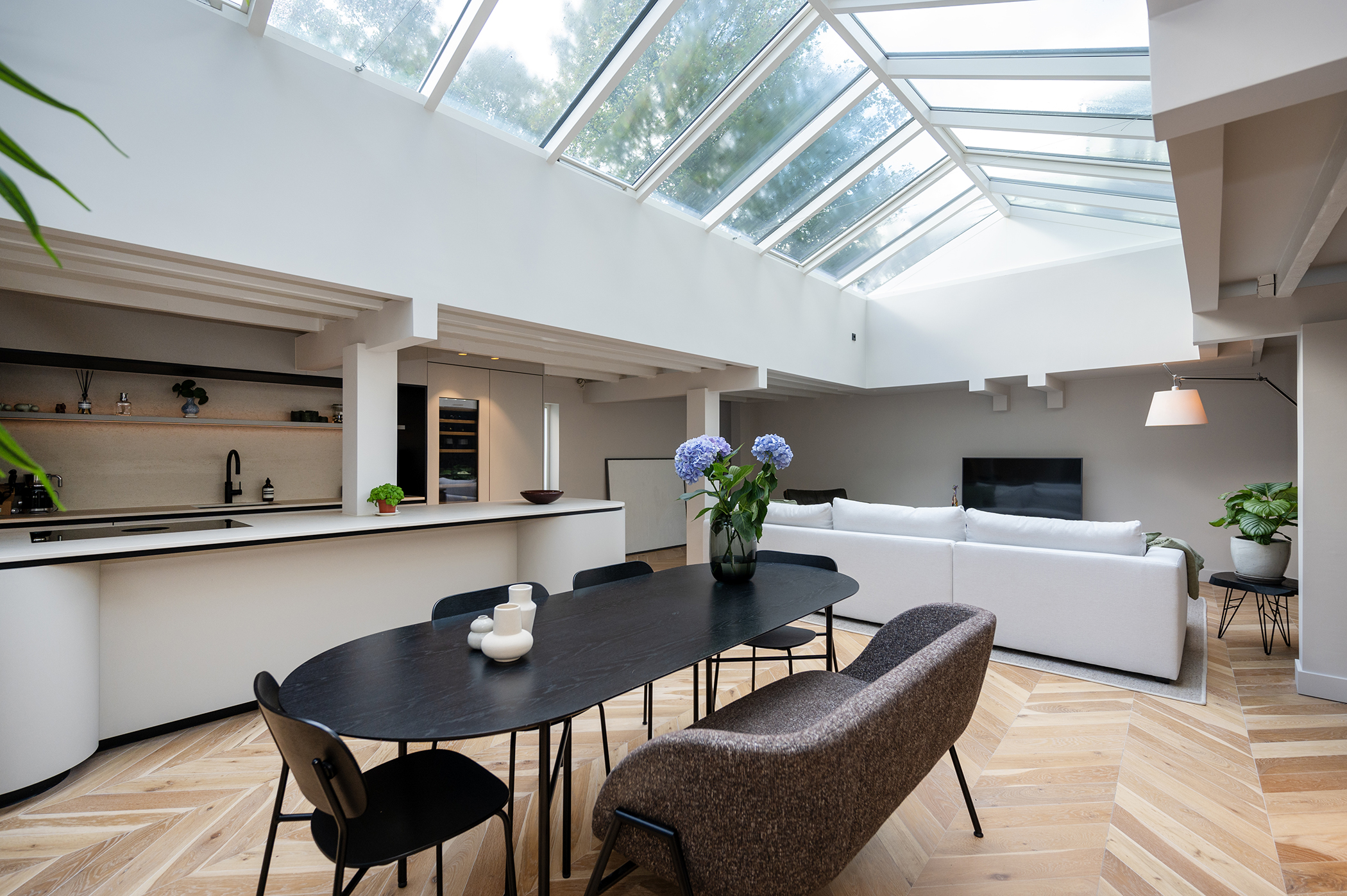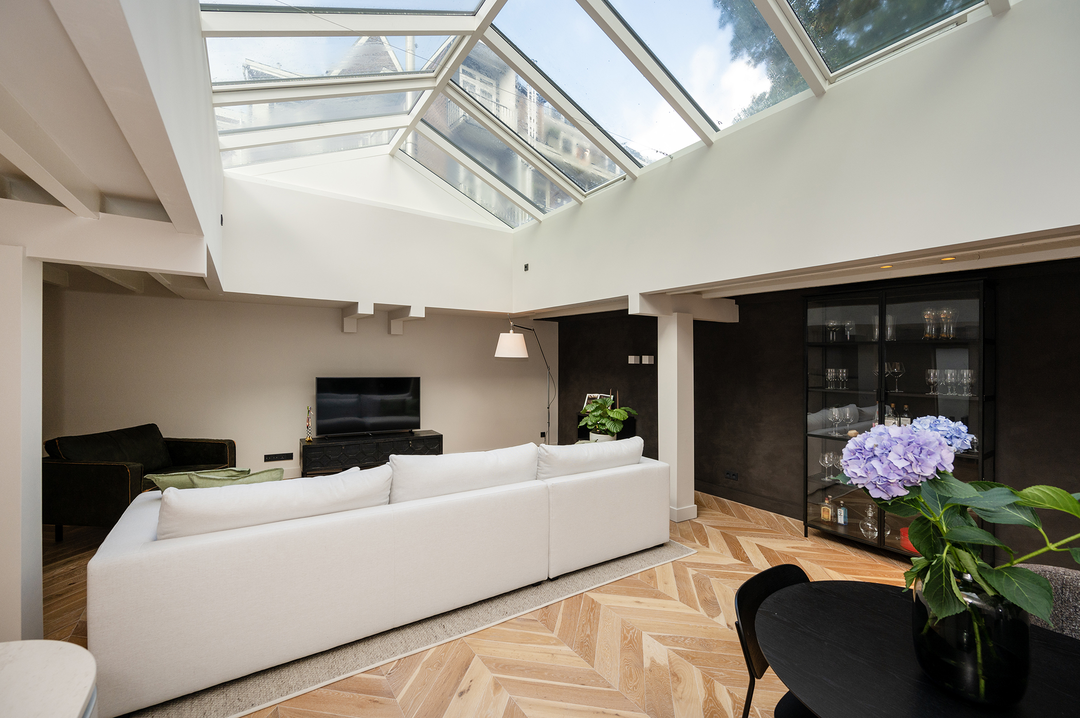De woonkamer met open keuken is voorzien van royale raampartijen en dakramen, die zorgen voor een prachtige lichtinval gedurende de hele dag.