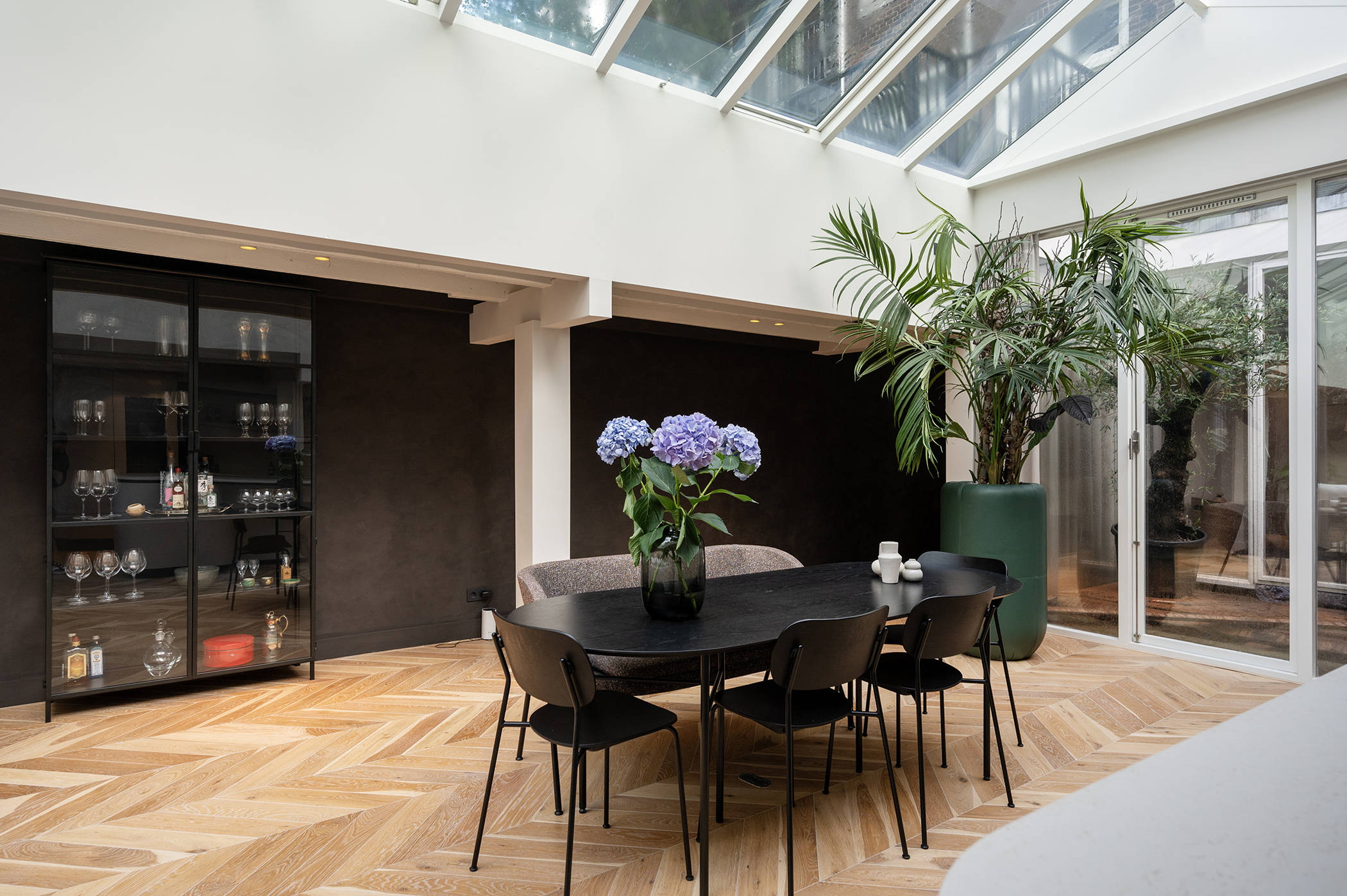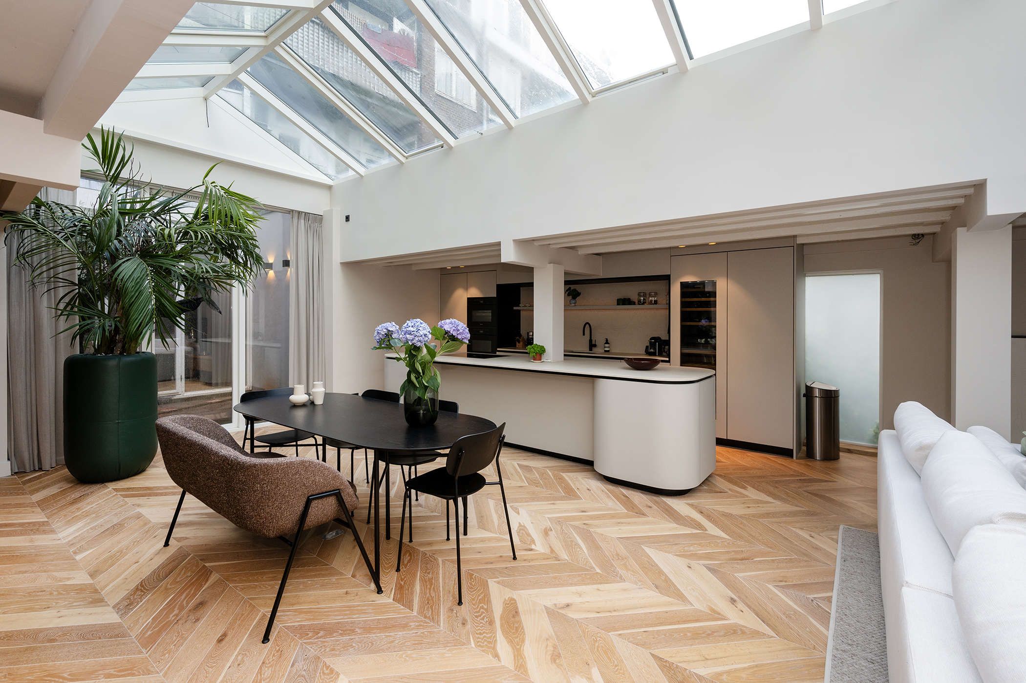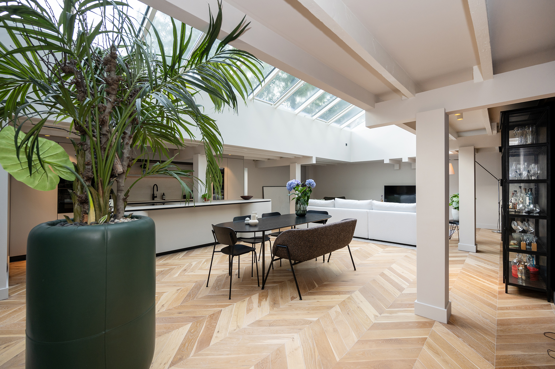De woonkamer met open keuken is voorzien van royale raampartijen en dakramen, die zorgen voor een prachtige lichtinval gedurende de hele dag.