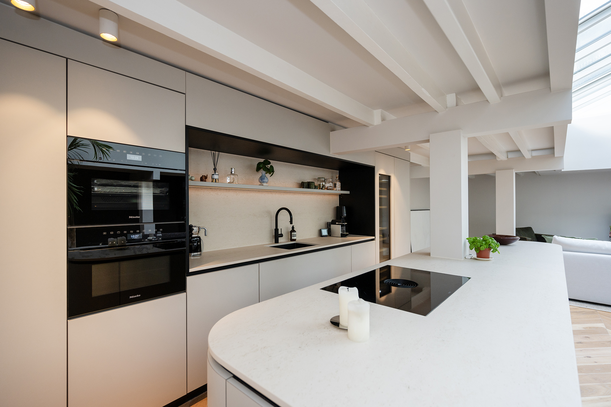 De keuken is volledig uitgerust met hoogwaardig inbouwapparatuur zoals een wijnkoeler, vaatwasser, (stoom)-oven, magnetron, koel-vries combinatie, en inductiekookplaat.