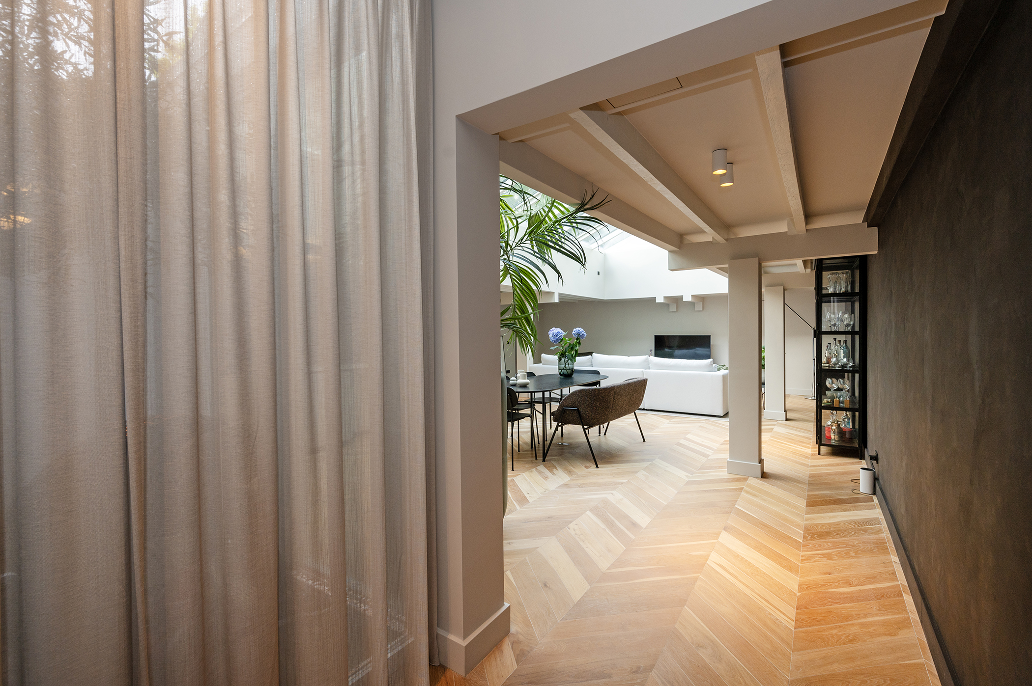 Je komt binnen in de hal die toegang verschaft tot alle vertrekken. Aan de achterzijde van de woning is de woonkamer met open keuken gelegen. De meest unieke plek in dit appartement.