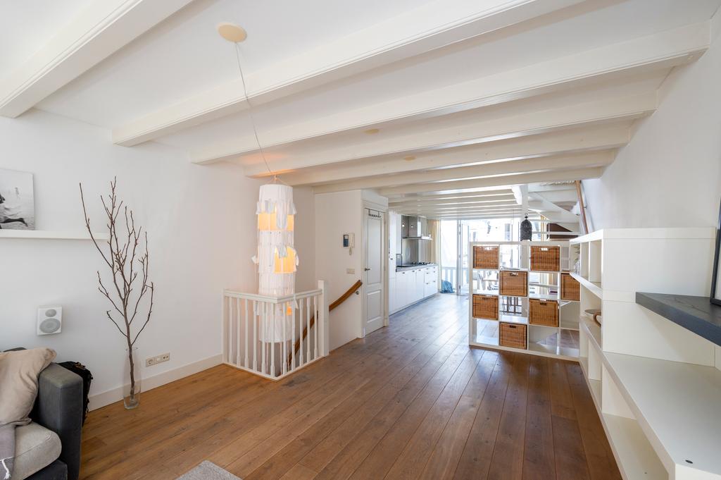 Entree woning op de tweede verdieping, hal met trapopgang naar de derde verdieping. Op de derde verdieping is een ruime doorzon woonkamer met een open keuken. De keuken is voorzien van inbouwapparatuur zoals een koel/vriescombinatie, vaatwasser, 5-pits gasfornuis, combioven en een rvs afzuigkap. Via de open wenteltrap bereikt u de vierde verdieping. Via twee openslaande deuren is er toegang tot het balkon, ligging Noordwest. De derde verdieping is voorzien van een mooie houten vloer.