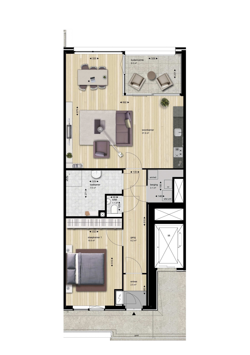 De lichte en ruime woonkamer valt op door de grote raampartijen, die zorgen voor veel natuurlijk daglicht. Via de schuifpui bereik je de ruime loggia, gelegen op het zuiden. Een heerlijke plek om te ontspannen of buiten te eten tijdens warme dagen.