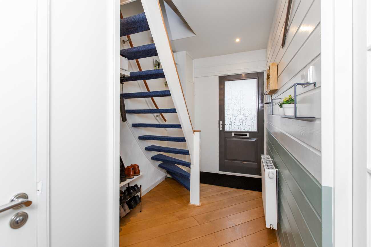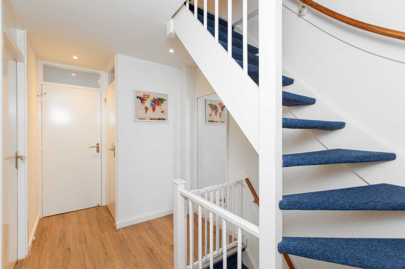 Via de hal betreed je de ruime en lichte woonkamer, die dankzij de hoekligging extra veel daglicht en privacy biedt. Vanuit de woonkamer stap je de zonnige achtertuin in, die ruim aanvoelt door de vrije ligging rondom het huis. De moderne inbouwkeuken is voorzien van diverse apparatuur, waaronder een koelkast, oven met gasfornuis, vaatwasser en voldoende bergruimte voor al je keukengerei. Op de begane grond bevindt zich tevens een separate toiletruimte.