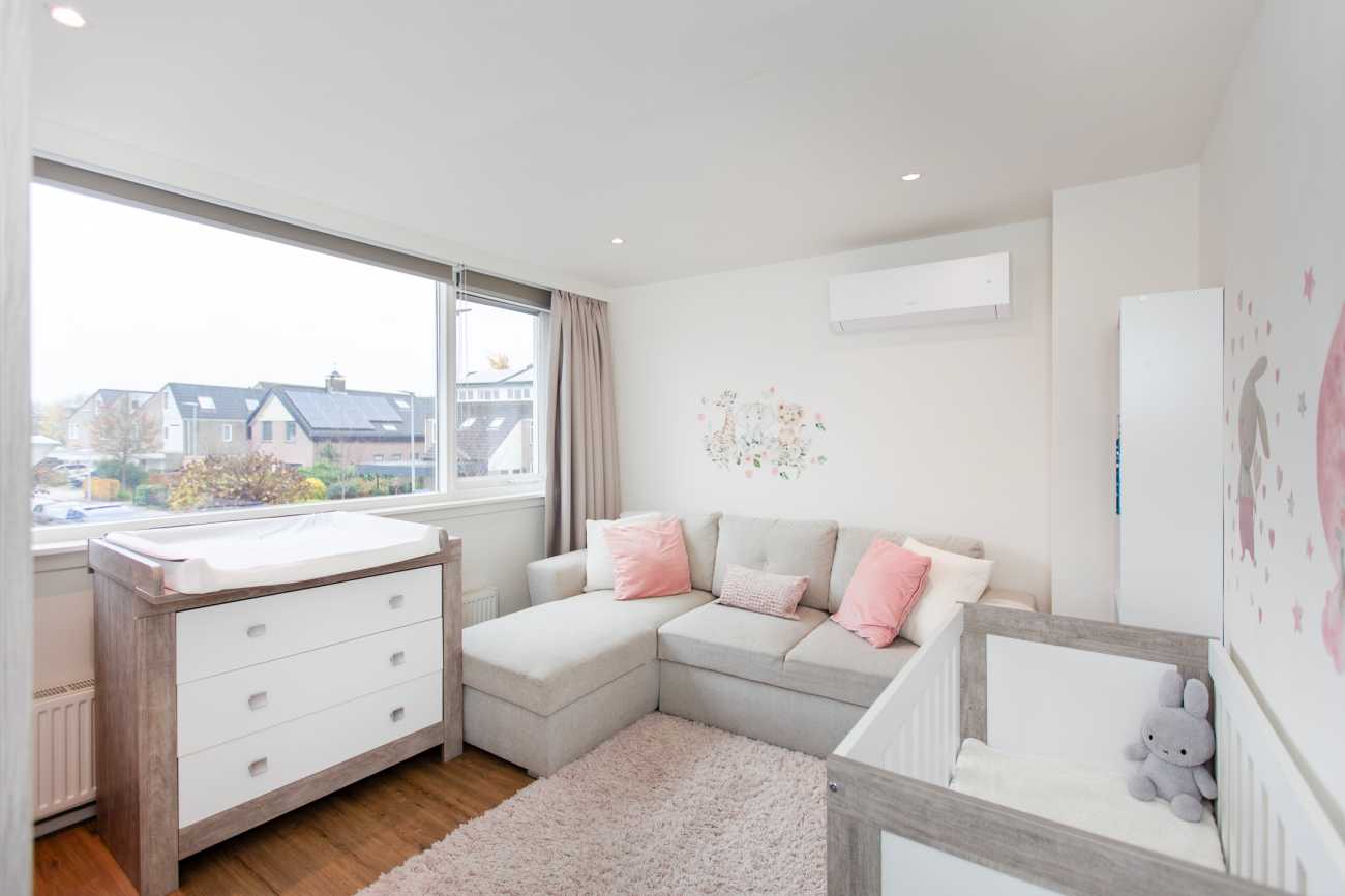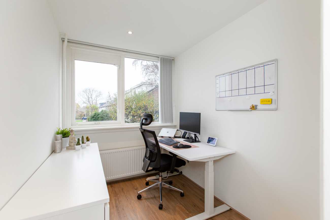 Op de eerste verdieping bevinden zich drie slaapkamers, waarvan één momenteel is ingericht als comfortabele thuiswerkplek. Ook vind je hier de badkamer, uitgerust met een ruime inloopdouche, handdoekradiator en wastafel.