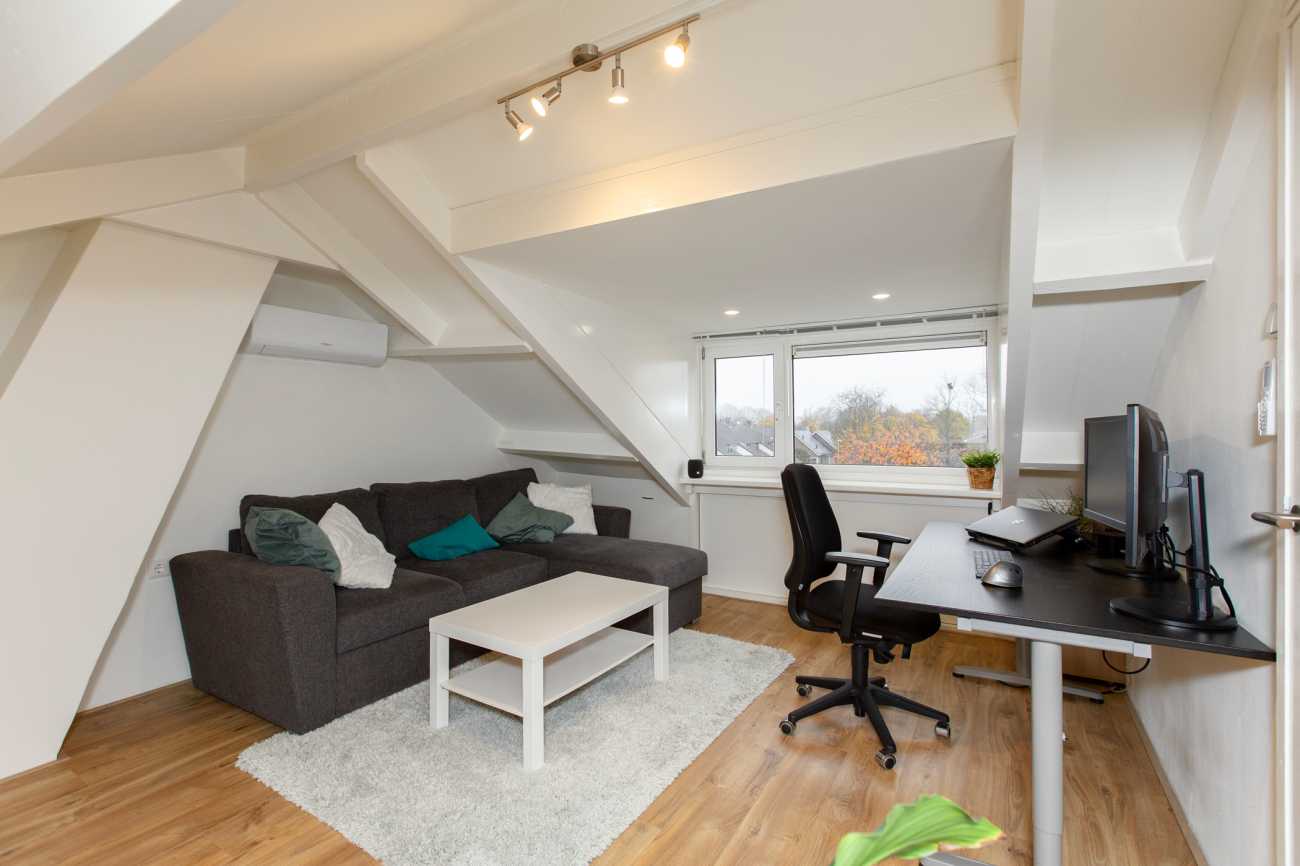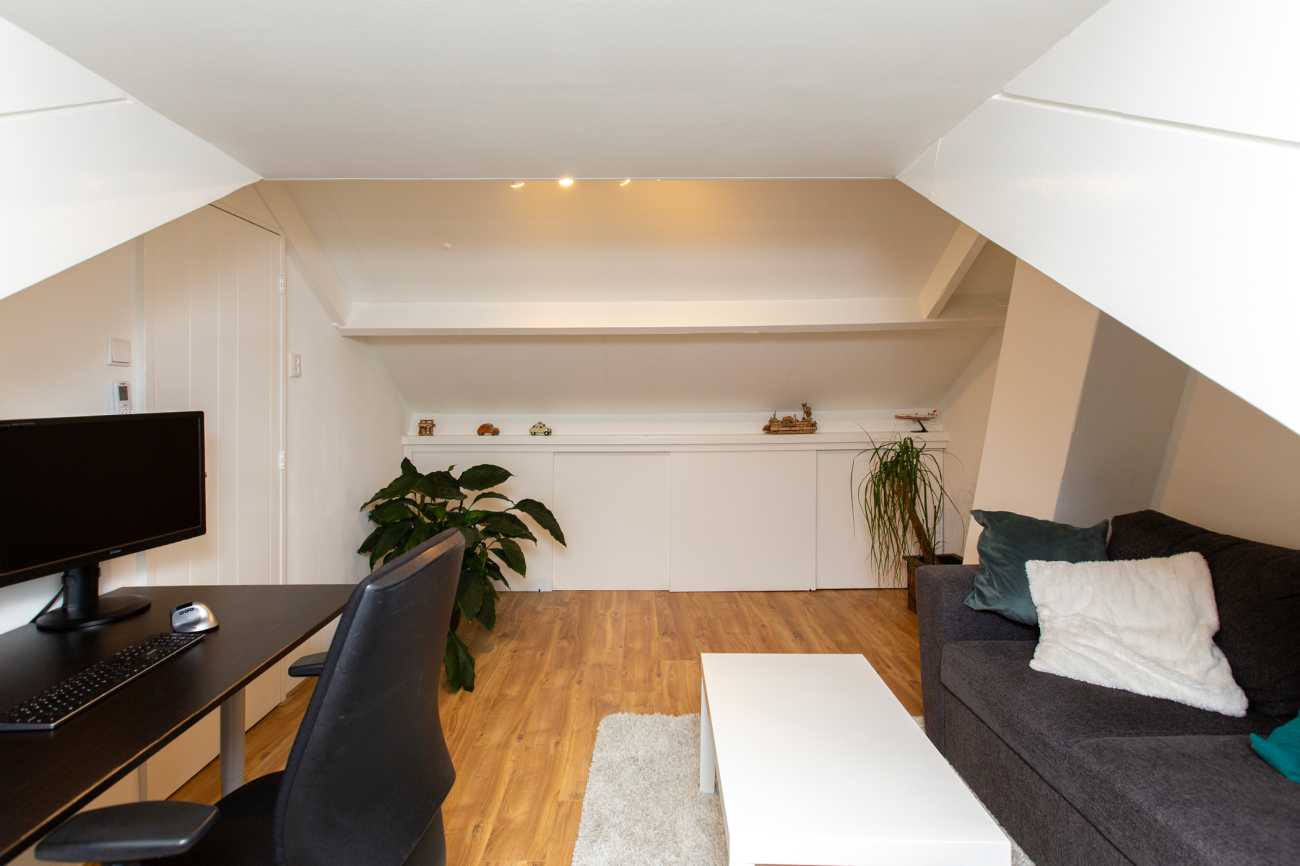 De tweede verdieping bestaat uit een ruime zolderkamer die flexibel in te richten is. Deze wordt nu gebruikt als werk- en logeerkamer, maar kan eenvoudig dienen als extra slaapkamer of hobbyruimte. Ideaal voor wie behoefte heeft aan ruimte en flexibiliteit.