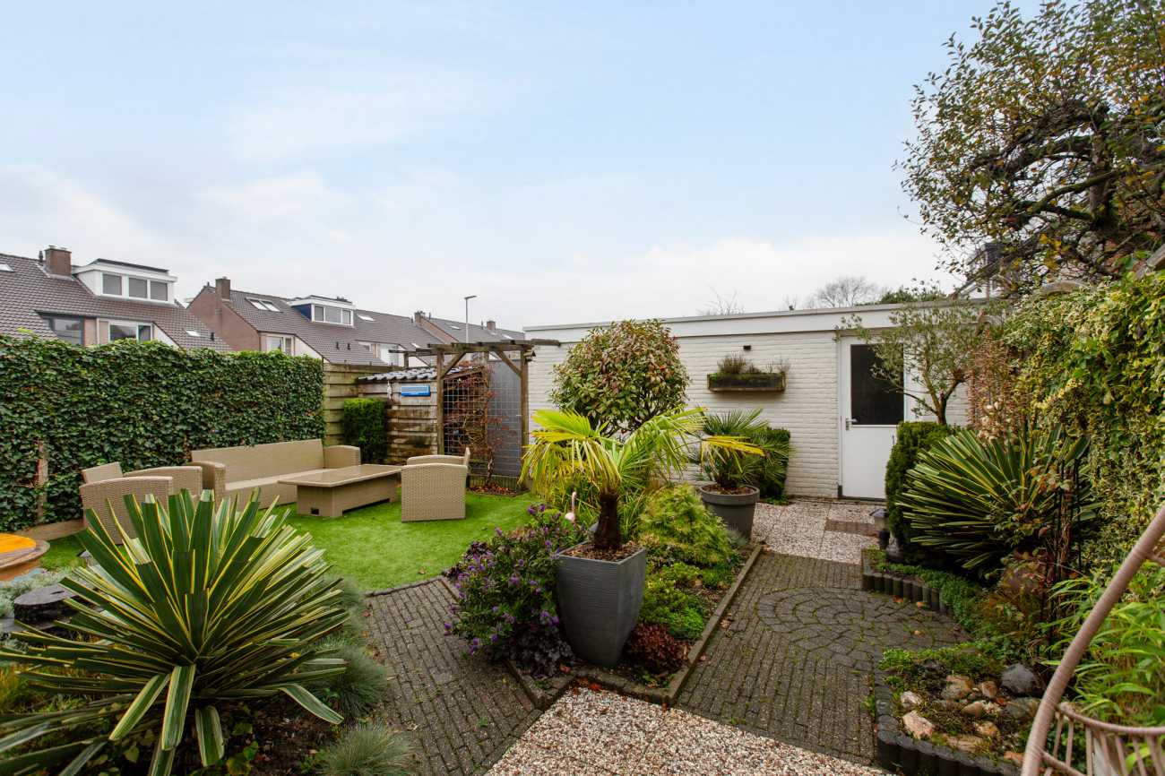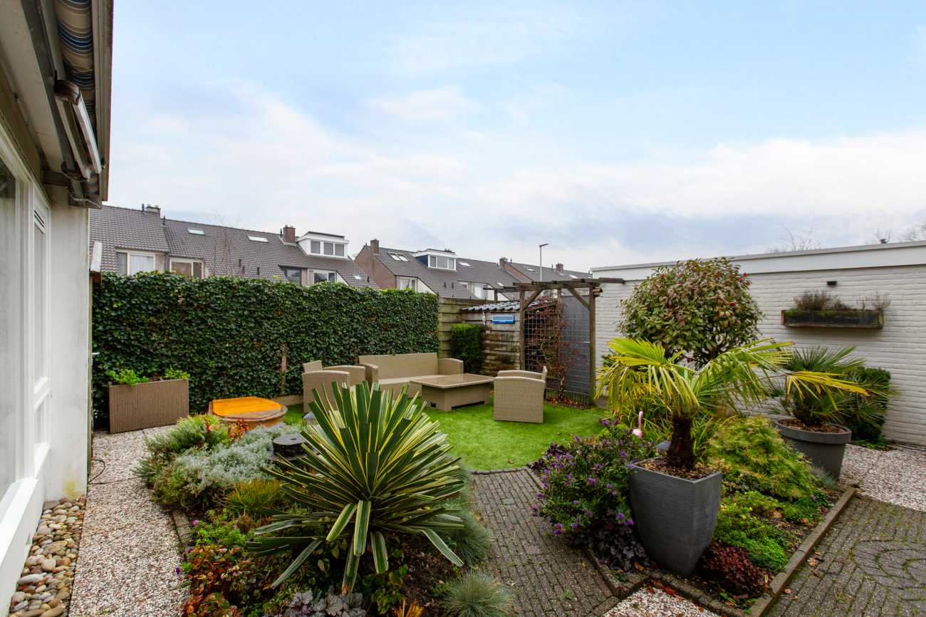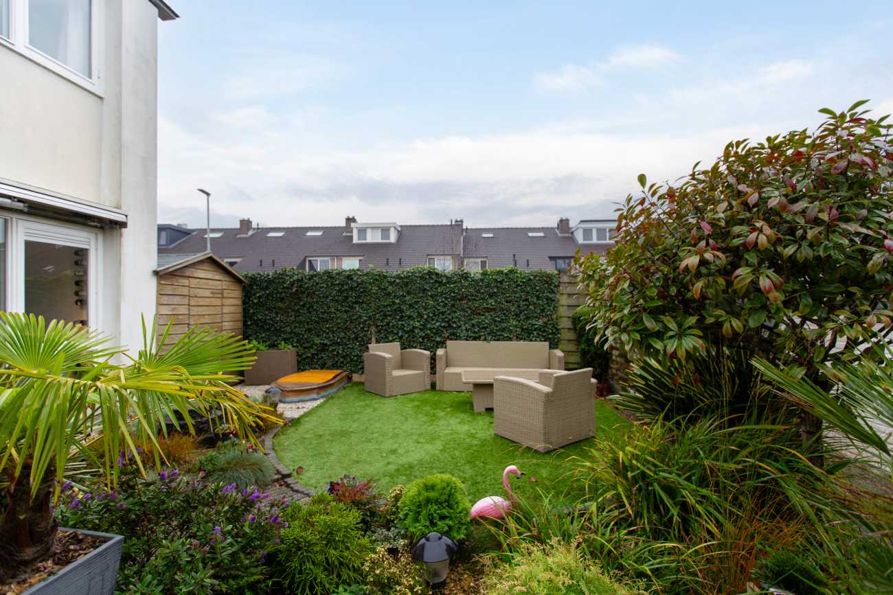 Aan de achterzijde van de woning ligt een royale, op het westen gelegen tuin, die via een zijomloop ook vanaf de voorkant bereikbaar is. Daarnaast beschikt de woning over een garage en een eigen parkeerplaats.