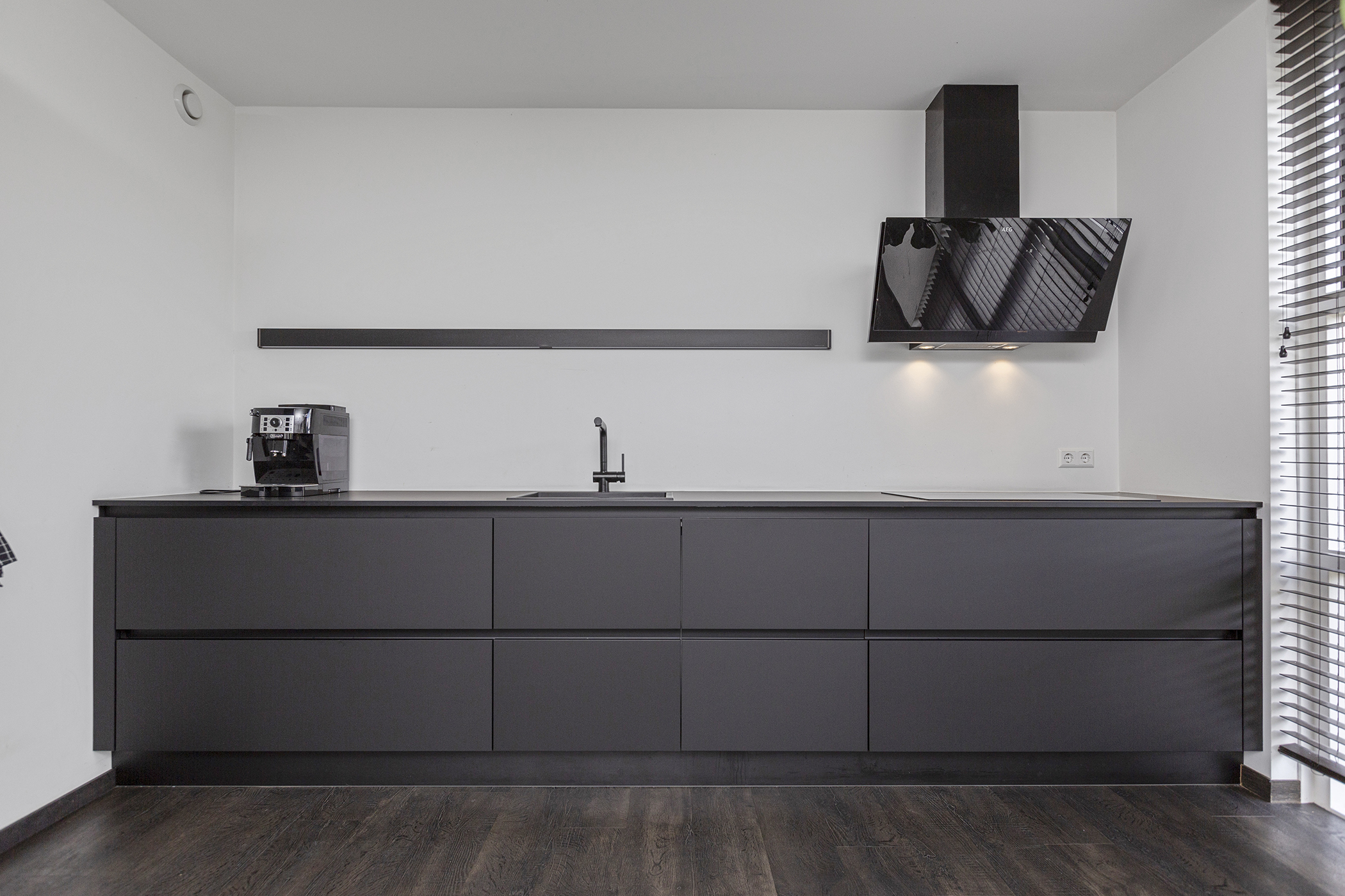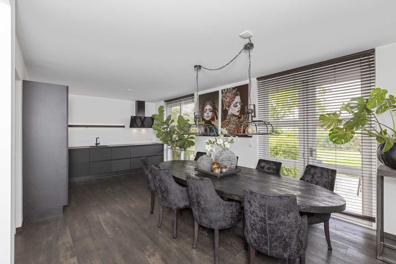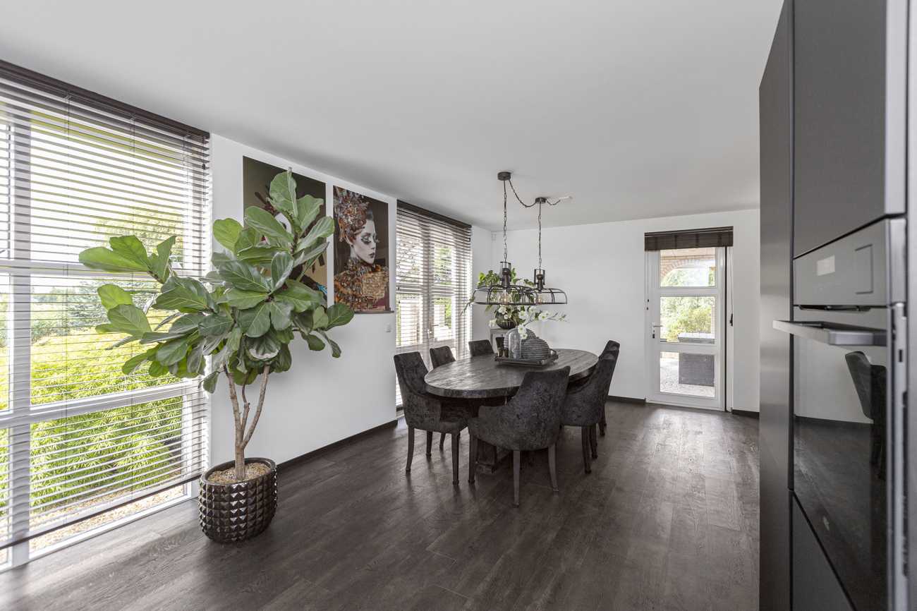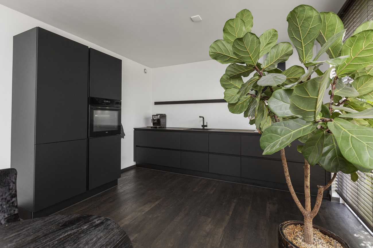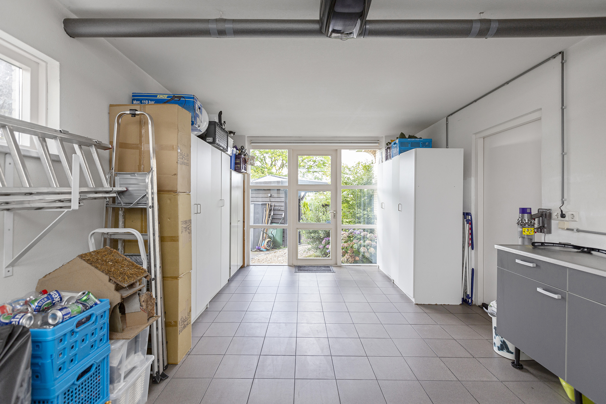 De keuken is volledig uitgerust met hoogwaardige inbouwapparatuur, waaronder een oven, koelkast met vriezer, vaatwasser, inductiekookplaat en afzuigkap. Direct naast de keuken bevindt zich een praktische bijkeuken met wasmachine en toegang tot de inpandige garage.