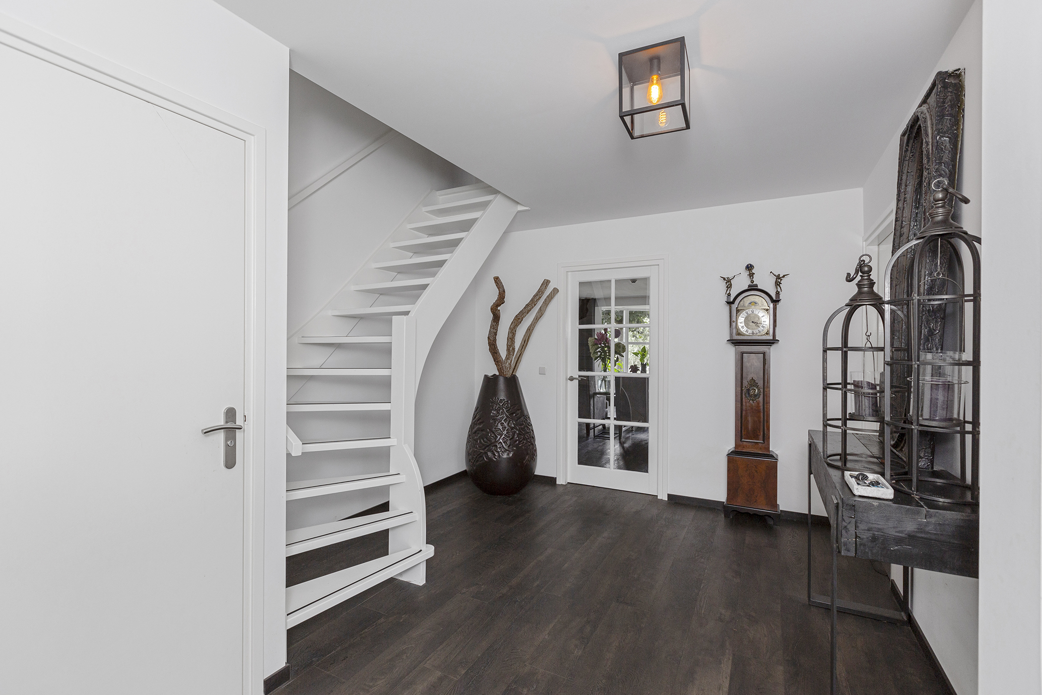 Bij binnenkomst betreedt u een ruime hal die toegang biedt tot de sfeervolle woonkamer, het kantoor, het toilet met luxe afwerking en de badkamer op de begane grond.