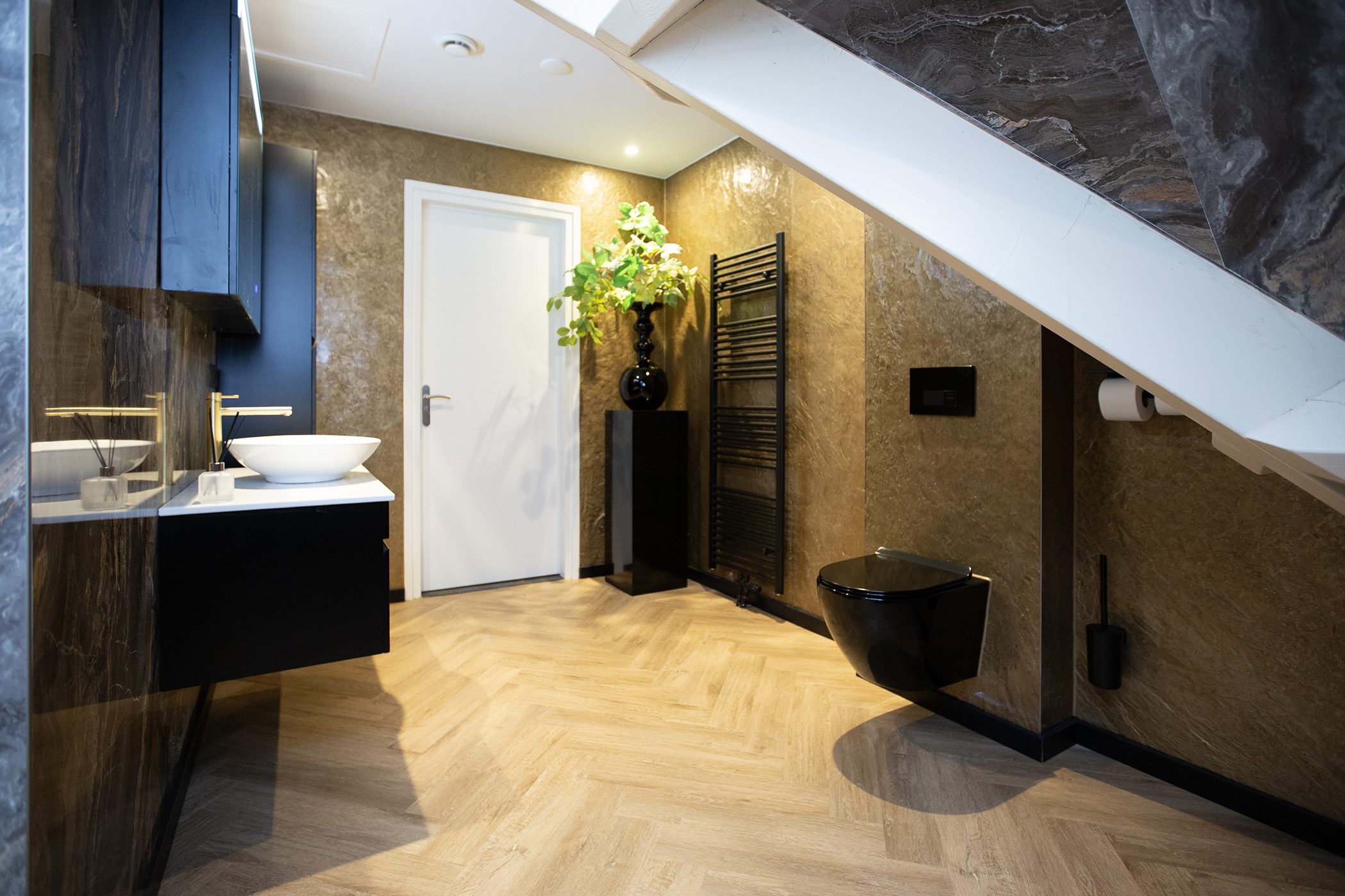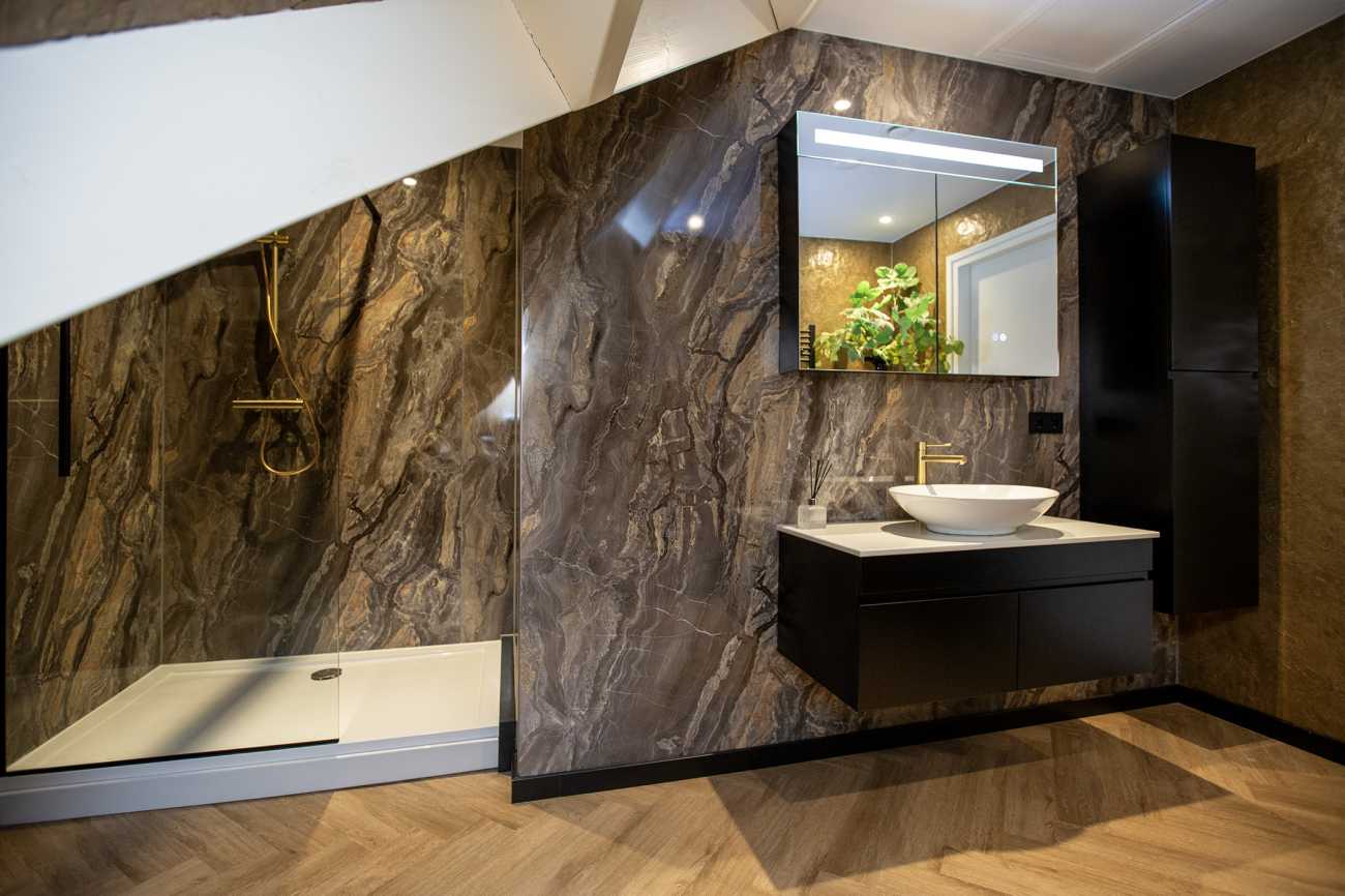 De woning beschikt over twee badkamers. De badkamer op de begane grond is praktisch en stijlvol afgewerkt. De tweede badkamer op de bovenverdieping is volledig gerenoveerd en voorzien van een inloopdouche, toilet en een wastafel met meubel.