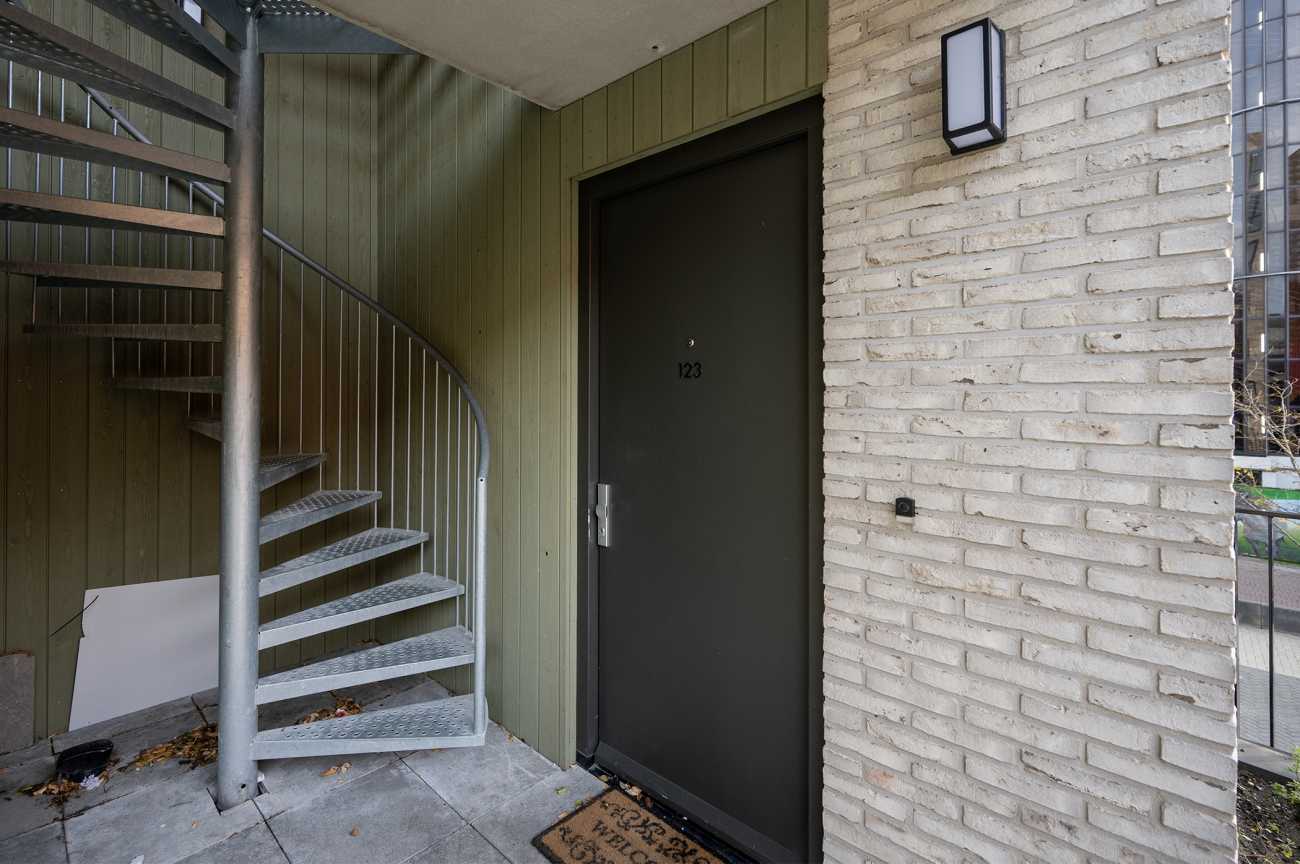 De centrale entree van het complex geeft toegang tot het gebouw en beschikt over brievenbussen, toegang tot de fietsenberging en garage, een bellenplateau en een lift.
