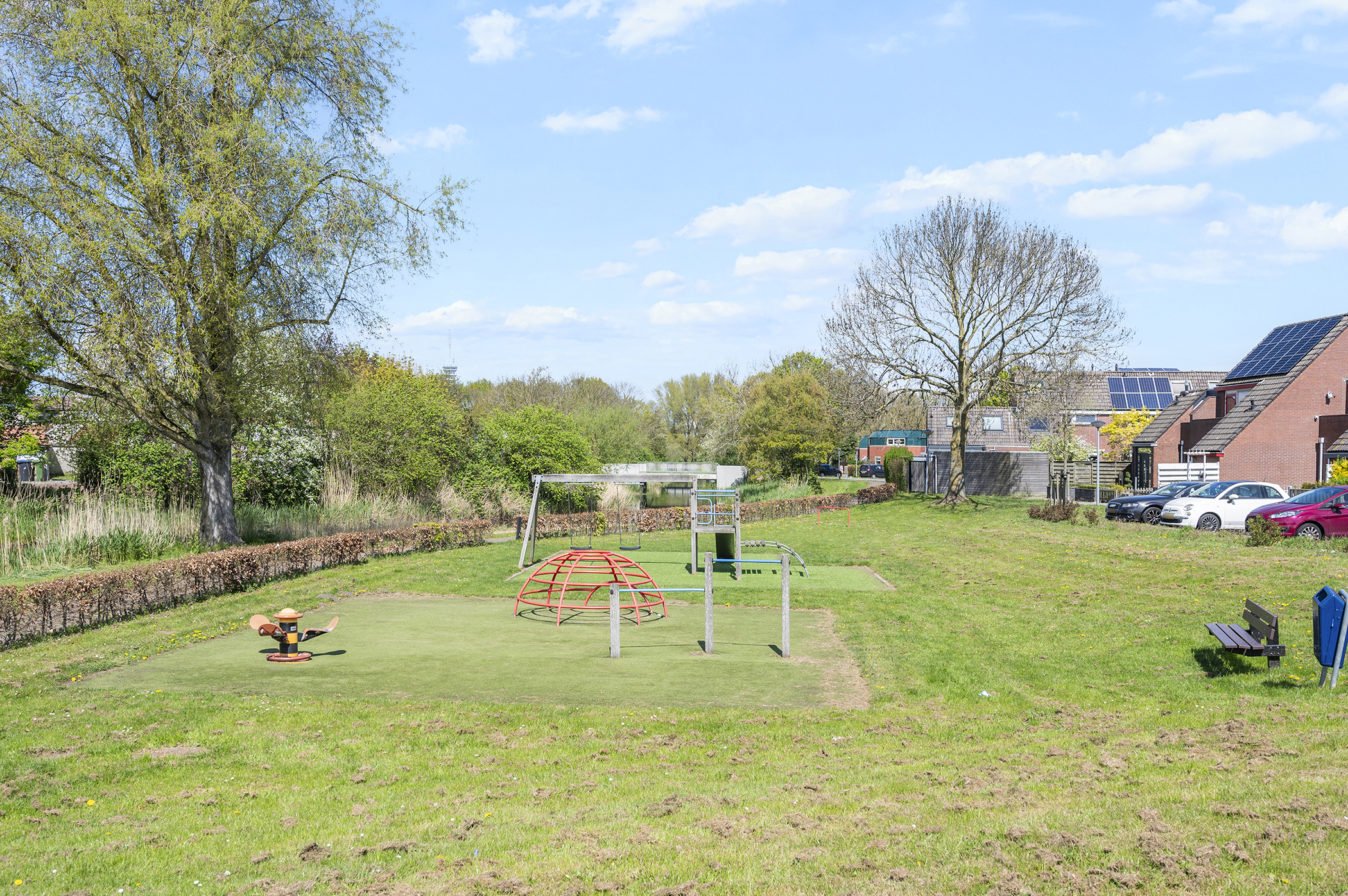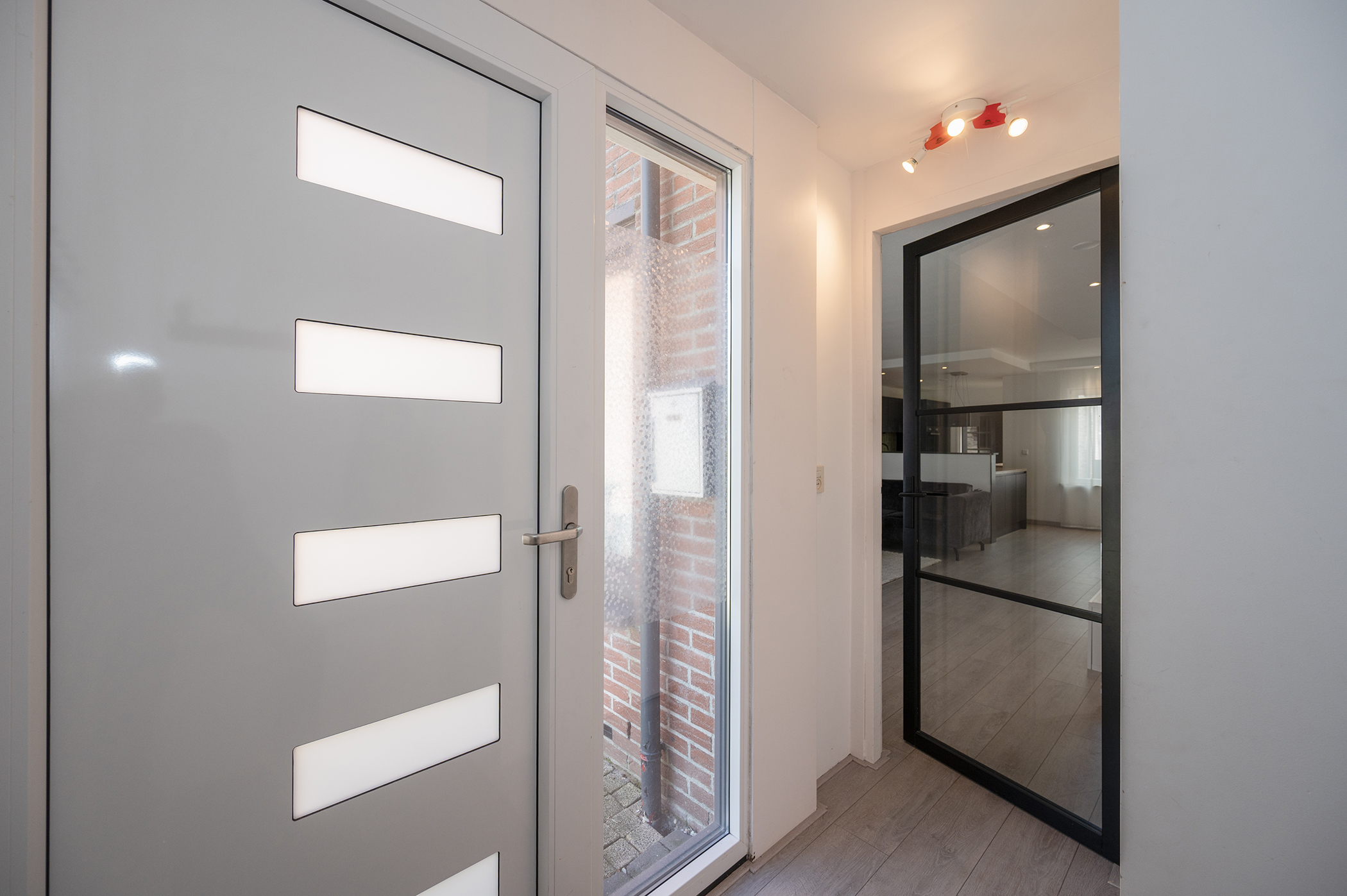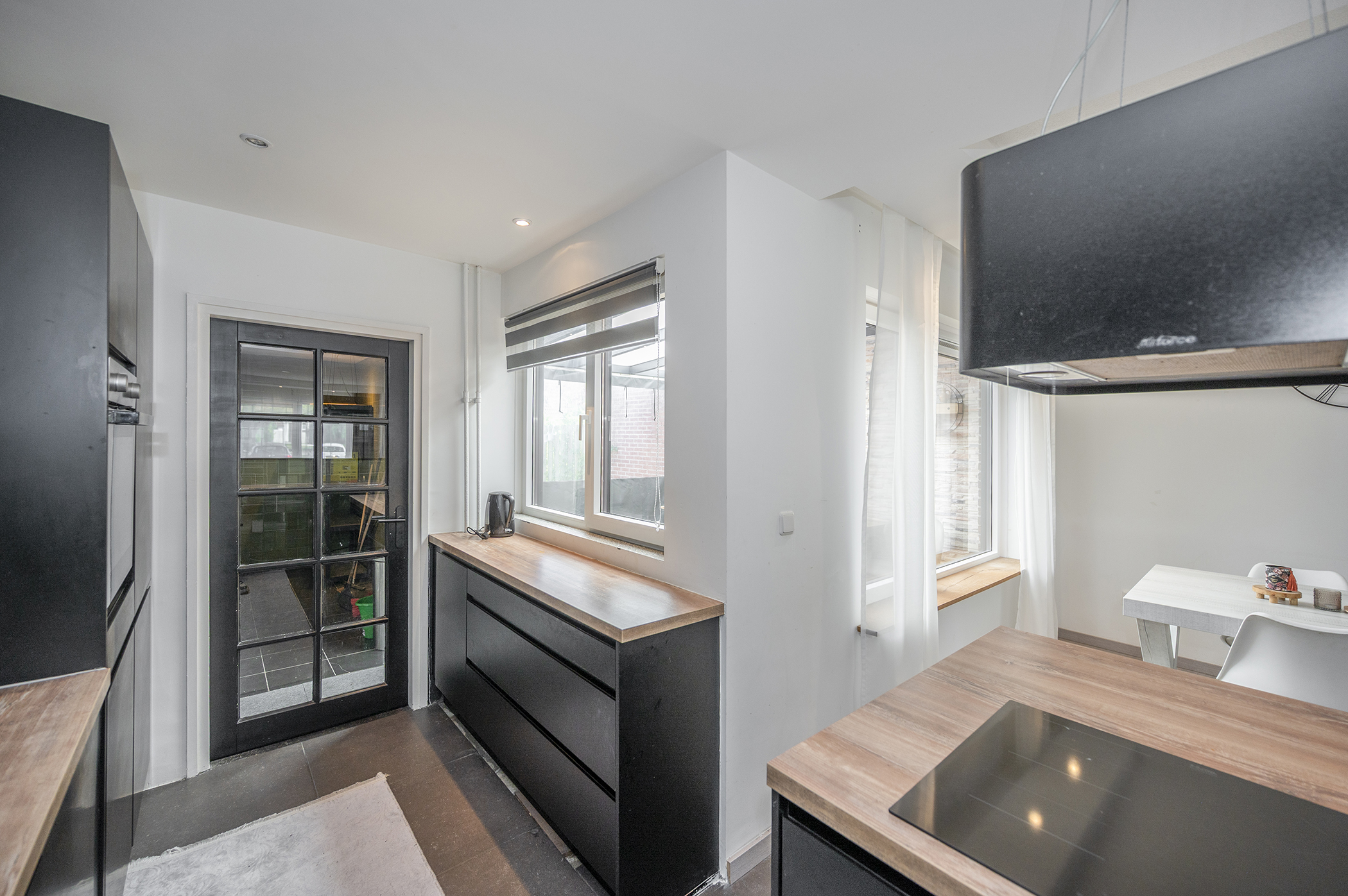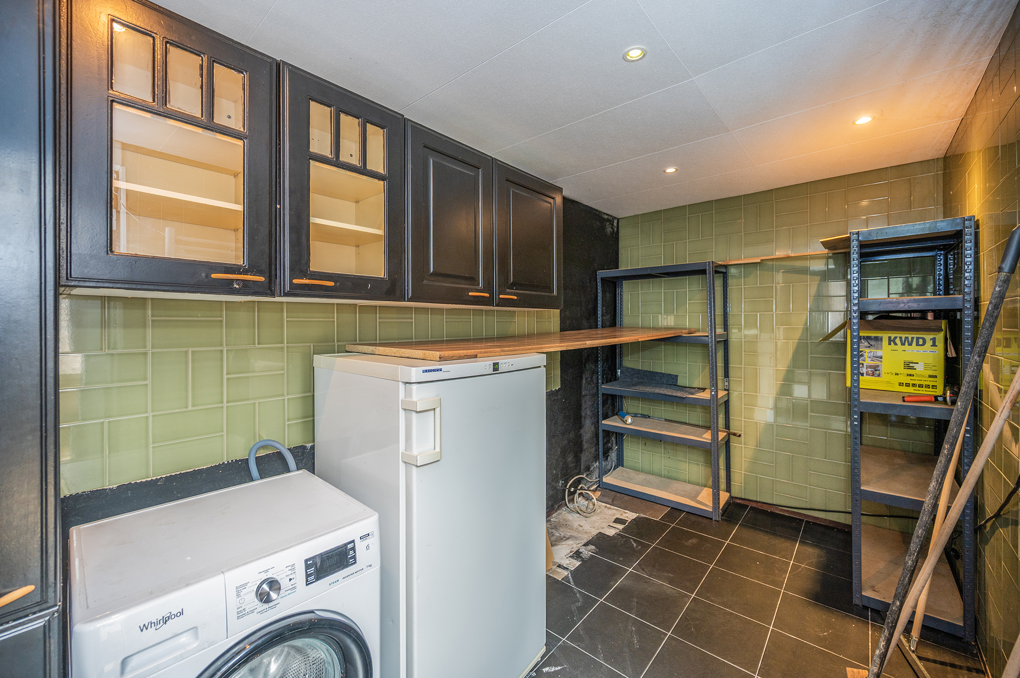 Via de verzorgde voortuin bereikt u de entree van de woning. U komt binnen in de hal, waar zich het toilet met fonteintje, de meterkast en de trapopgang naar de eerste verdieping bevinden. Vanuit de hal heeft u toegang tot de woonkamer. De woonkamer is royaal van opzet en speels ingedeeld, wat zorgt voor een dynamische en gezellige leefruimte. Dankzij de grote raampartijen geniet u hier van veel natuurlijk licht, wat de ruimte een open en uitnodigend karakter geeft. De woonkamer loopt naadloos over in de luxe woonkeuken, die is uitgevoerd in een praktische hoekopstelling. Deze keuken is voorzien van diverse moderne inbouwapparatuur en biedt volop werk- en opbergruimte, waardoor koken hier een waar plezier wordt. Aansluitend vindt u de royale bijkeuken, een zeer praktische ruimte met aansluitingen voor de wasmachine en droger. Daarnaast biedt deze ruimte extra bergruimte, ideaal voor het opbergen van voorraden en huishoudelijke spullen.