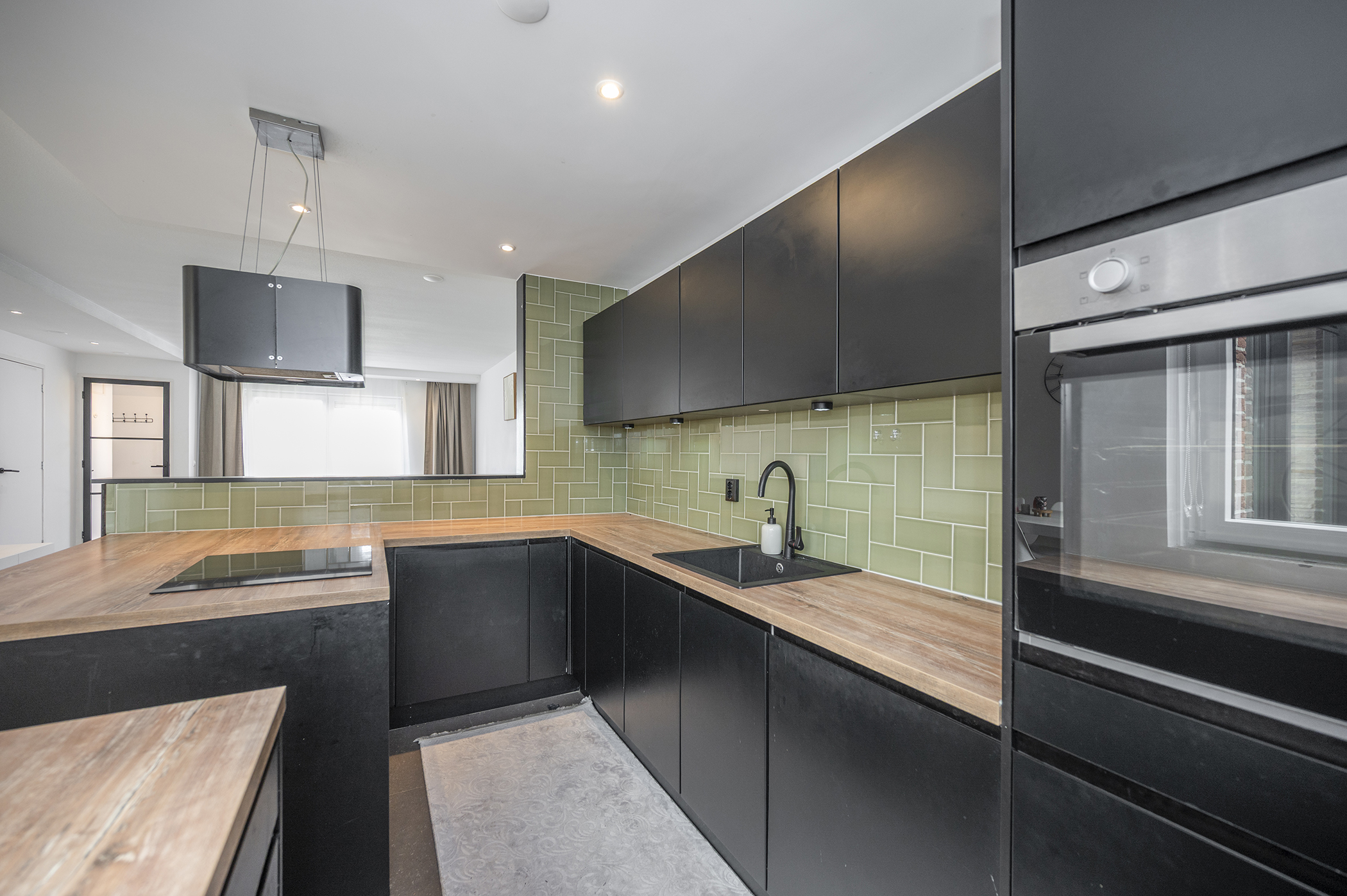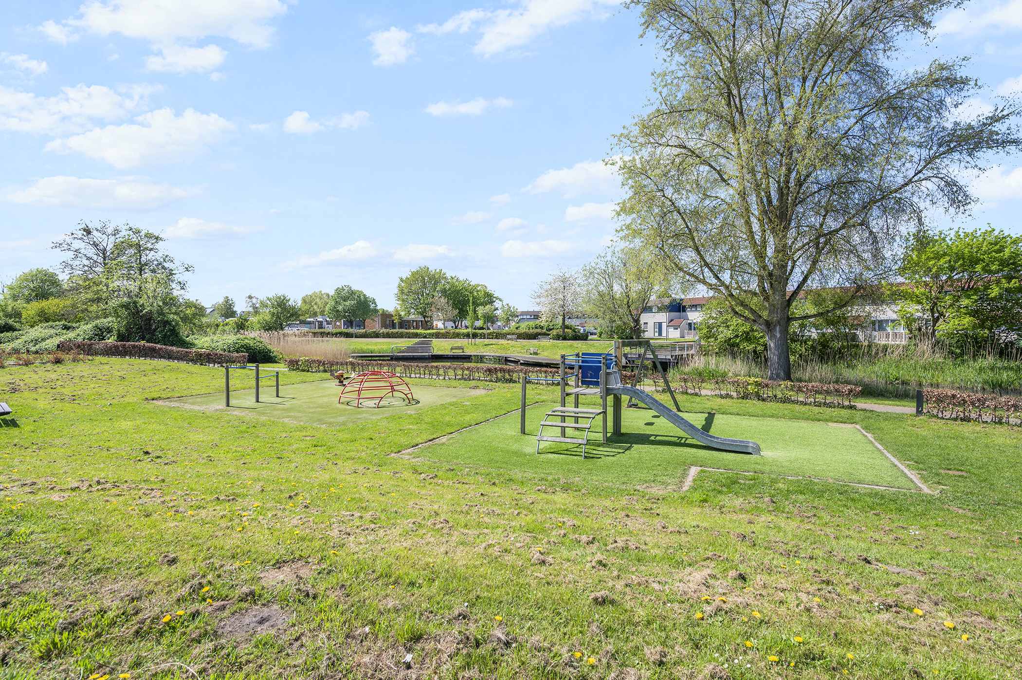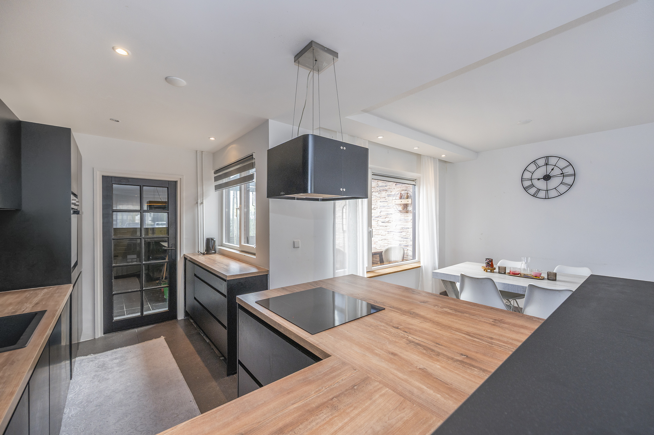 Via de verzorgde voortuin bereikt u de entree van de woning. U komt binnen in de hal, waar zich het toilet met fonteintje, de meterkast en de trapopgang naar de eerste verdieping bevinden. Vanuit de hal heeft u toegang tot de woonkamer. De woonkamer is royaal van opzet en speels ingedeeld, wat zorgt voor een dynamische en gezellige leefruimte. Dankzij de grote raampartijen geniet u hier van veel natuurlijk licht, wat de ruimte een open en uitnodigend karakter geeft. De woonkamer loopt naadloos over in de luxe woonkeuken, die is uitgevoerd in een praktische hoekopstelling. Deze keuken is voorzien van diverse moderne inbouwapparatuur en biedt volop werk- en opbergruimte, waardoor koken hier een waar plezier wordt. Aansluitend vindt u de royale bijkeuken, een zeer praktische ruimte met aansluitingen voor de wasmachine en droger. Daarnaast biedt deze ruimte extra bergruimte, ideaal voor het opbergen van voorraden en huishoudelijke spullen.