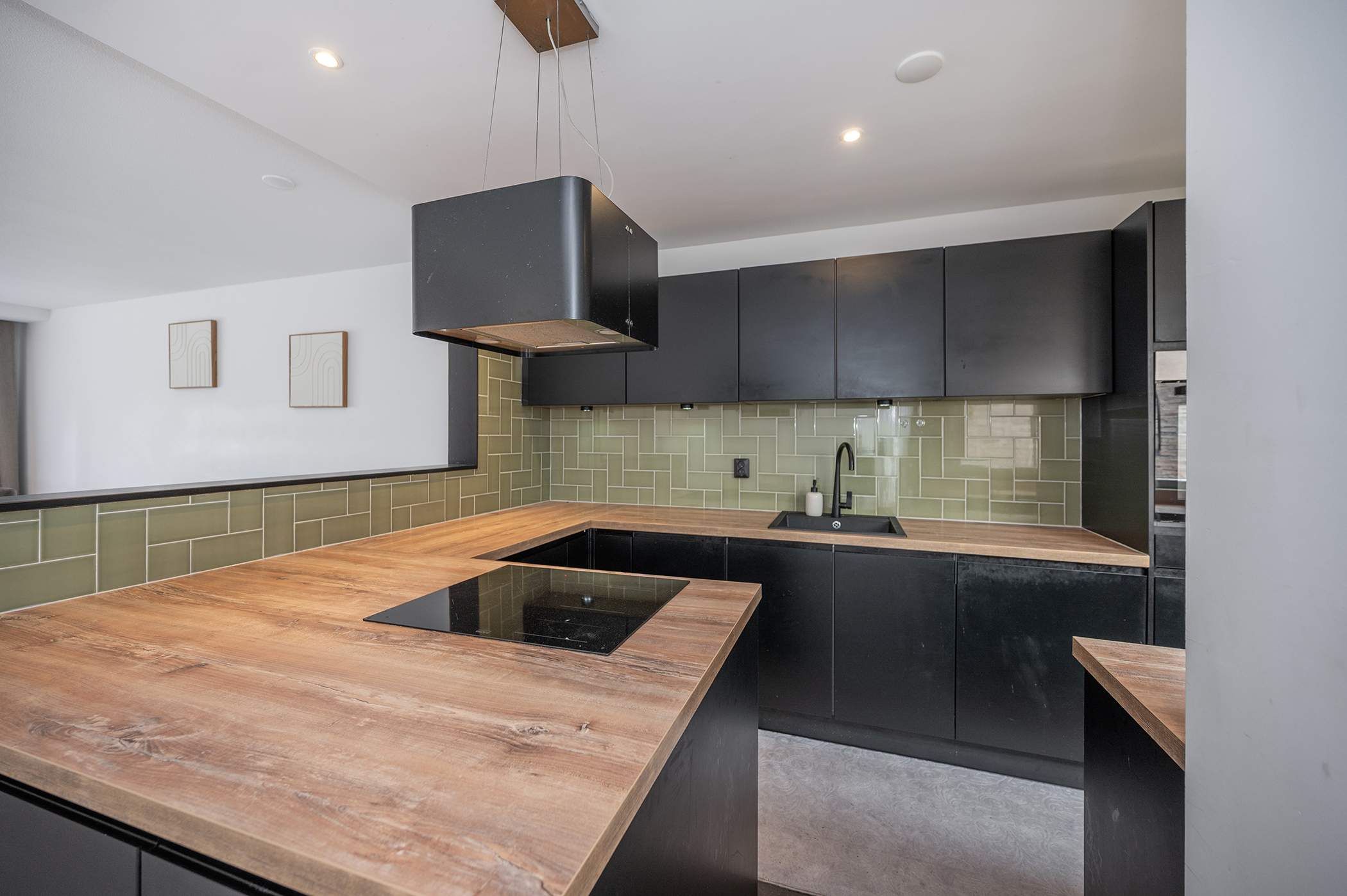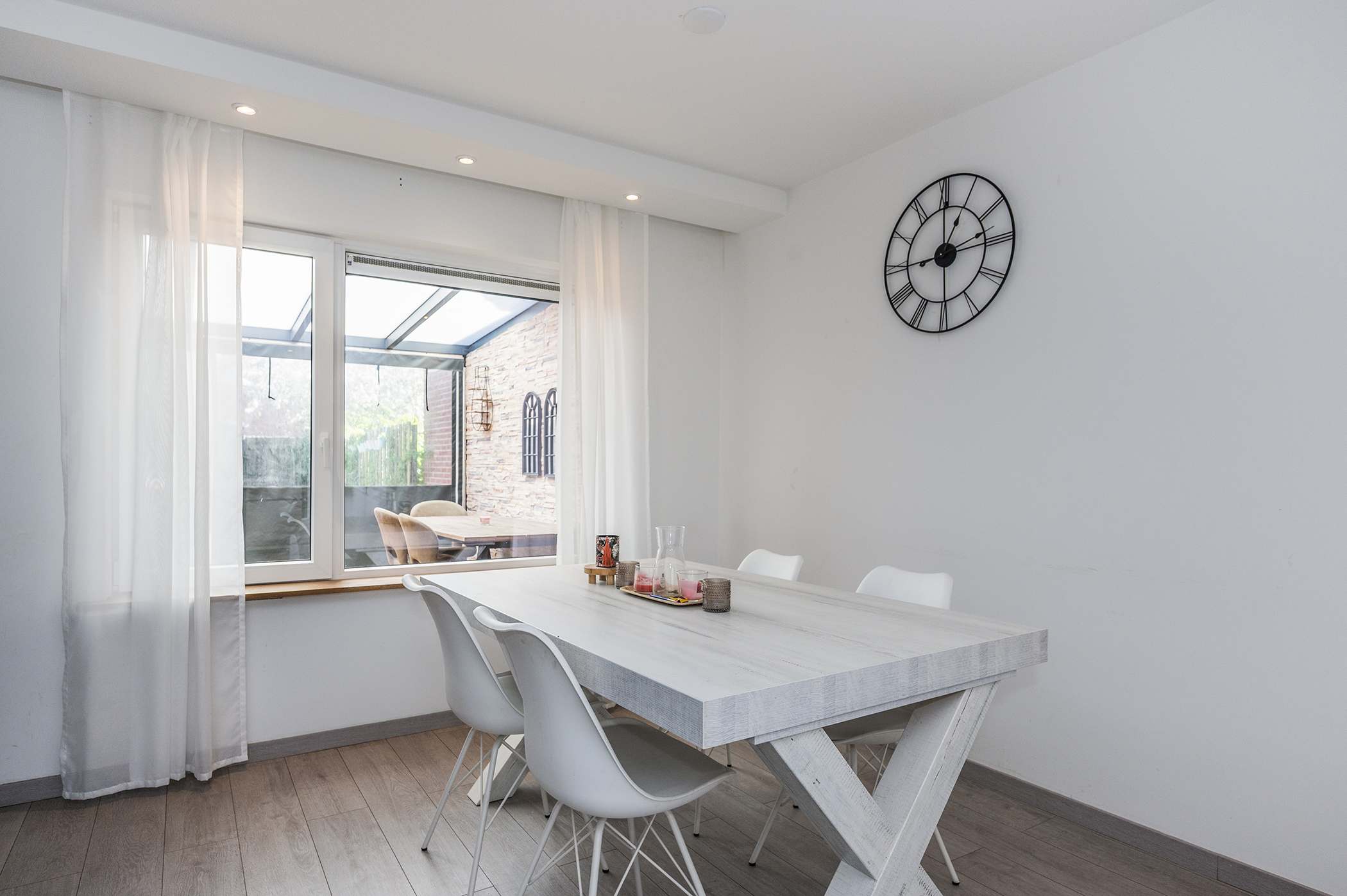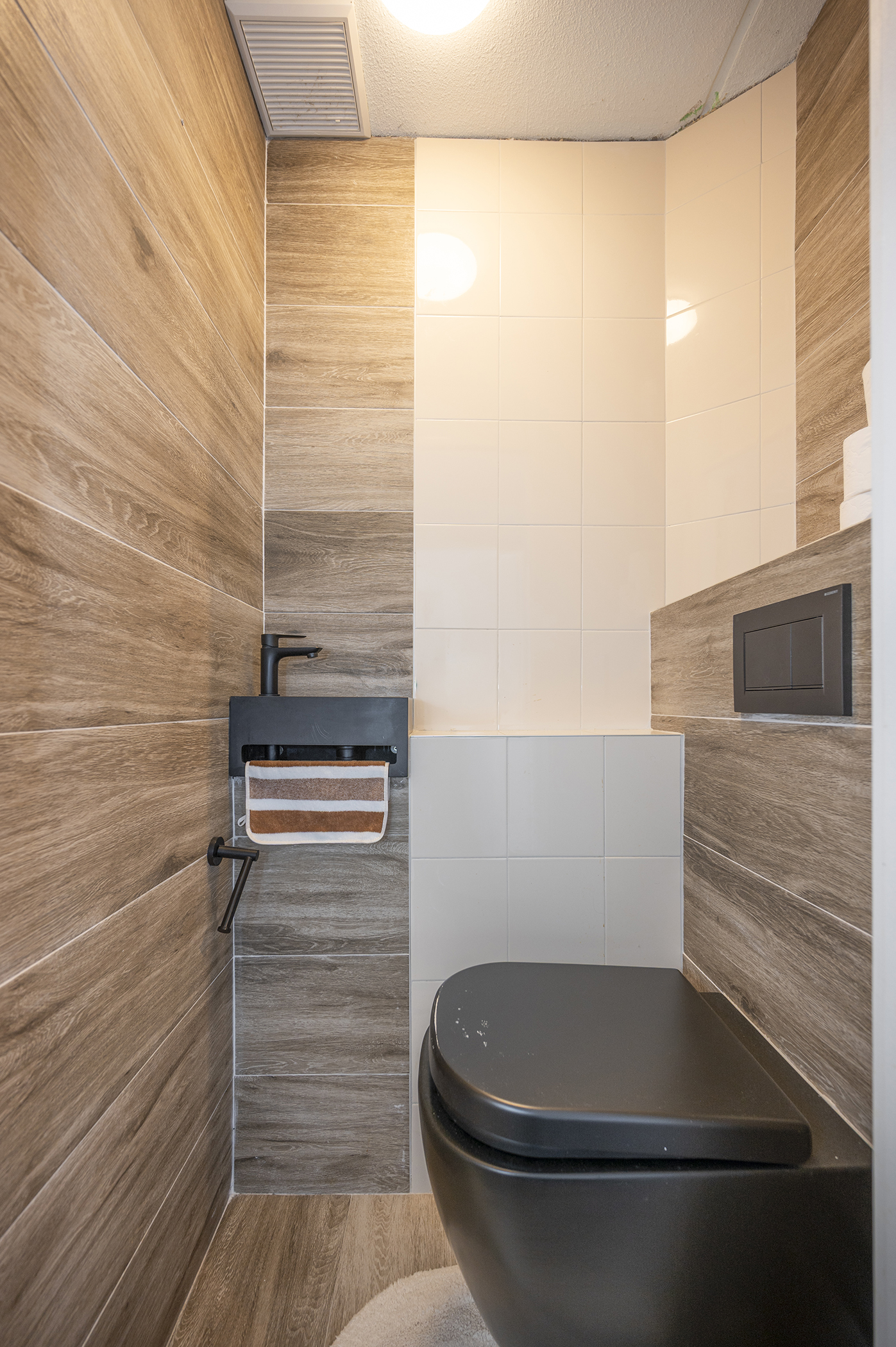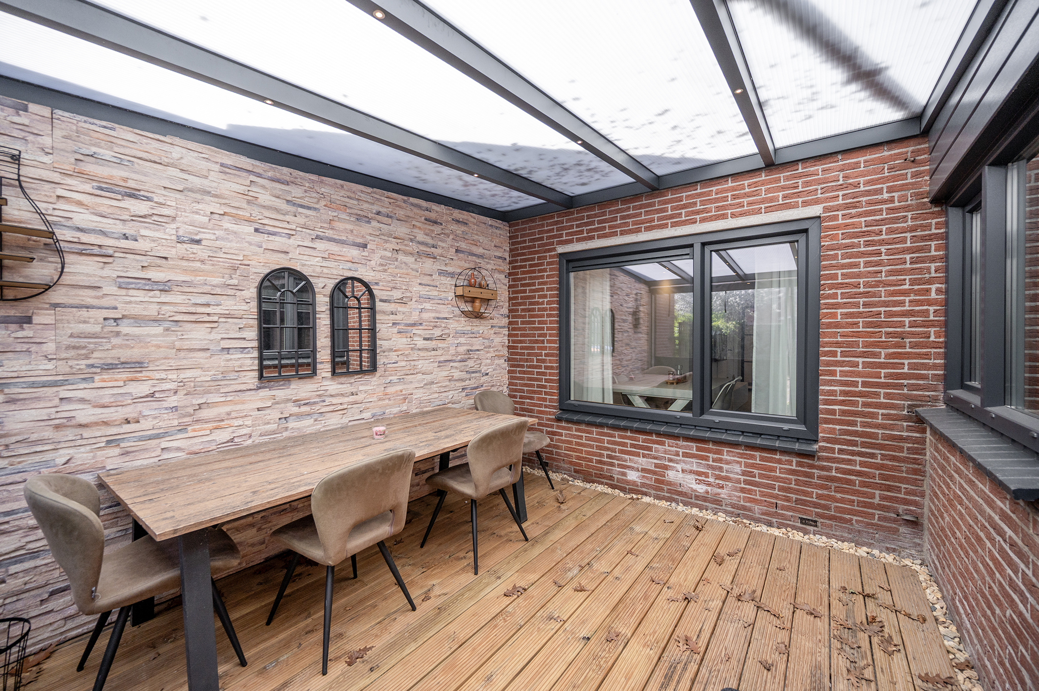 Via de verzorgde voortuin bereikt u de entree van de woning. U komt binnen in de hal, waar zich het toilet met fonteintje, de meterkast en de trapopgang naar de eerste verdieping bevinden. Vanuit de hal heeft u toegang tot de woonkamer. De woonkamer is royaal van opzet en speels ingedeeld, wat zorgt voor een dynamische en gezellige leefruimte. Dankzij de grote raampartijen geniet u hier van veel natuurlijk licht, wat de ruimte een open en uitnodigend karakter geeft. De woonkamer loopt naadloos over in de luxe woonkeuken, die is uitgevoerd in een praktische hoekopstelling. Deze keuken is voorzien van diverse moderne inbouwapparatuur en biedt volop werk- en opbergruimte, waardoor koken hier een waar plezier wordt. Aansluitend vindt u de royale bijkeuken, een zeer praktische ruimte met aansluitingen voor de wasmachine en droger. Daarnaast biedt deze ruimte extra bergruimte, ideaal voor het opbergen van voorraden en huishoudelijke spullen.