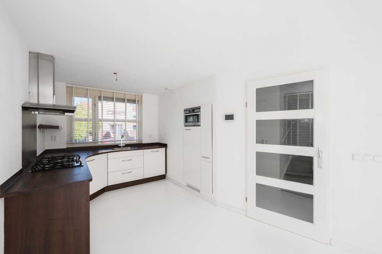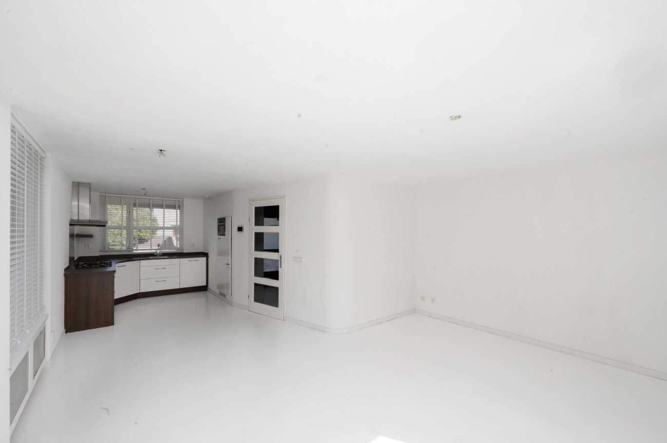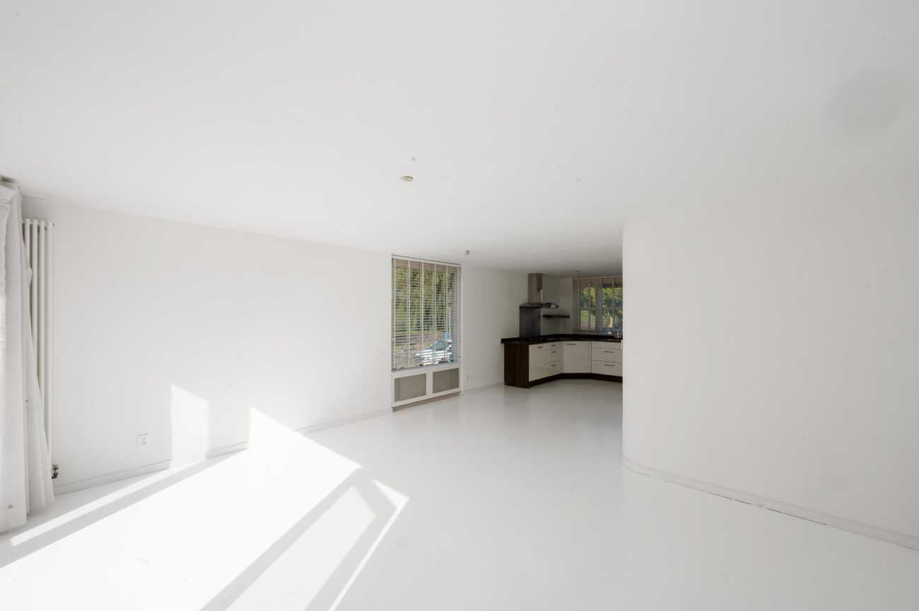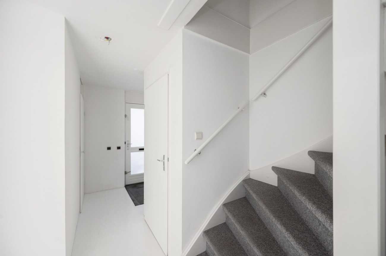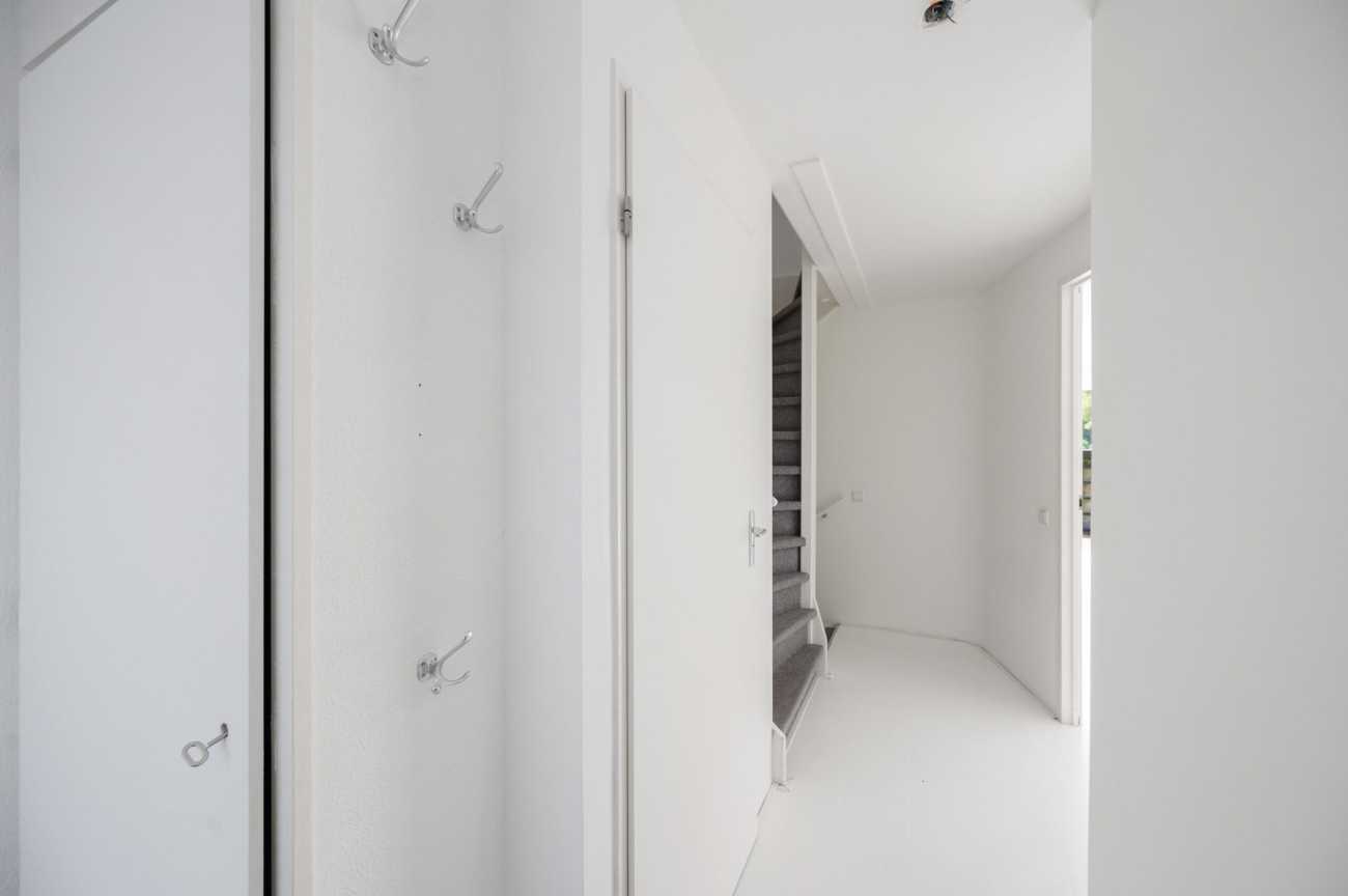 Via een brede betonnen trap bereikt u de entree van de woning. De hal biedt toegang tot de meterkast, een modern toilet met hangend closet en fonteintje, de trap naar de eerste verdieping en de trap naar de inpandige studio. Vanuit de hal bereikt u de ruime, tuingerichte woonkamer, voorzien van een extra zijraam dat vrij uitzicht biedt, en een deur naar de zonnige achtertuin. De keuken, gelegen aan de voorzijde van de woning, is uitgevoerd in neutrale tinten en voorzien van diverse inbouwapparatuur, waaronder een afzuigkap, gaskookplaat, oven, vaatwasser en koelkast. De woonkamer is speels ingedeeld en biedt verschillende mogelijkheden voor inrichting. De vloer is voorzien van een nette laminaatvloer en de wanden zijn strak afgewerkt.