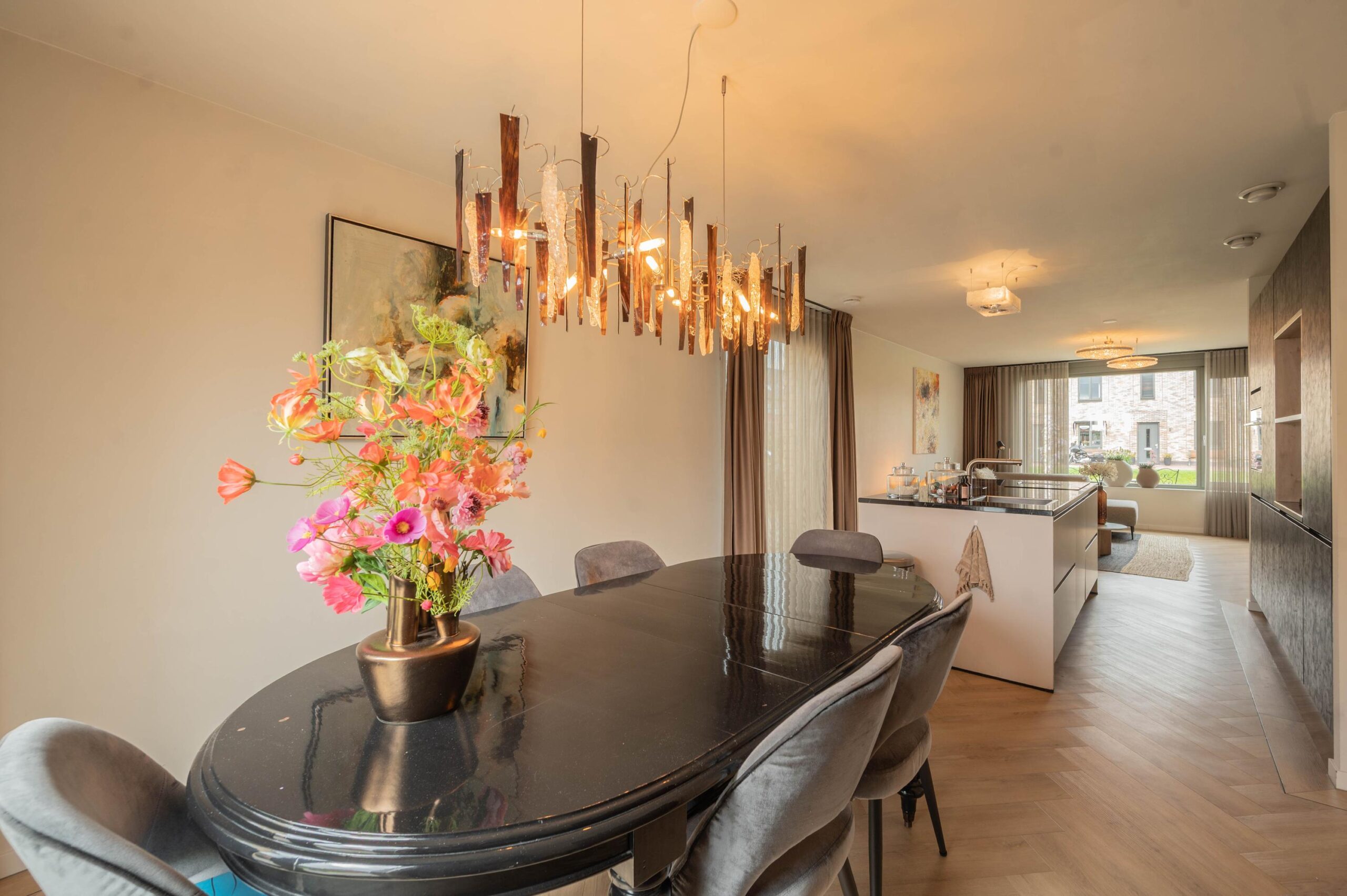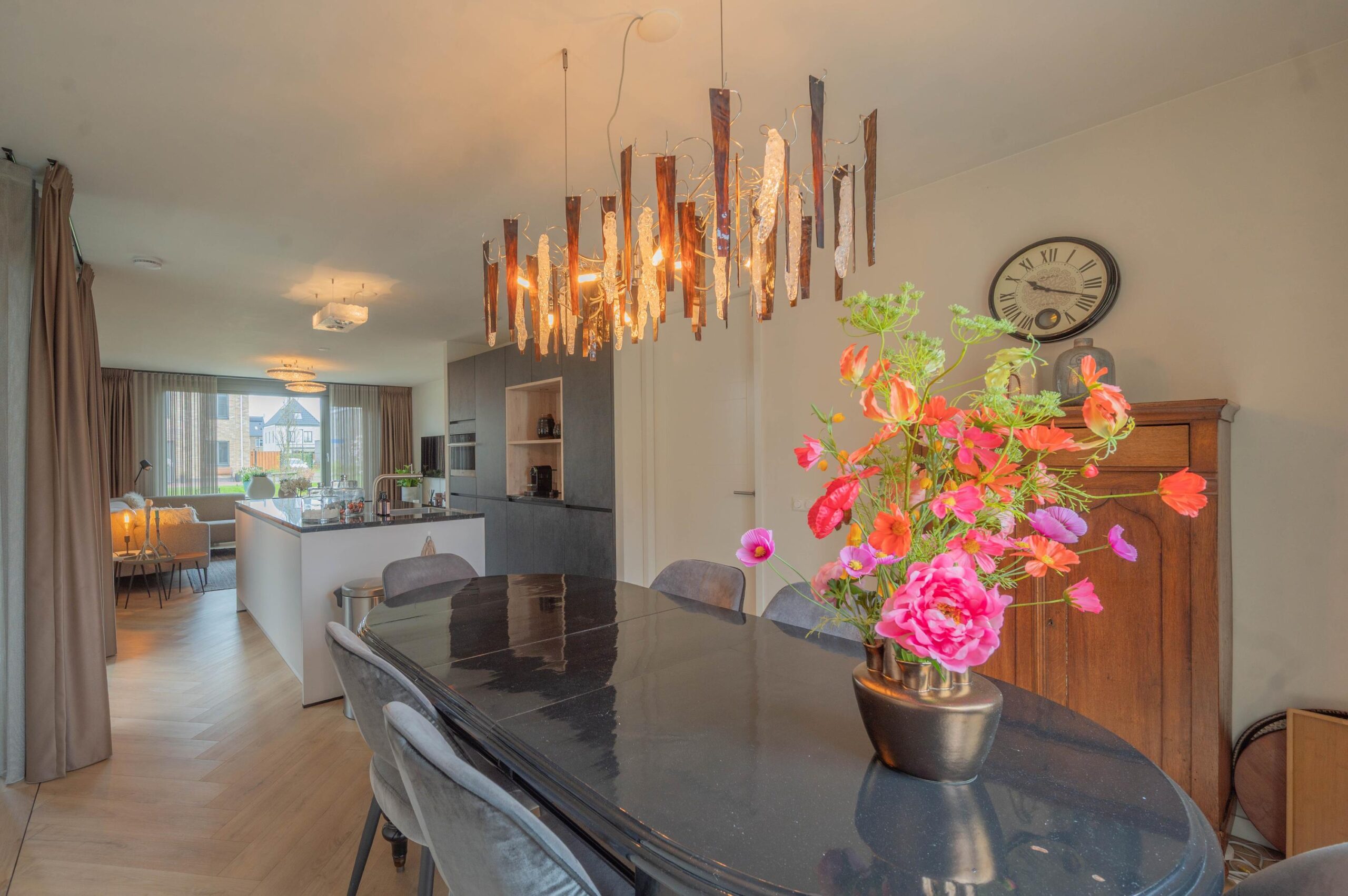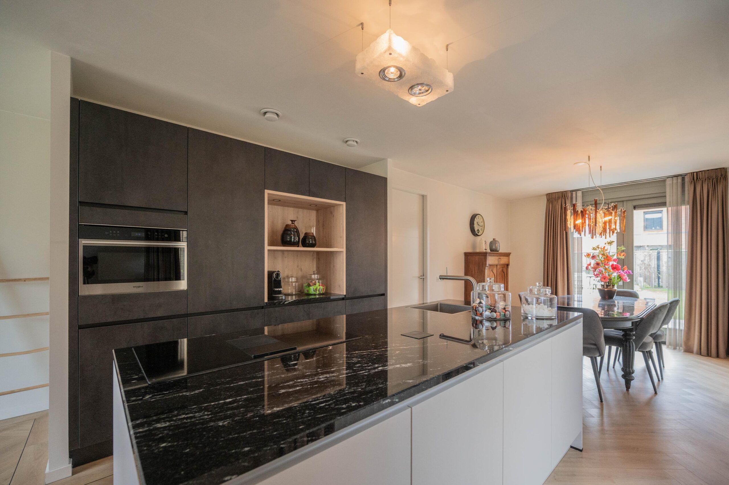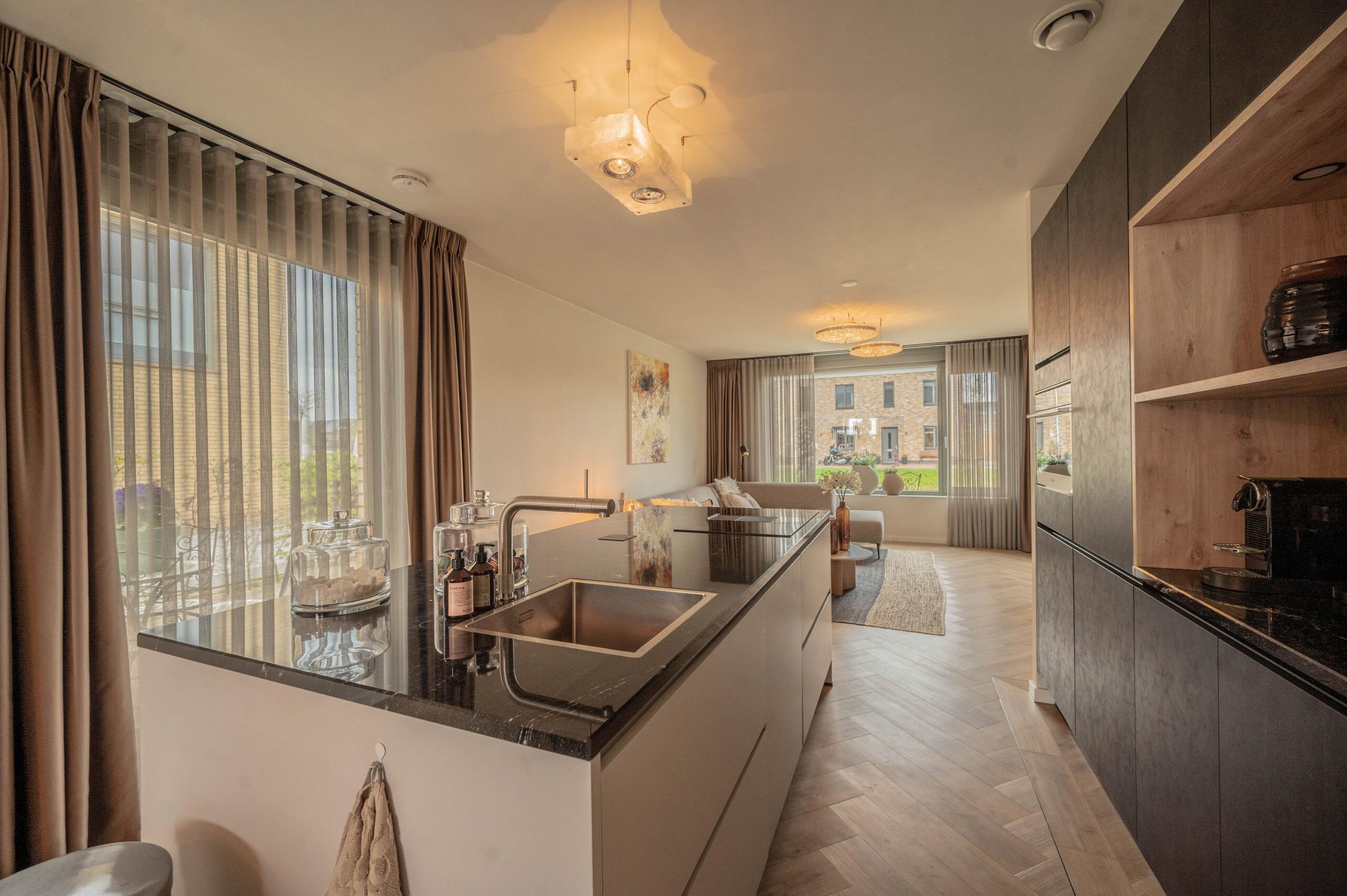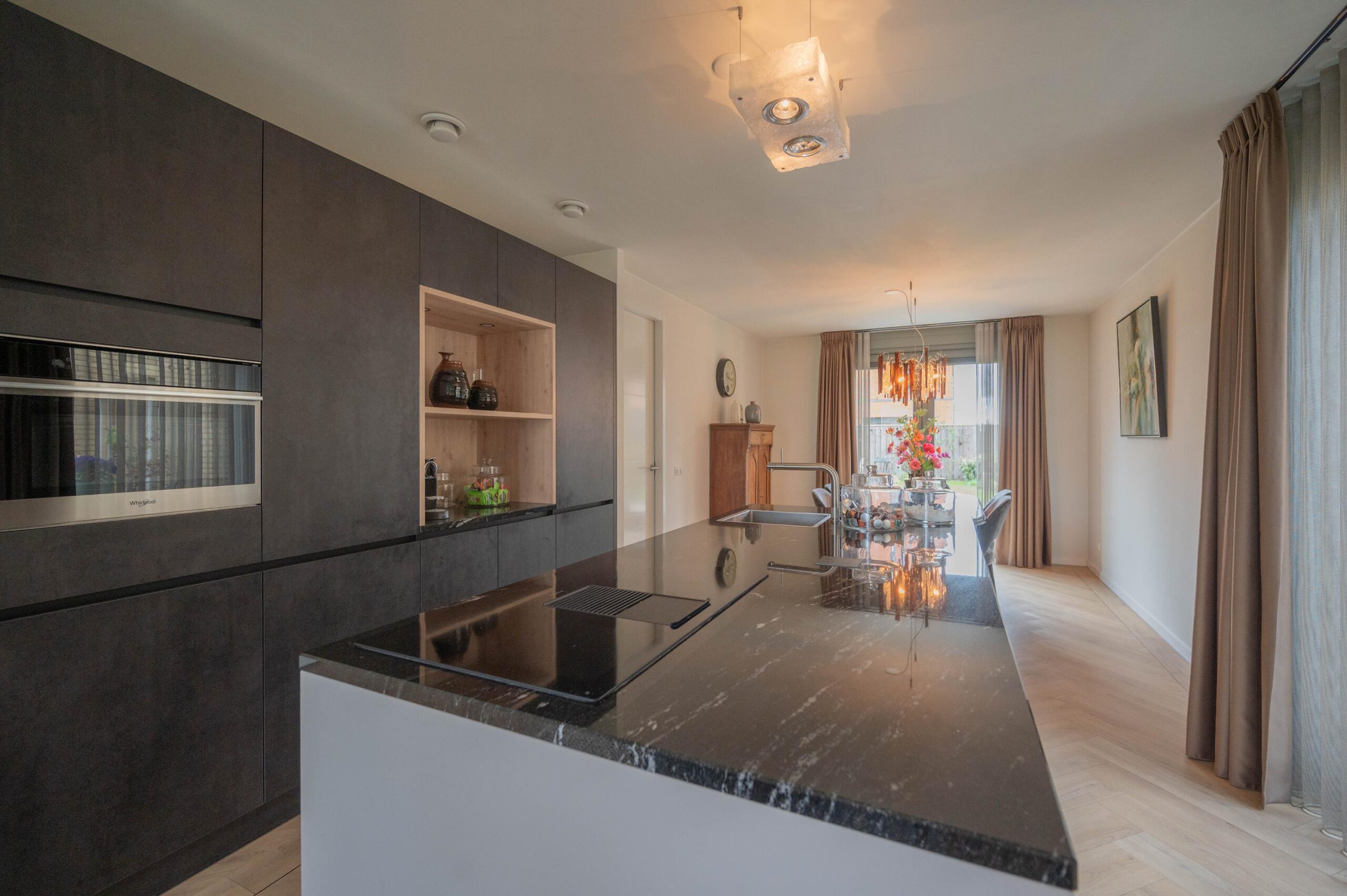 Centraal in de woonkamer bevindt zich een stijlvol kookeiland, dat het hart van de woning vormt. De luxe keuken is voorzien van diverse inbouwapparatuur, waaronder een oven, koelkast met vriezer, vaatwasser en een inductiekookplaat met geïntegreerd afzuigsysteem.