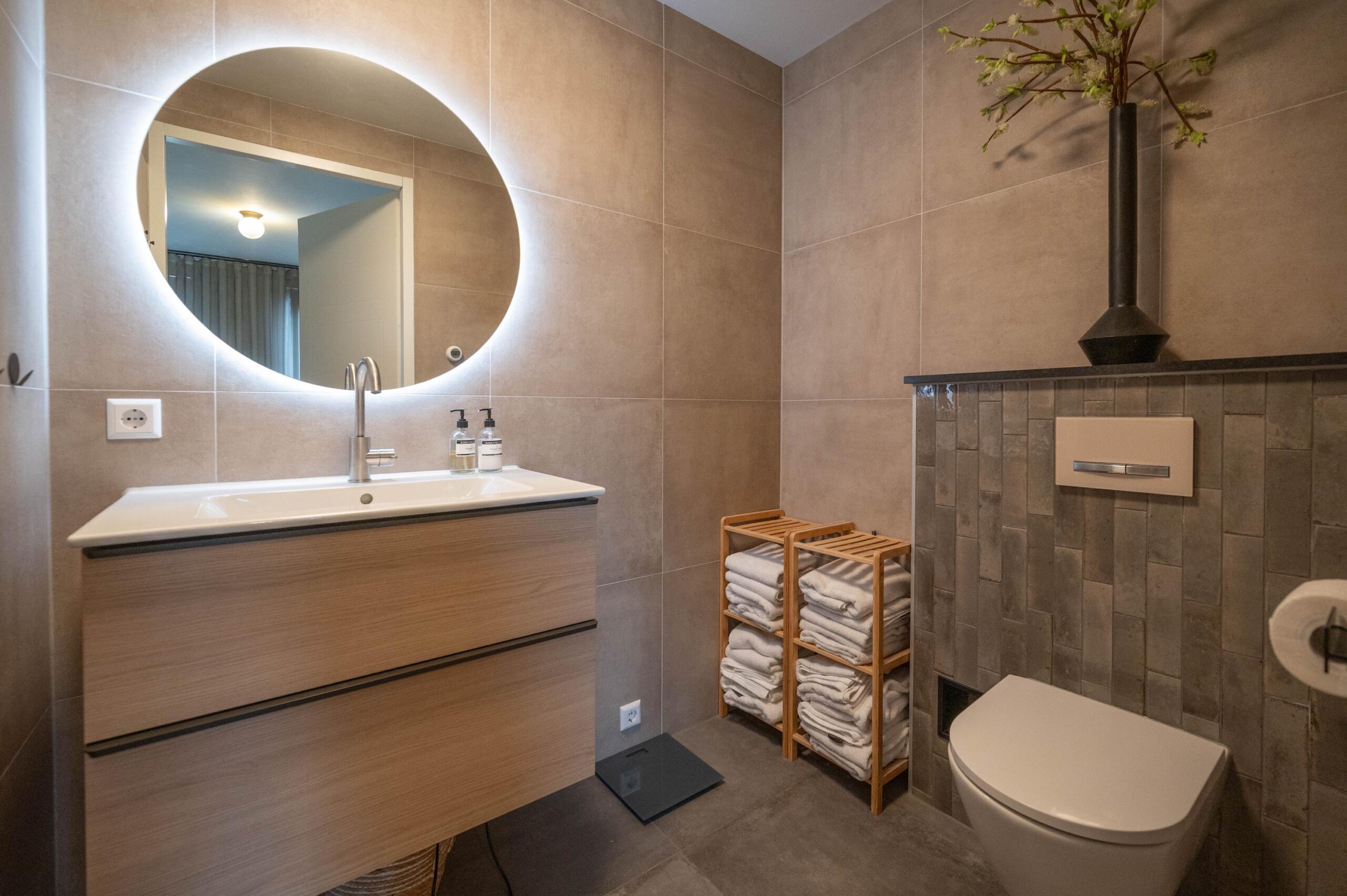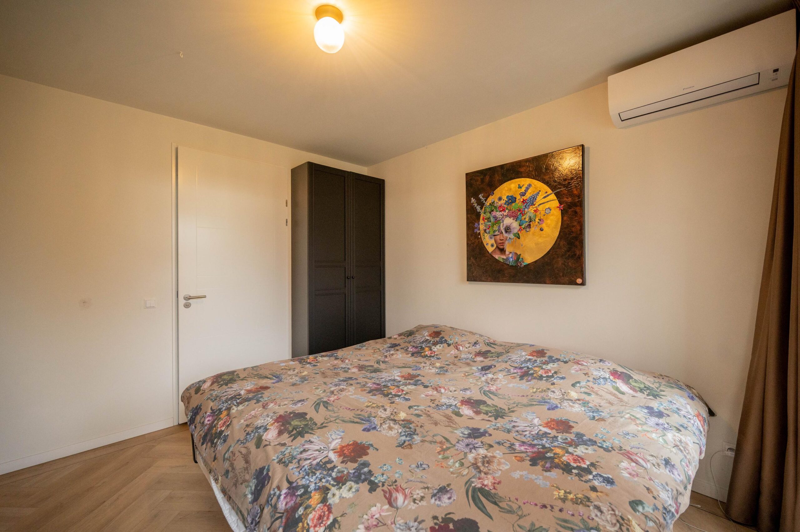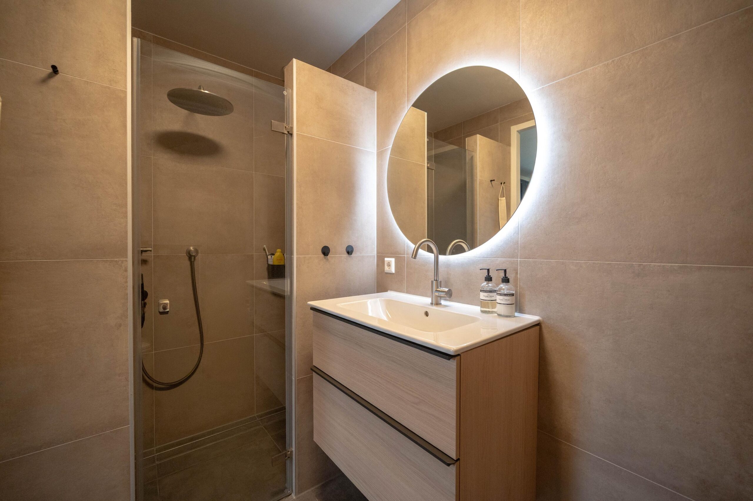 Achter in de woonkamer bevindt zich een deur naar de slaapkamer op de begane grond. Deze slaapkamer beschikt over een en-suite badkamer, uitgerust met een inloopdouche, handdoekenradiator, wastafelmeubel en een toilet. Tevens is deze slaapkamer voorzien van airconditioning.