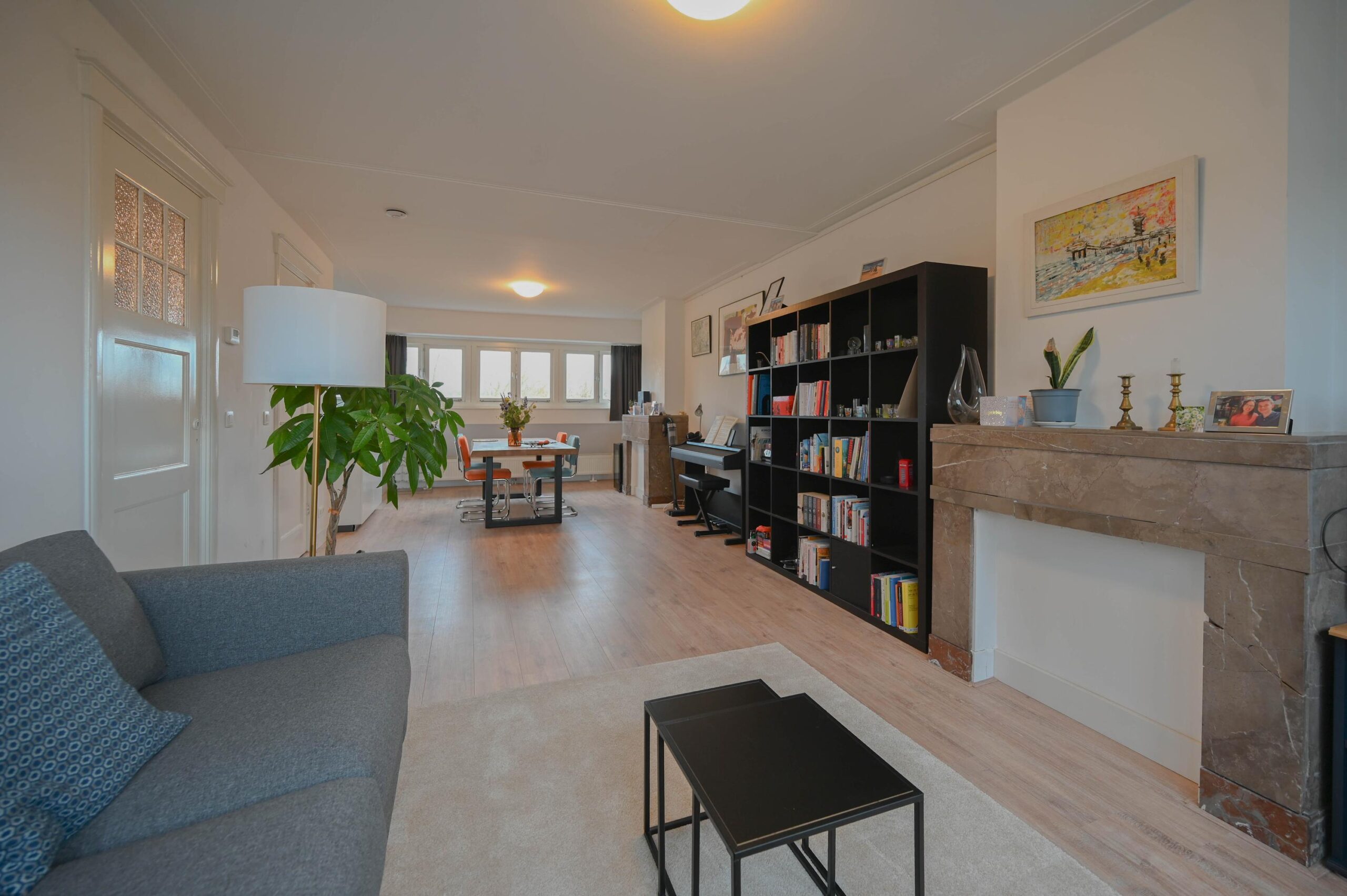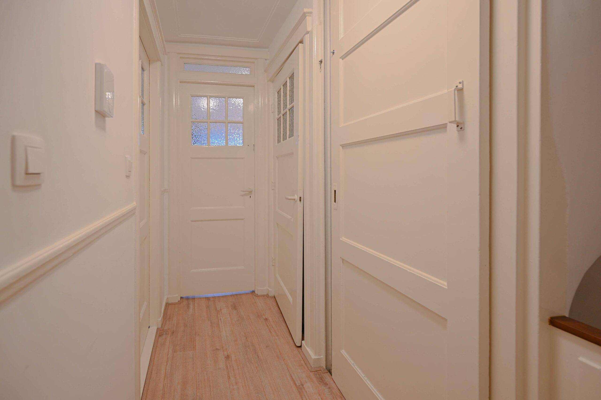 Via de overloop heeft u toegang naar de riante woonkamer, keuken, toilet en werkkamer. De woonkamer heeft 2 originele marmeren schouwen en karakteristieke kozijnen met een mooie lichtinval. De open keuken heeft een antraciet kleurstelling, een houten keukenblad en diverse inbouwapparatuur waaronder 4 pits gasfornuis met afzuigkap, koel- en vriescombinatie, oven en vaatwasser. Daarnaast is er voldoende bergruimte aanwezig. Aan de voorzijde van de woning vind u de werkkamer. De hele verdieping is voorzien van een nette laminaatvloer.