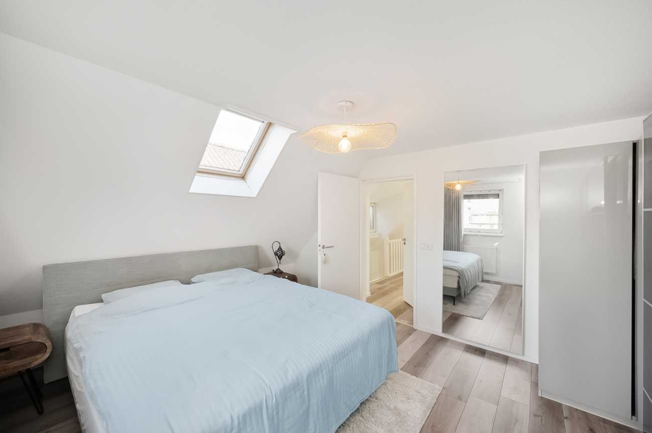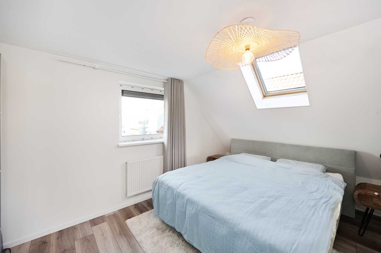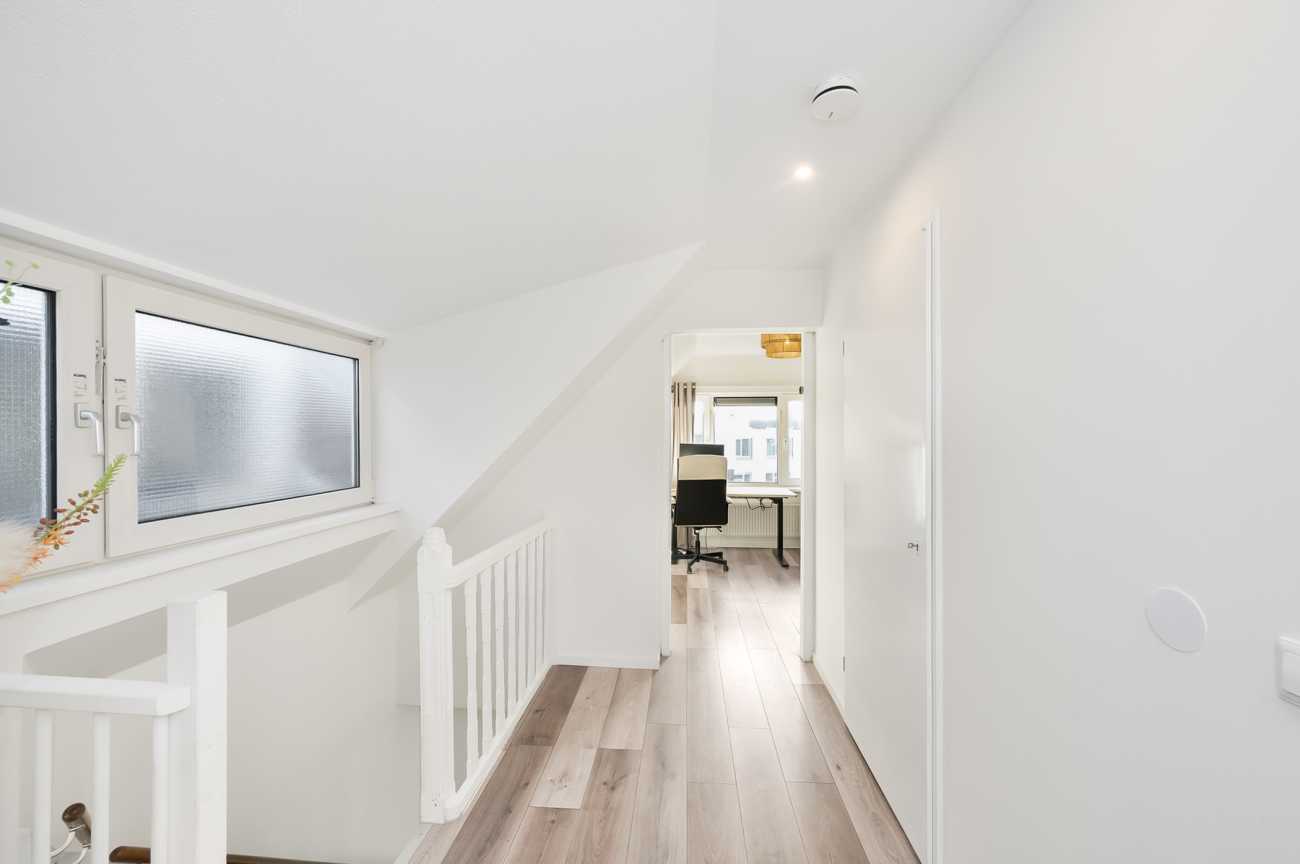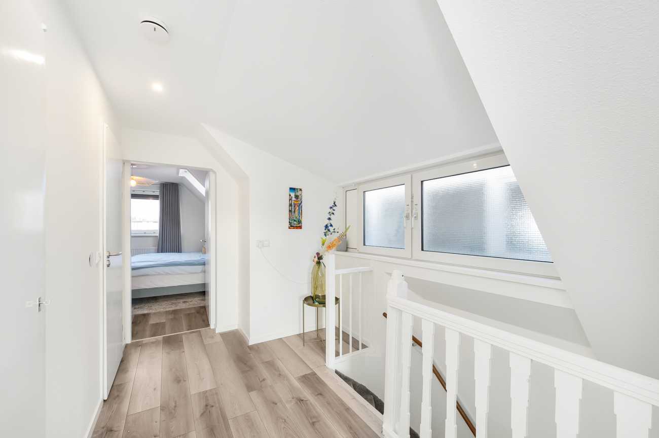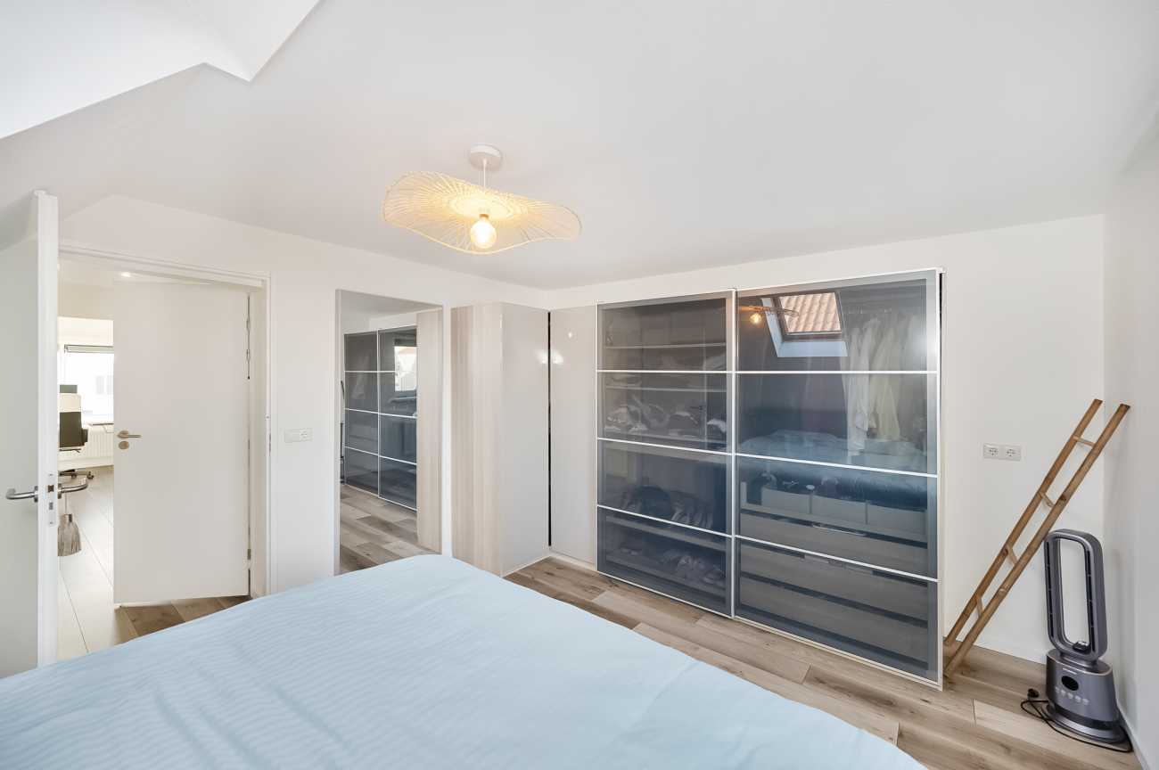 Ruime overloop met toegang tot alle vertrekken. Aan de achterzijde is de grootste slaapkamer van ca. 18.5 m2. De tweede slaapkamer heeft ook een goed formaat, namelijk ca. 15 m2. Tussen de slaapkamers is de moderne badkamer voorzien van een inloopdouche, wastafelmeubel en een zwevend toilet. Daarnaast is er ook een ruime inpandige berging met de wasmachineaansluiting.