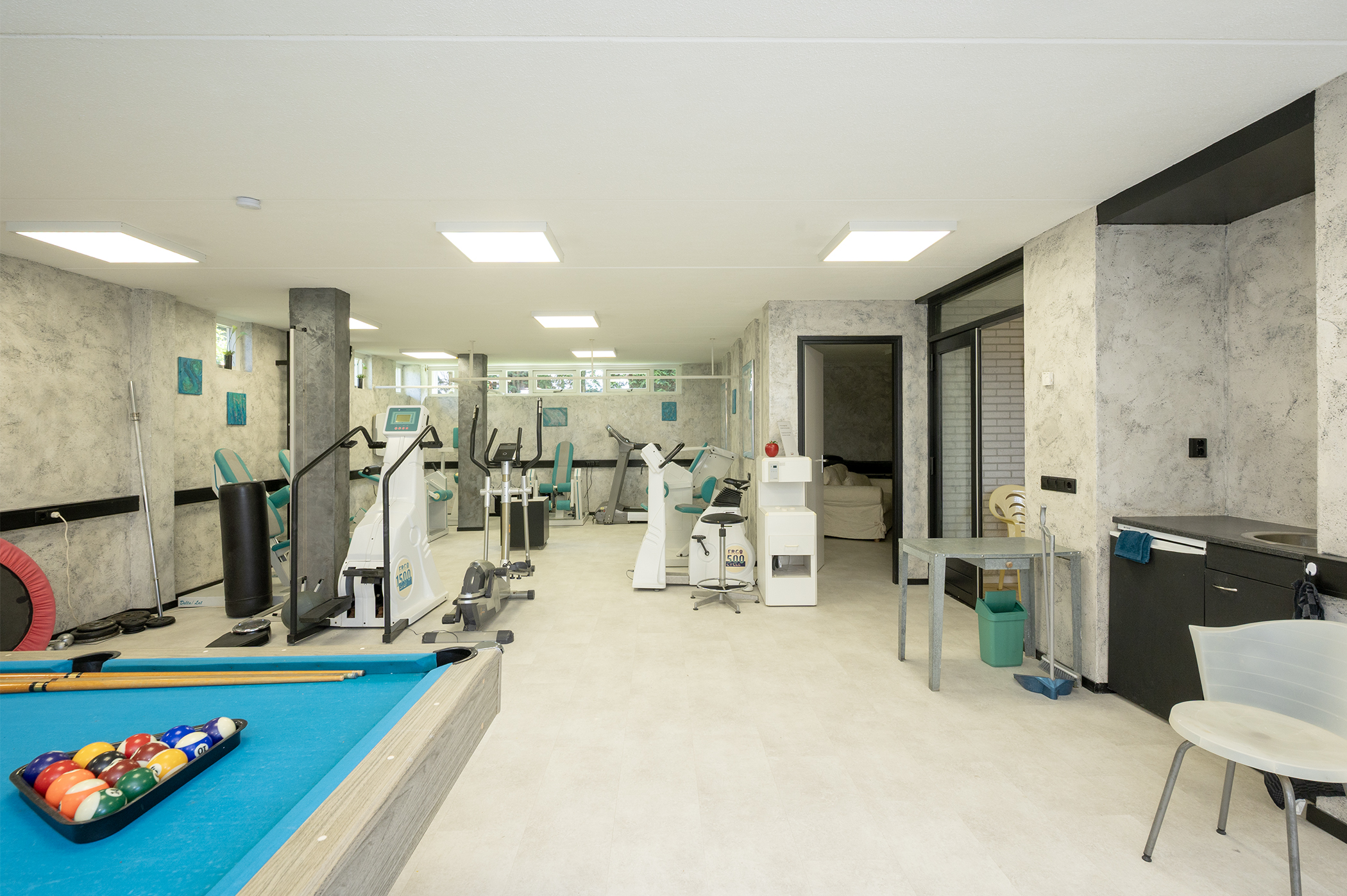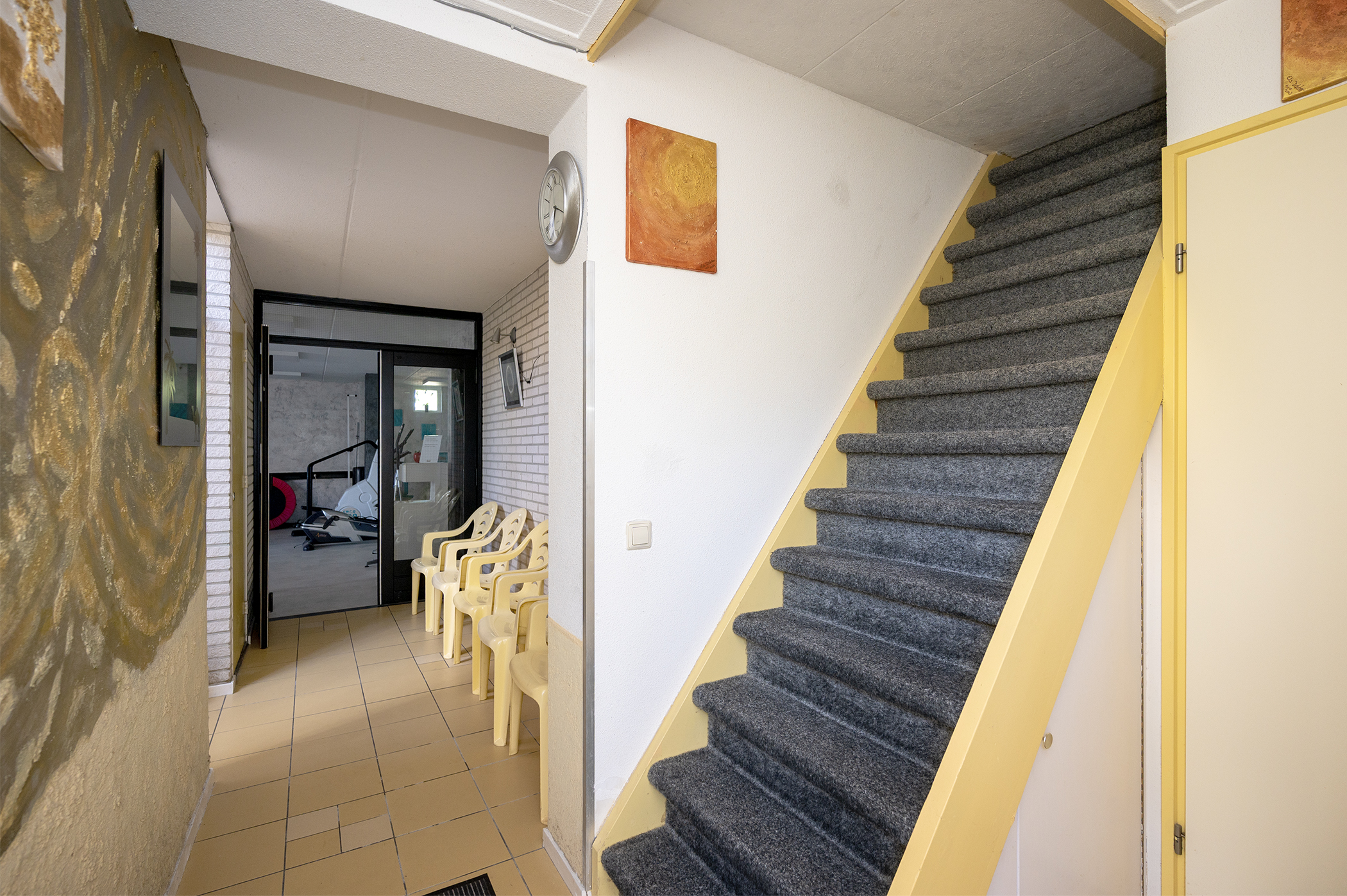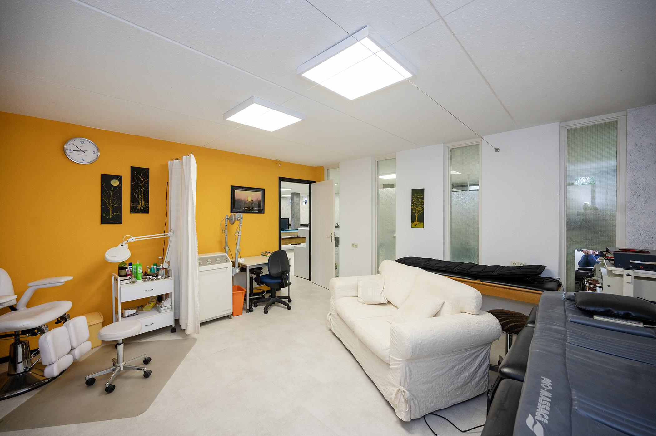 De ruimte is in gebruik geweest als Fysiopraktijk en is voorzien van een behandelkamer, work-out ruimte, kleedkamers met douches, sauna en zonnebank. Er is een apart toilet.