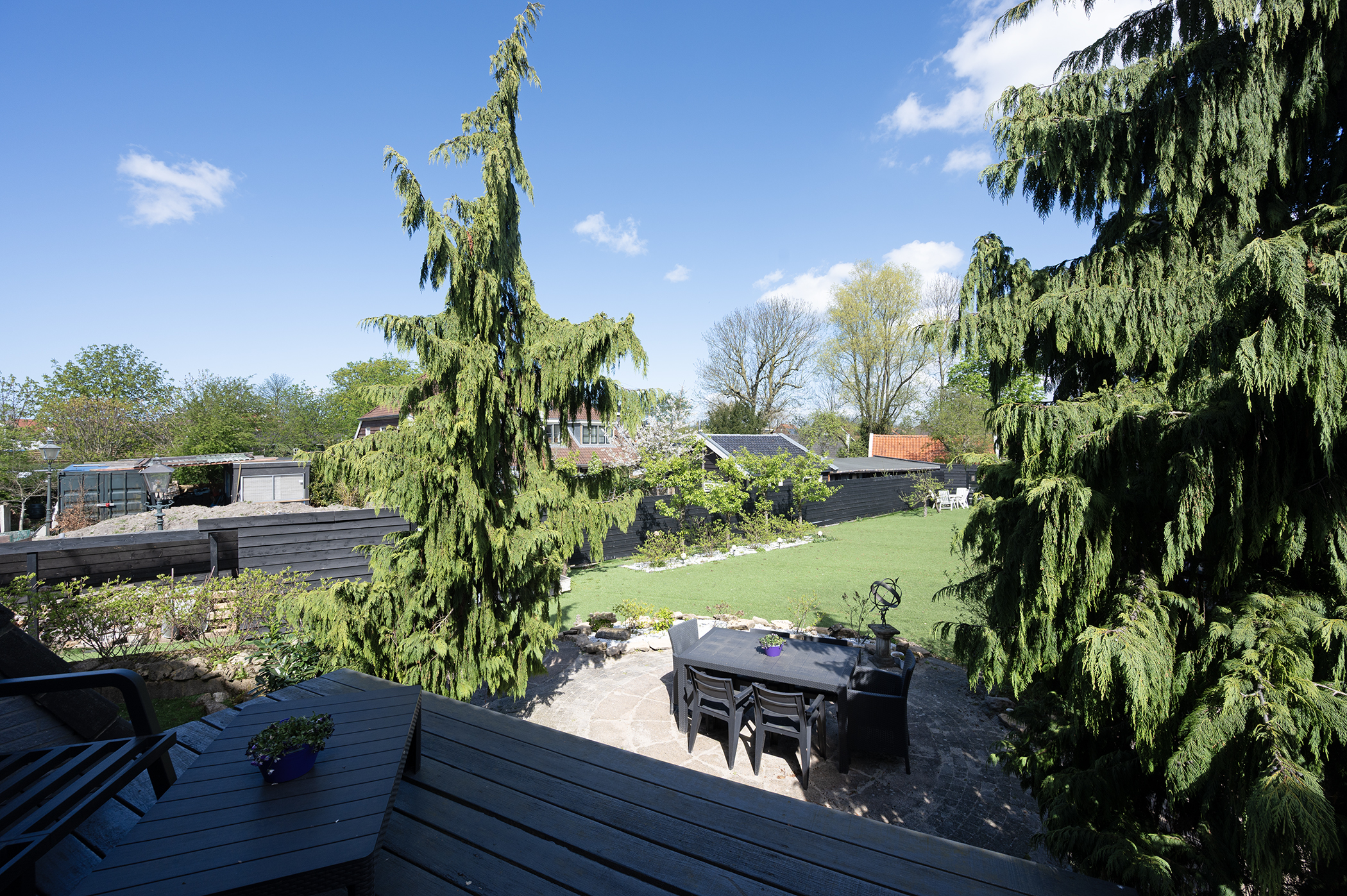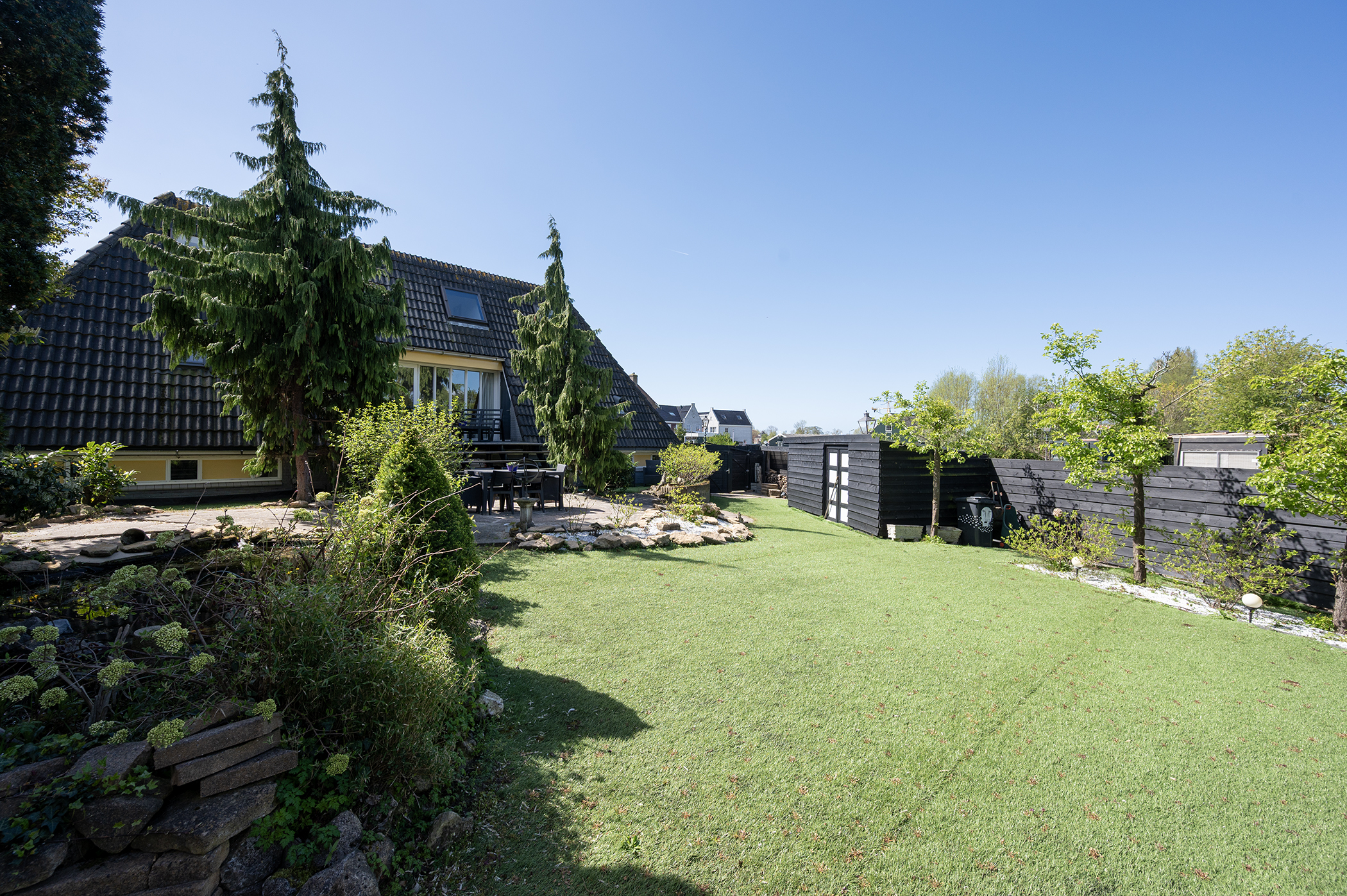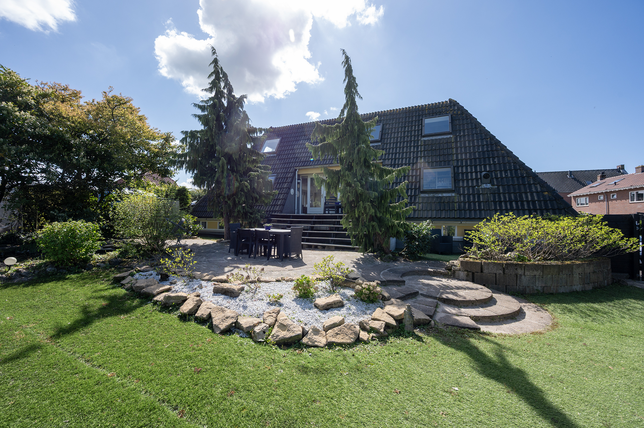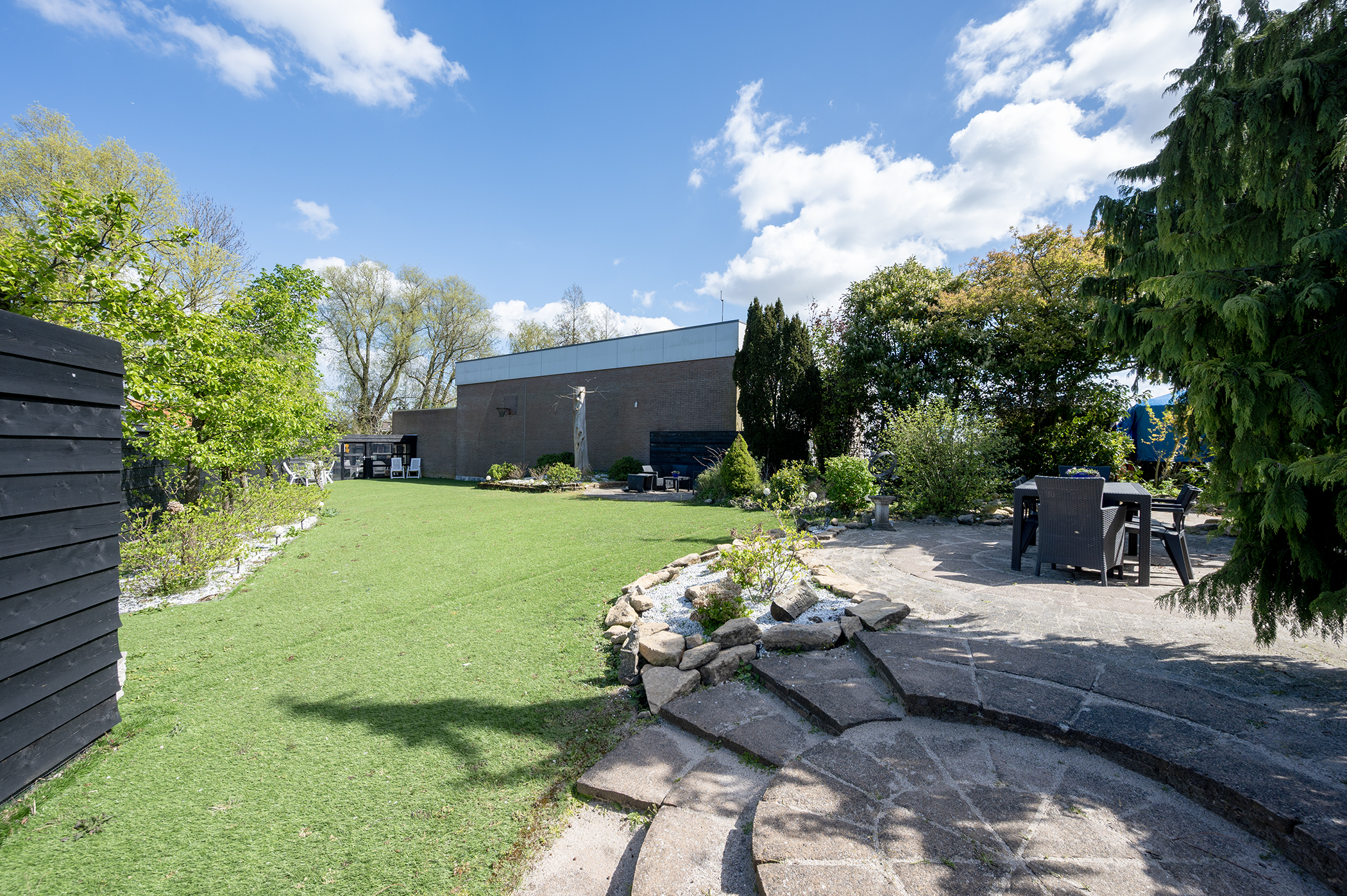 Grote, fraai aangelegde achtertuin met vijver, meerdere terrassen, overkapping en tuinberging