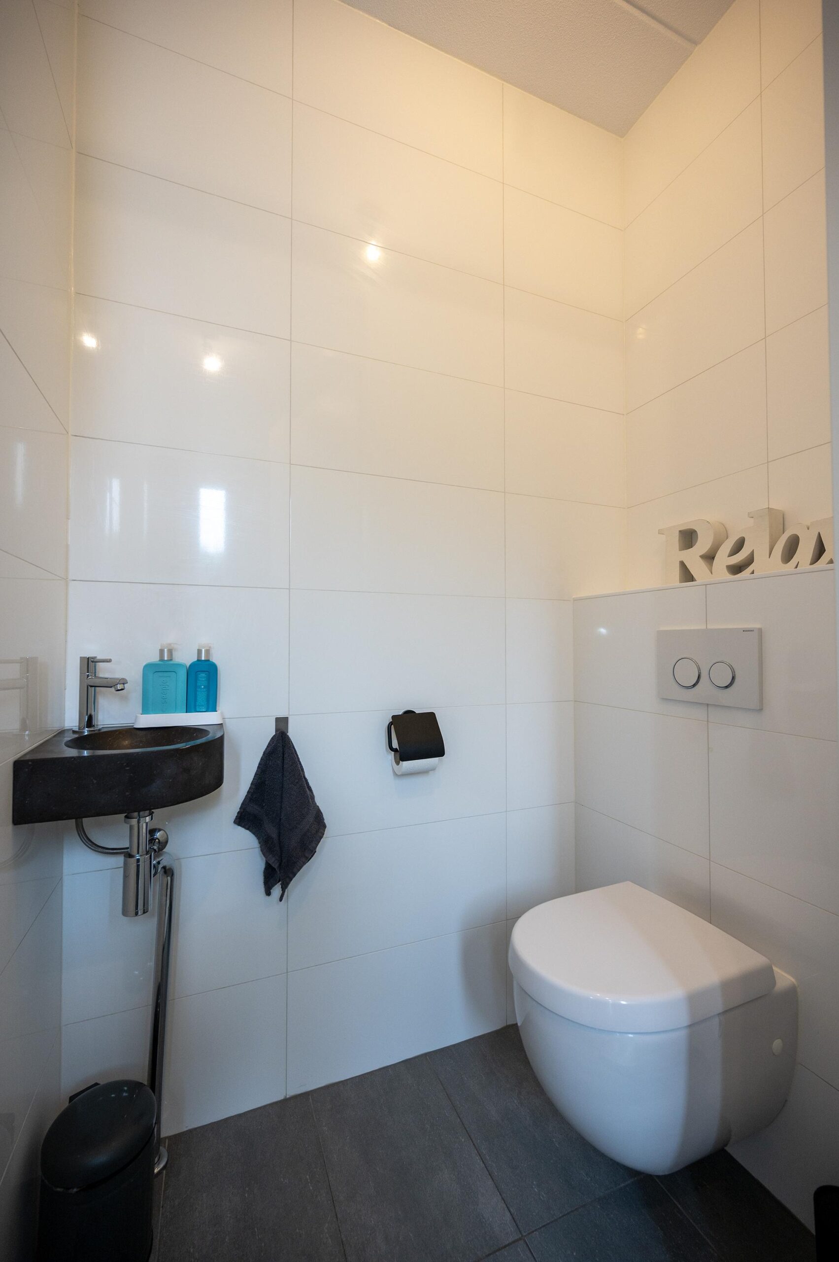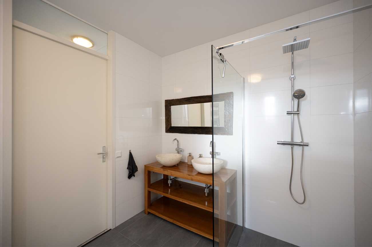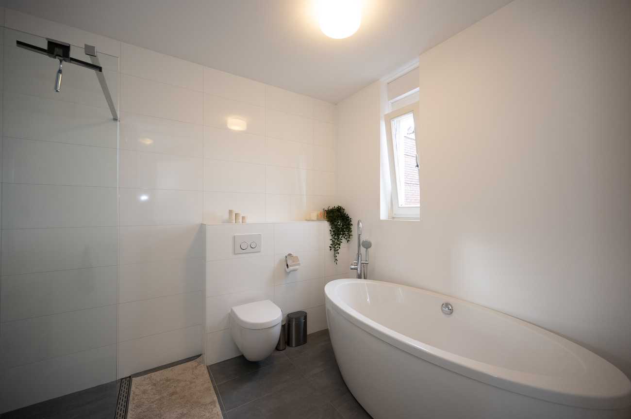 Tweede verdieping: Overloop met toegang tot de slaapkamer, voorzien van een tweepersoonsbed en kledingkast. De moderne badkamer is voorzien van een inloopdouche, ligbad, tweede toilet en badkamermeubel.
